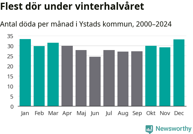 Så är det även i Ystad. Under de senaste 25 åren har 4 583 personer dött i kommunen under vinterhalvåret, jämfört med 4 036 personer under sommarhalvåret – alltså 14 procent fler.
