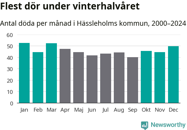 Så är det även i Hässleholm. Under de senaste 25 åren har 7 120 personer dött i kommunen under vinterhalvåret, jämfört med 6 384 personer under sommarhalvåret – alltså tolv procent fler.