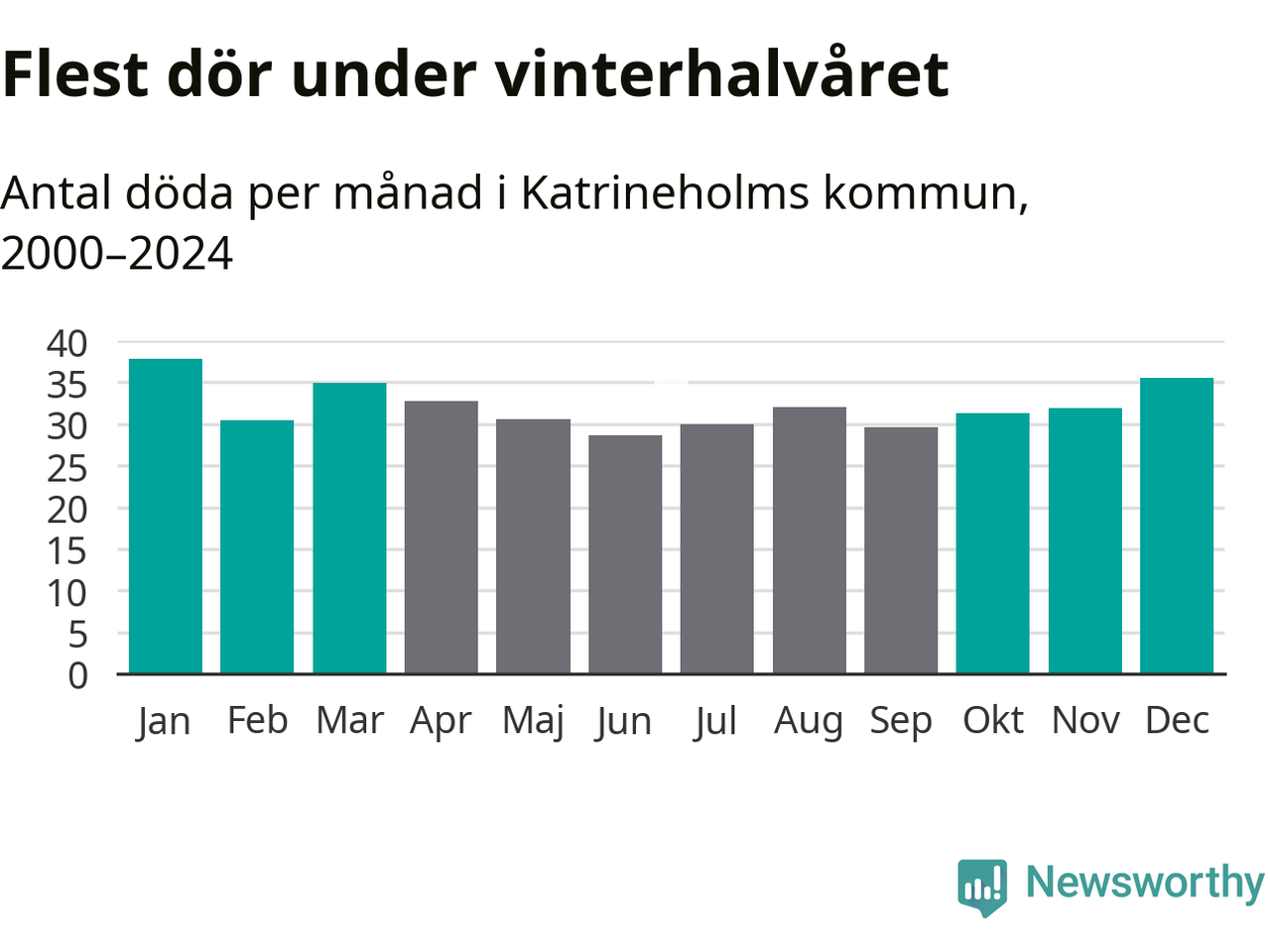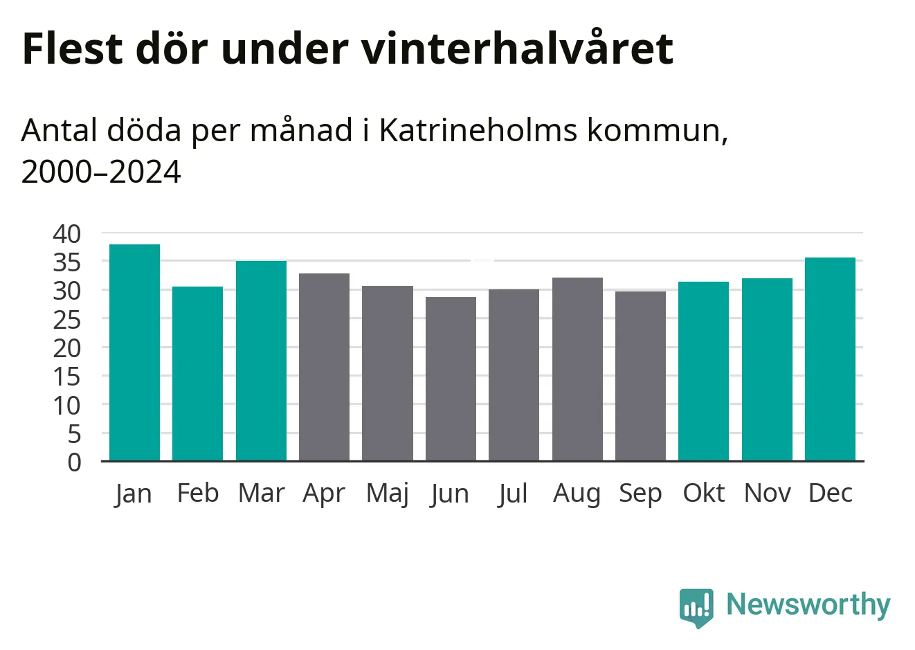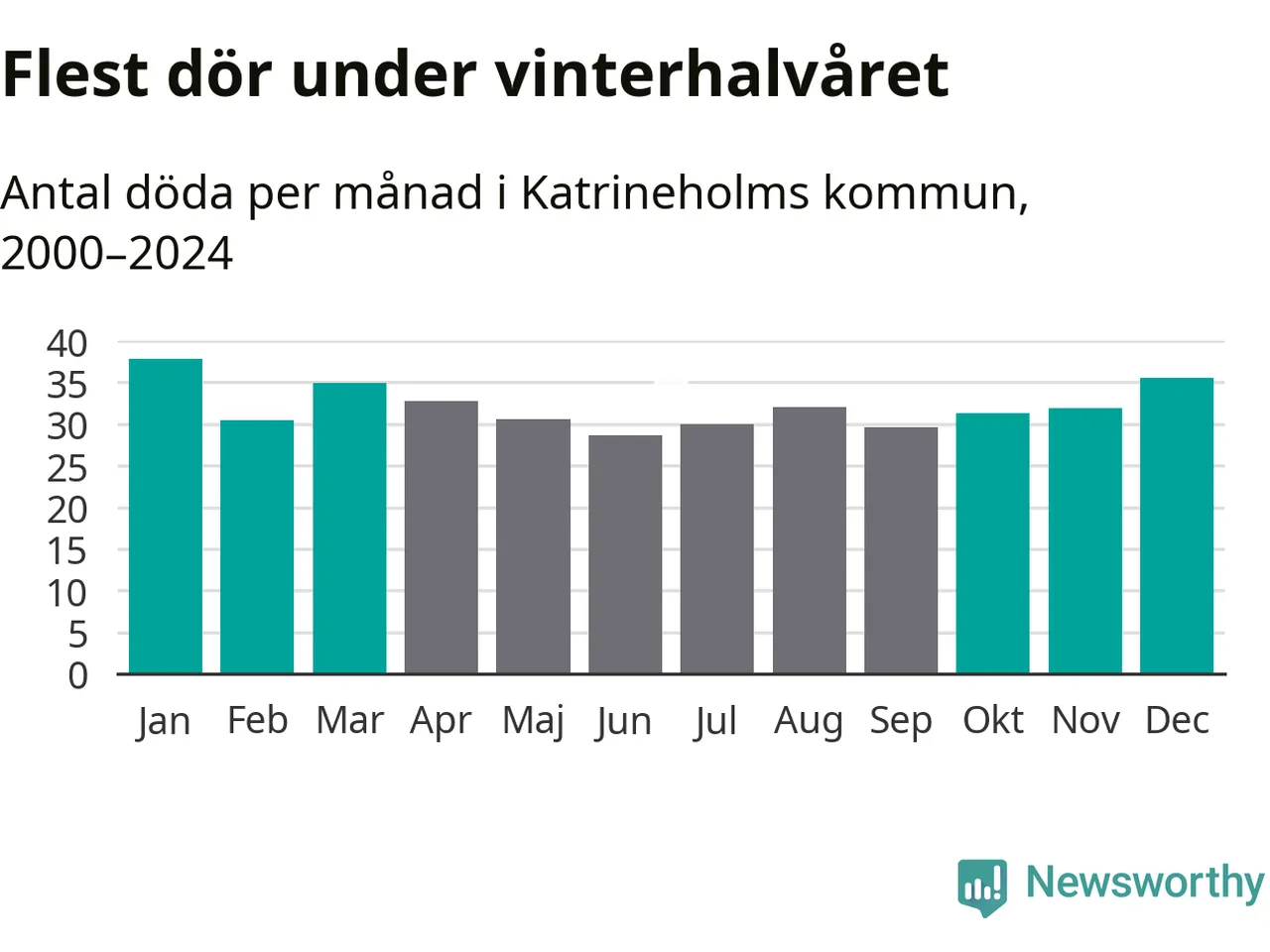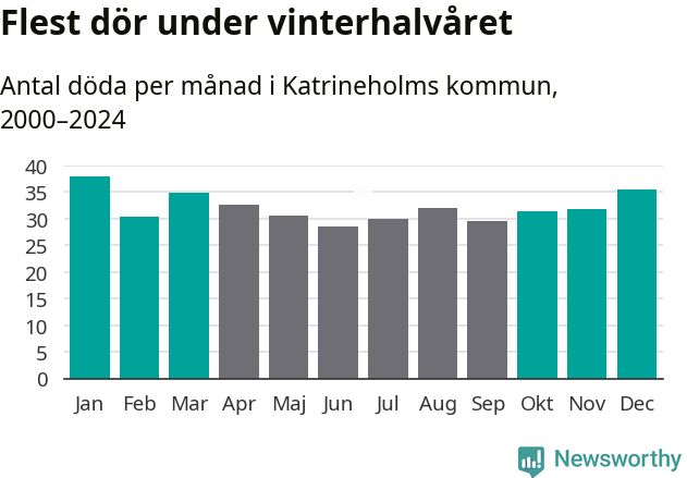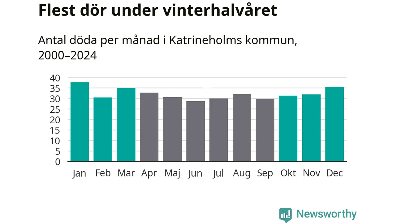 Så är det även i Katrineholm. Under de senaste 25 åren har 5 043 personer dött i kommunen under vinterhalvåret, jämfört med 4 514 personer under sommarhalvåret – alltså tolv procent fler.