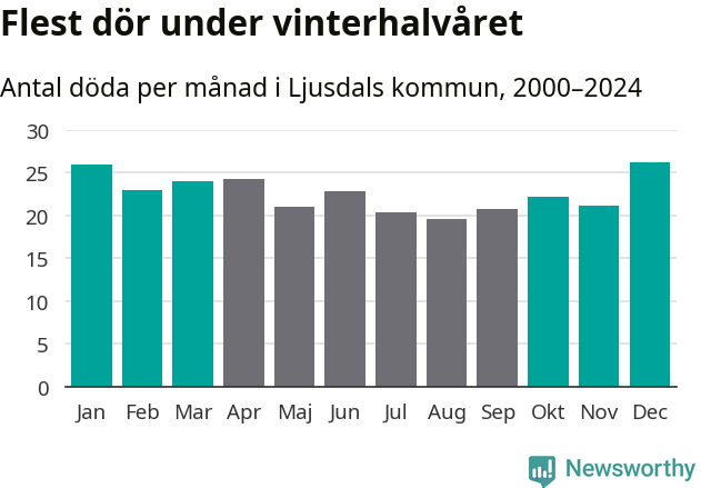 Så är det även i Ljusdal. Under de senaste 25 åren har 3 571 personer dött i kommunen under vinterhalvåret, jämfört med 3 135 personer under sommarhalvåret – alltså 14 procent fler.