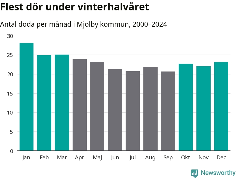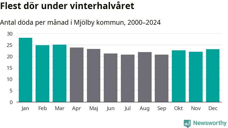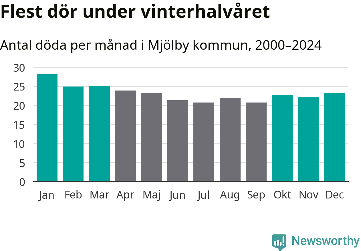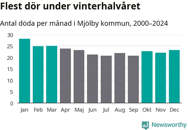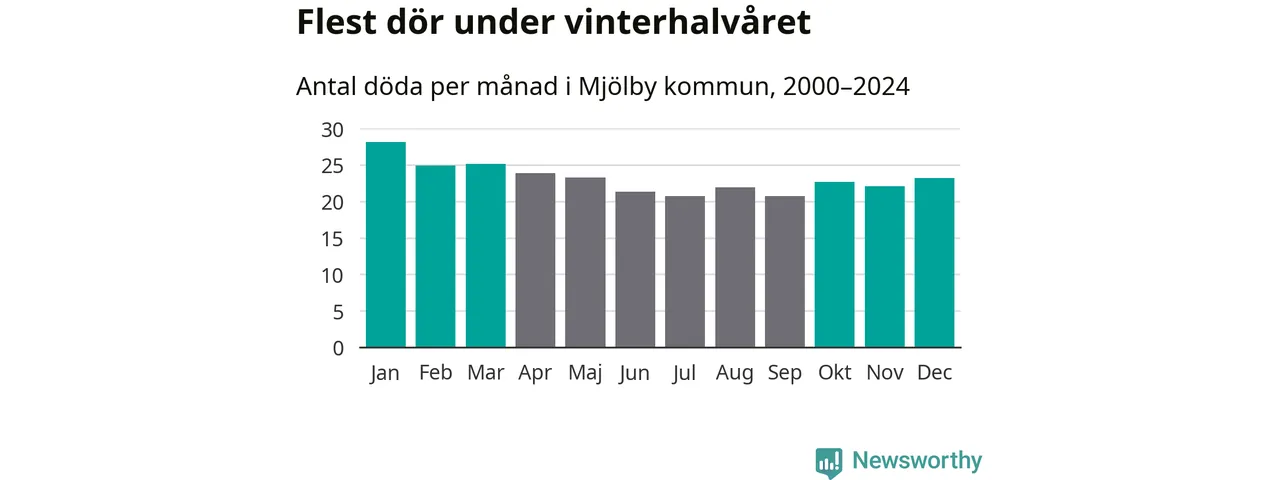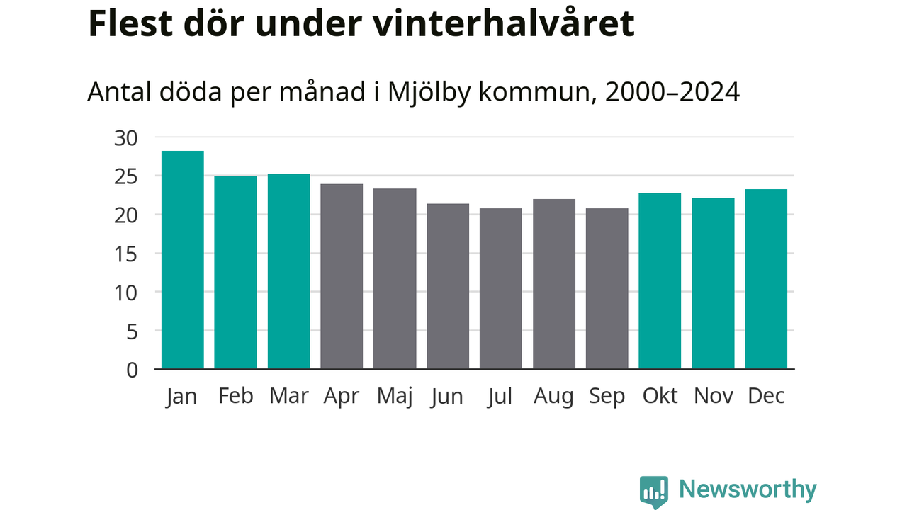 Så är det även i Mjölby. Under de senaste 25 åren har 3 624 personer dött i kommunen under vinterhalvåret, jämfört med 3 209 personer under sommarhalvåret – alltså 13 procent fler.