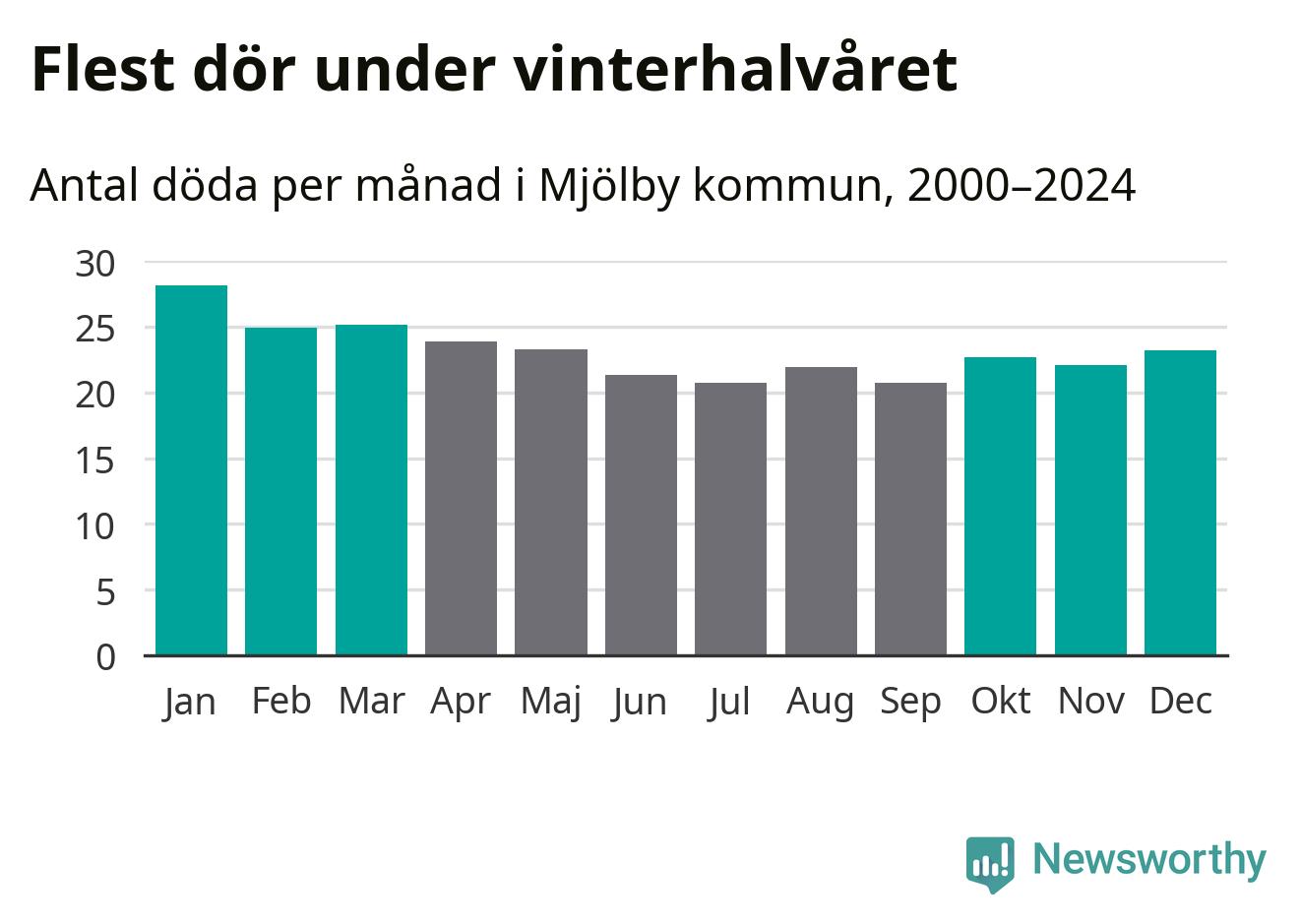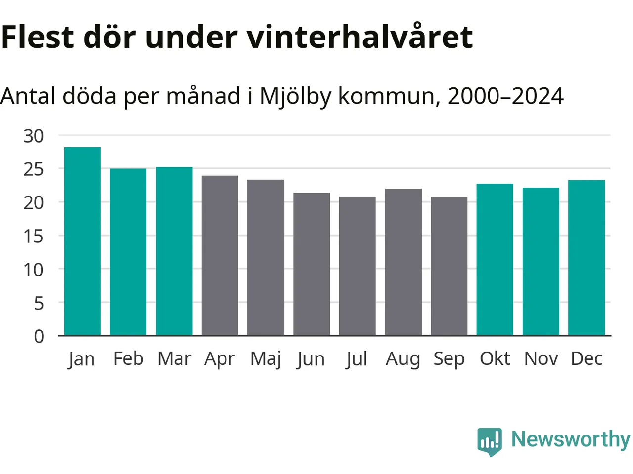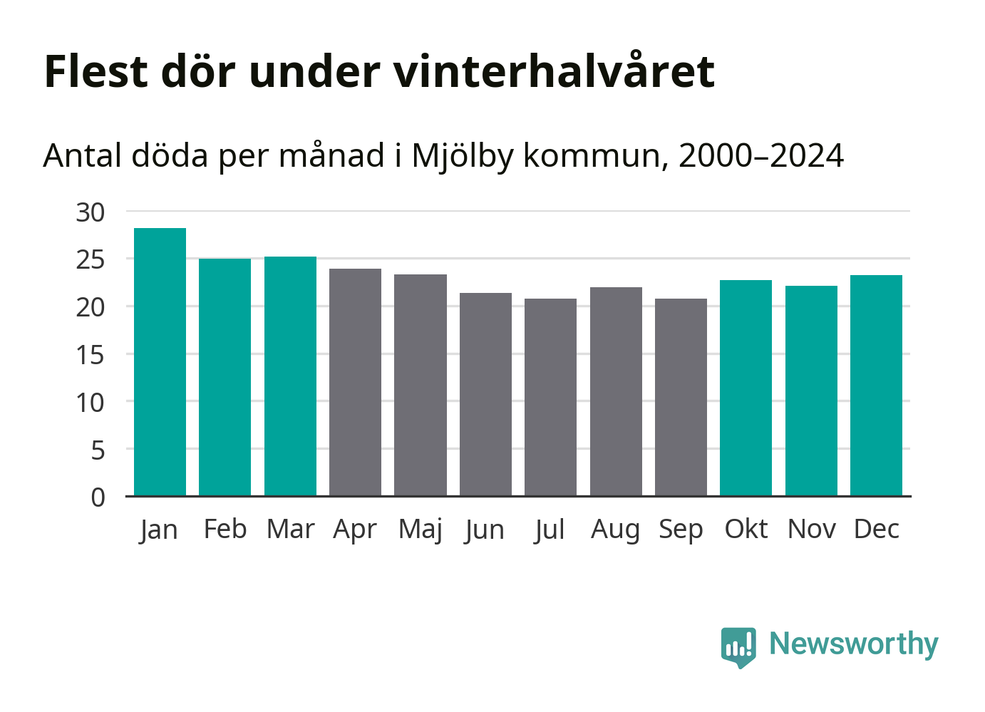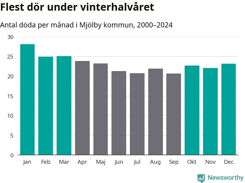 Så är det även i Mjölby. Under de senaste 25 åren har 3 624 personer dött i kommunen under vinterhalvåret, jämfört med 3 209 personer under sommarhalvåret – alltså 13 procent fler.
