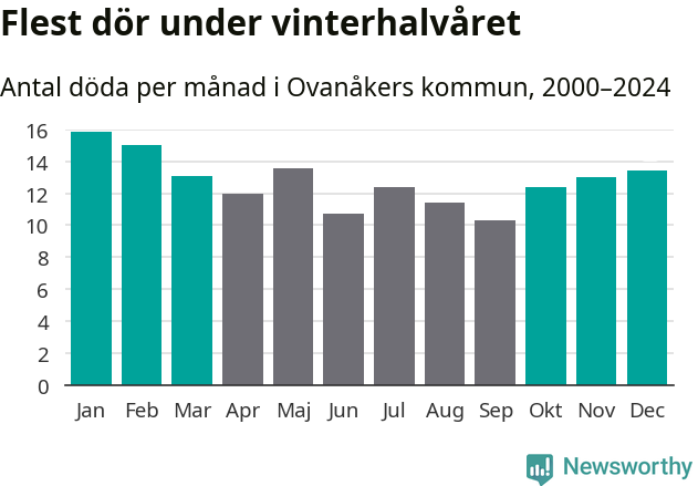 Så är det även i Ovanåker. Under de senaste 25 åren har 2 039 personer dött i kommunen under vinterhalvåret, jämfört med 1 750 personer under sommarhalvåret – alltså 17 procent fler.