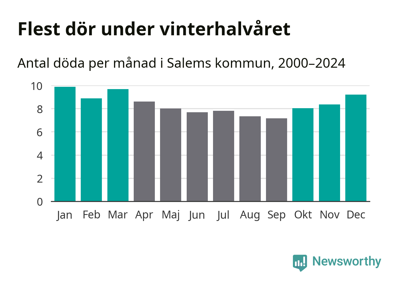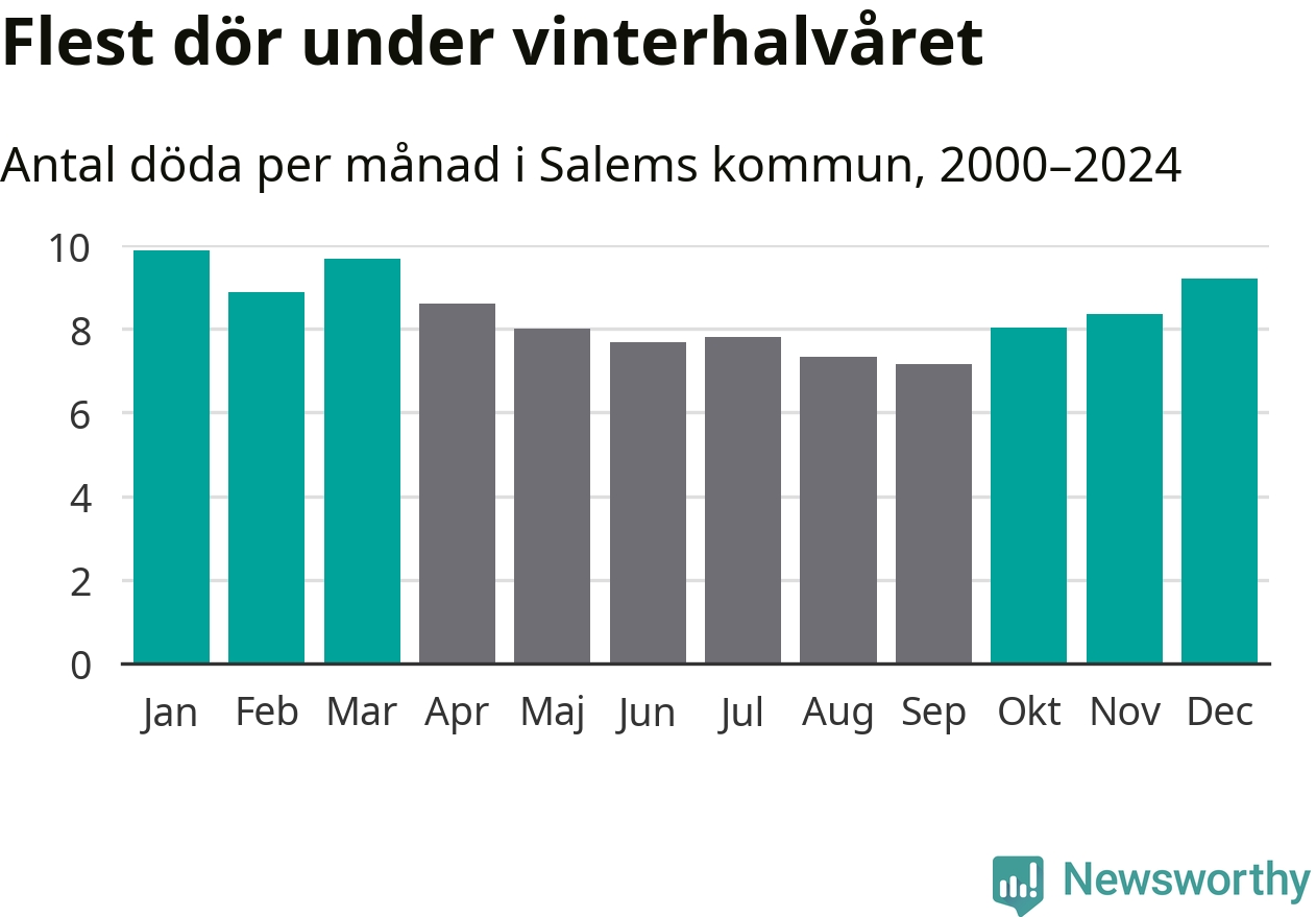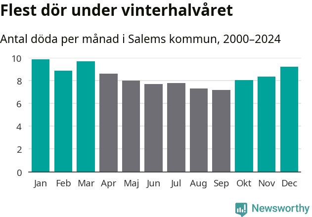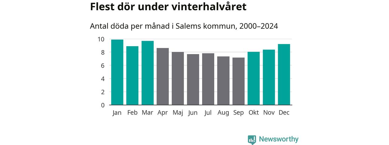 Så är det även i Salem. Under de senaste 25 åren har 1 347 personer dött i kommunen under vinterhalvåret, jämfört med 1 149 personer under sommarhalvåret – alltså 17 procent fler.