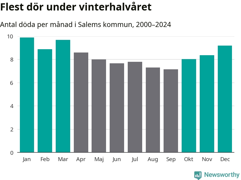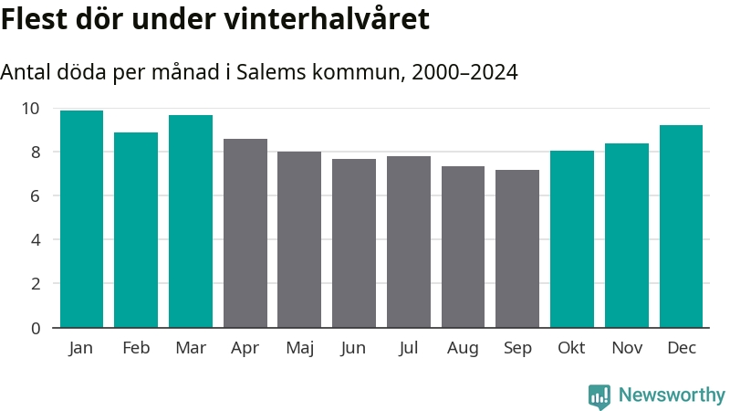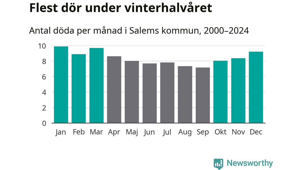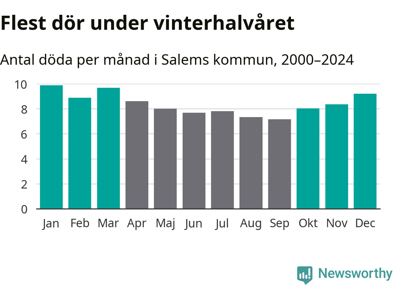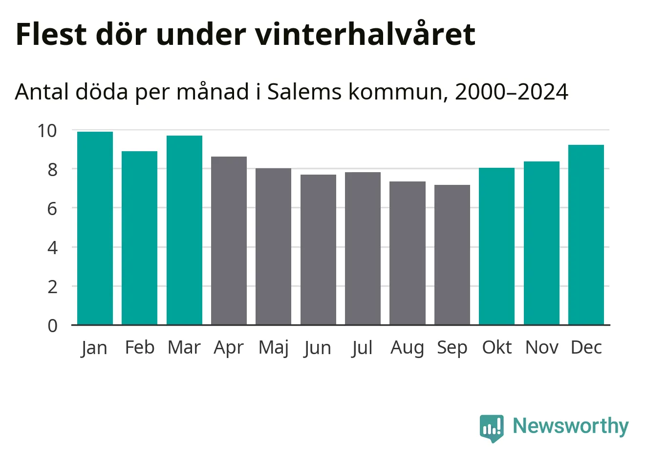 Så är det även i Salem. Under de senaste 25 åren har 1 347 personer dött i kommunen under vinterhalvåret, jämfört med 1 149 personer under sommarhalvåret – alltså 17 procent fler.