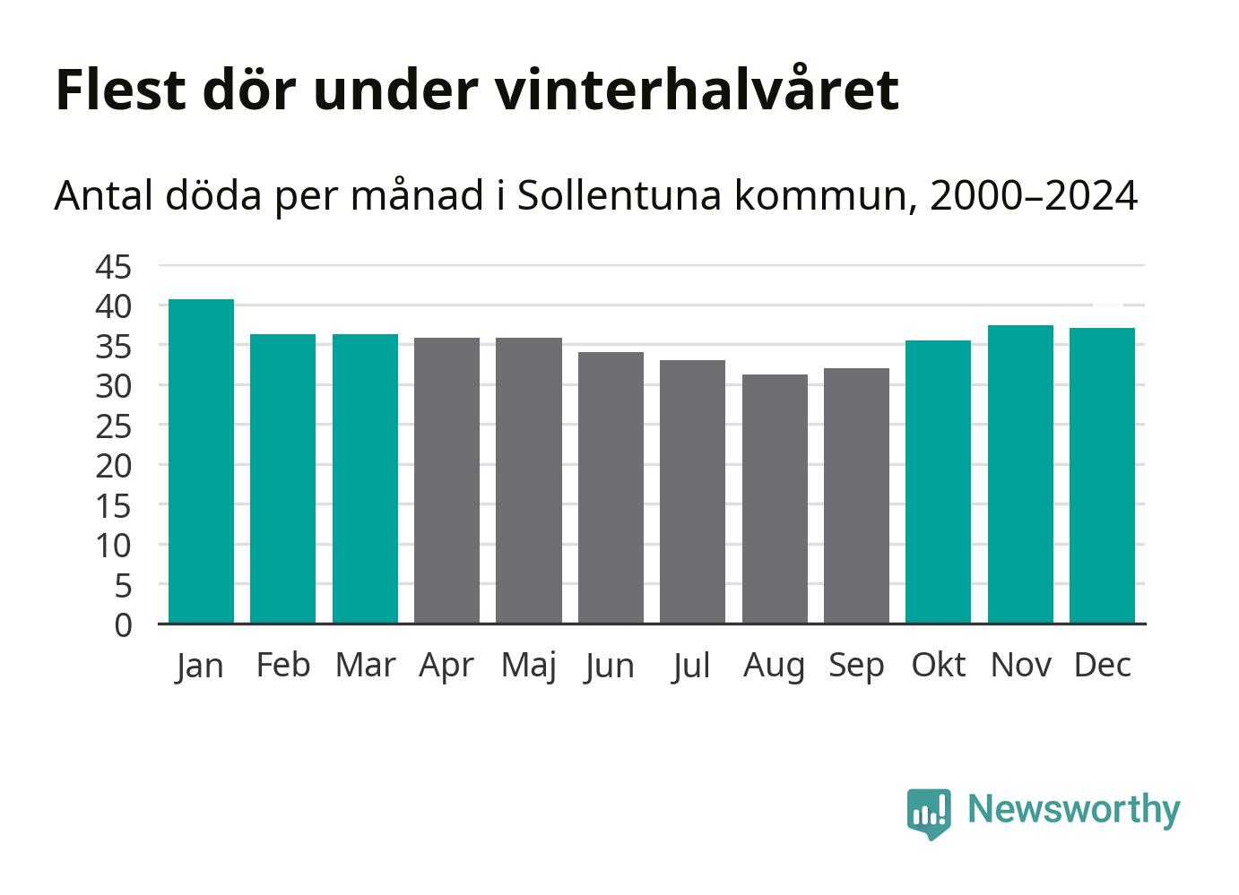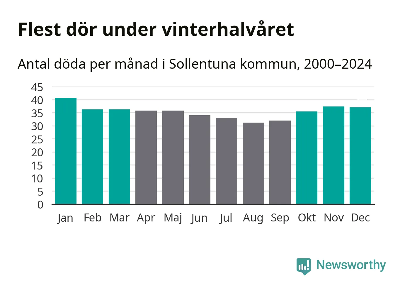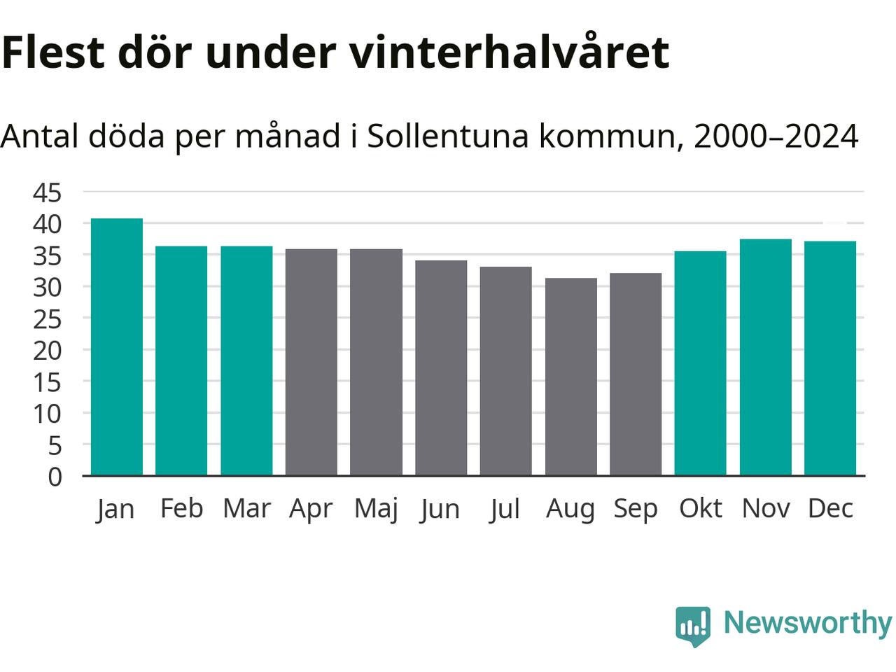 I landet som helhet är det veckorna kring årsskiftet som är de allra dödligaste. Så är det även i Sollentuna, där den dödligaste perioden infaller under vecka 2, enligt statistik för de senaste 25 åren. Sammanlagt handlar det om 251 personer , vilket är 24 procent fler än snittet för resten av året.