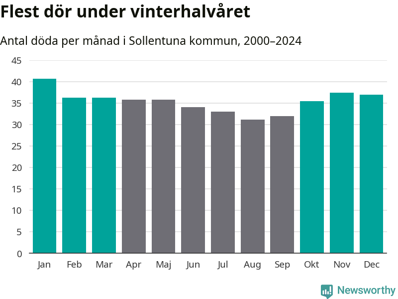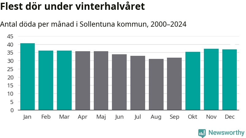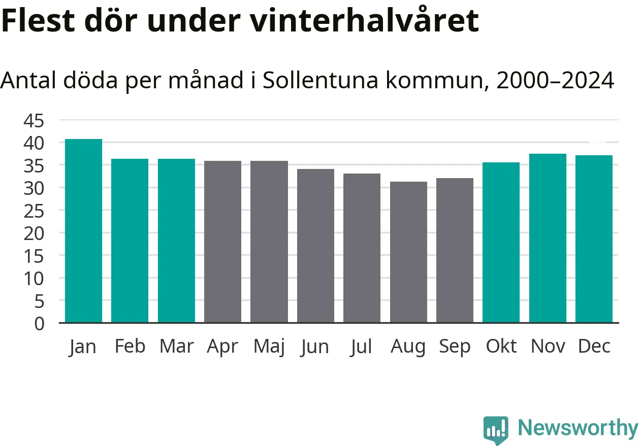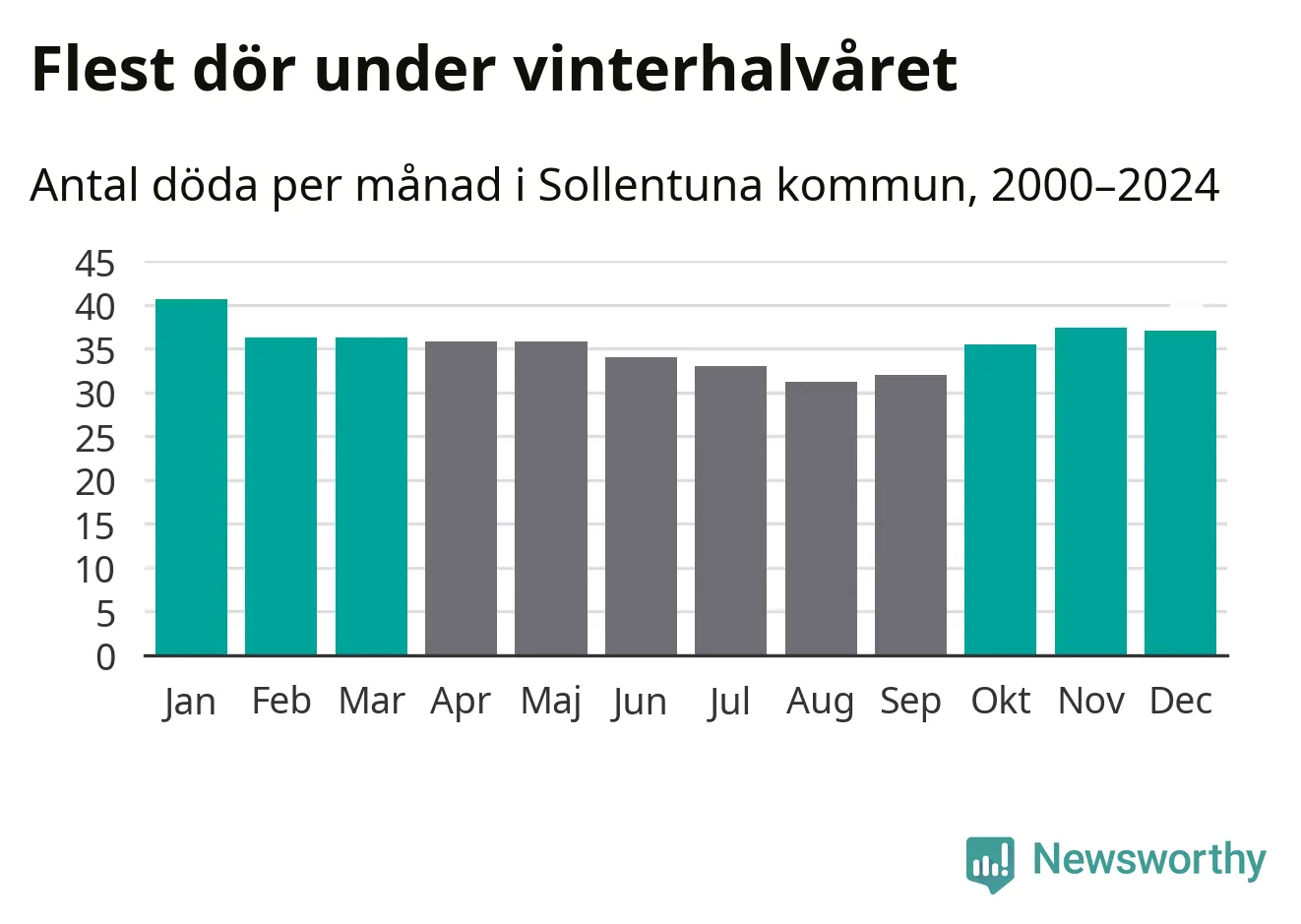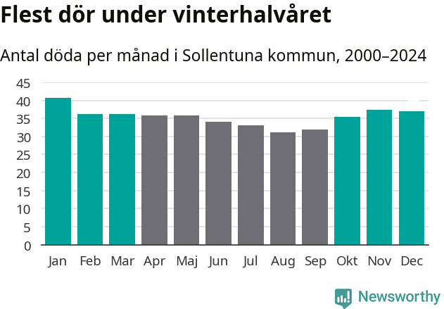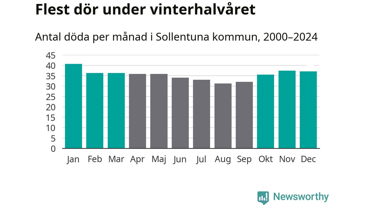 I landet som helhet är det veckorna kring årsskiftet som är de allra dödligaste. Så är det även i Sollentuna, där den dödligaste perioden infaller under vecka 2, enligt statistik för de senaste 25 åren. Sammanlagt handlar det om 251 personer , vilket är 24 procent fler än snittet för resten av året.