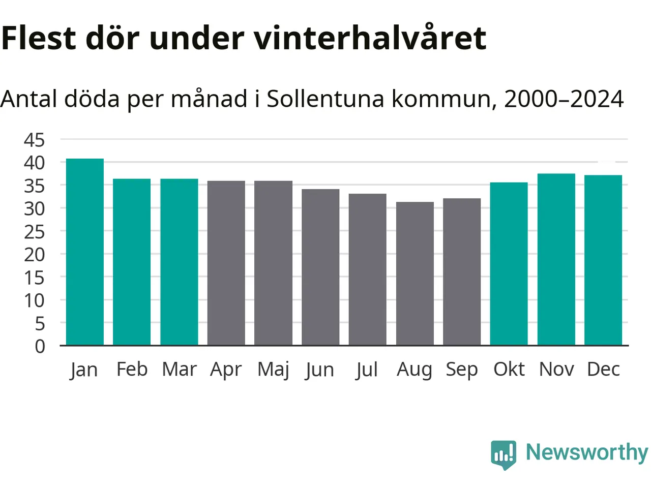 Så är det även i Sollentuna. Under de senaste 25 åren har 5 519 personer dött i kommunen under vinterhalvåret, jämfört med 5 002 personer under sommarhalvåret – alltså tio procent fler.