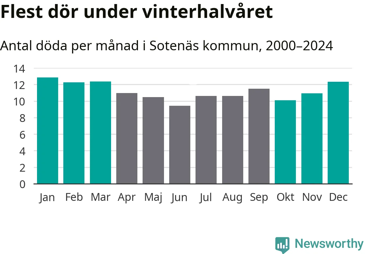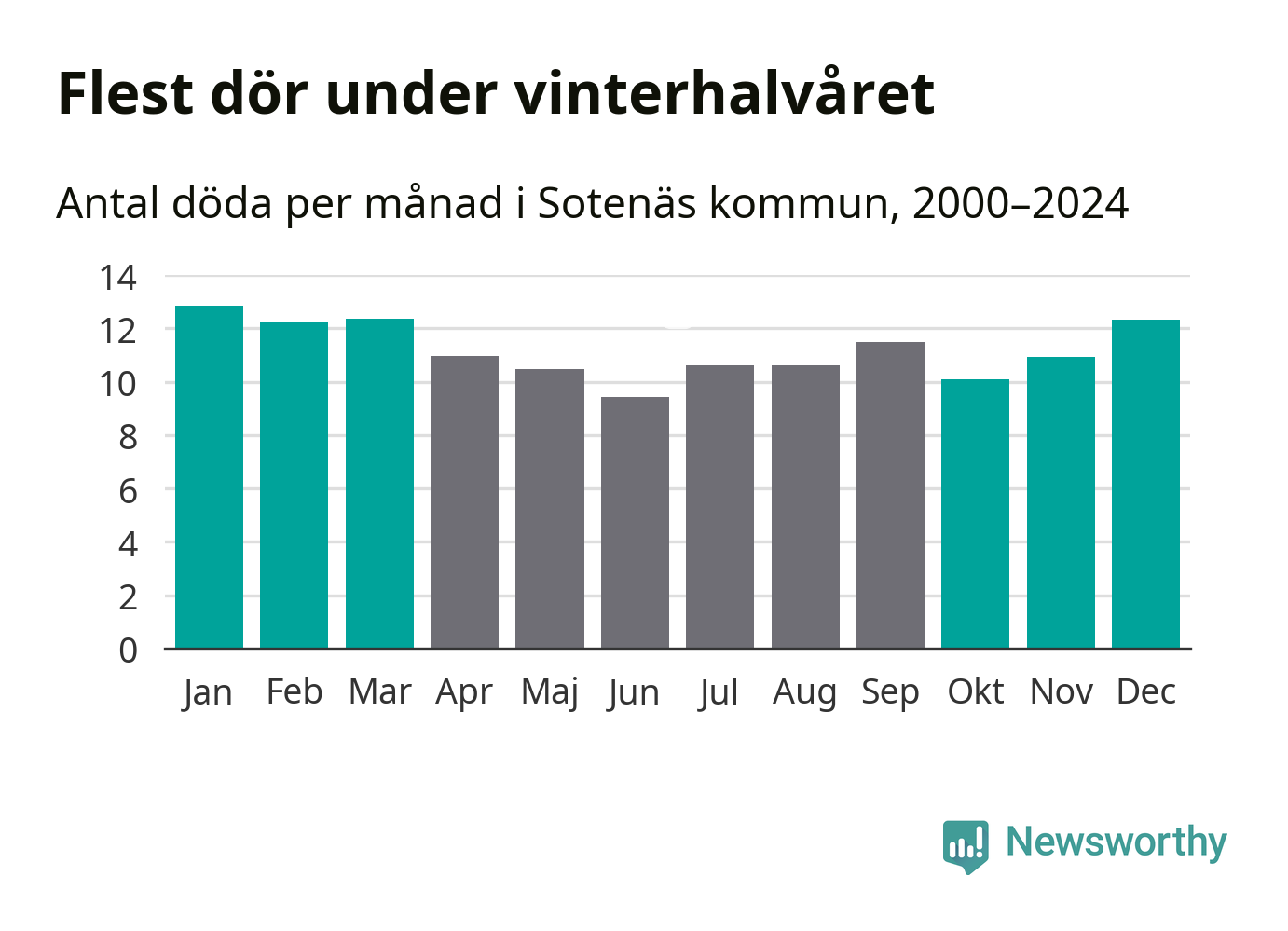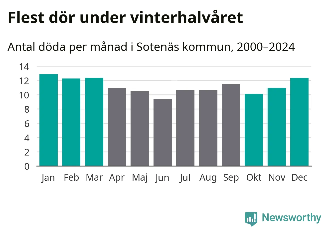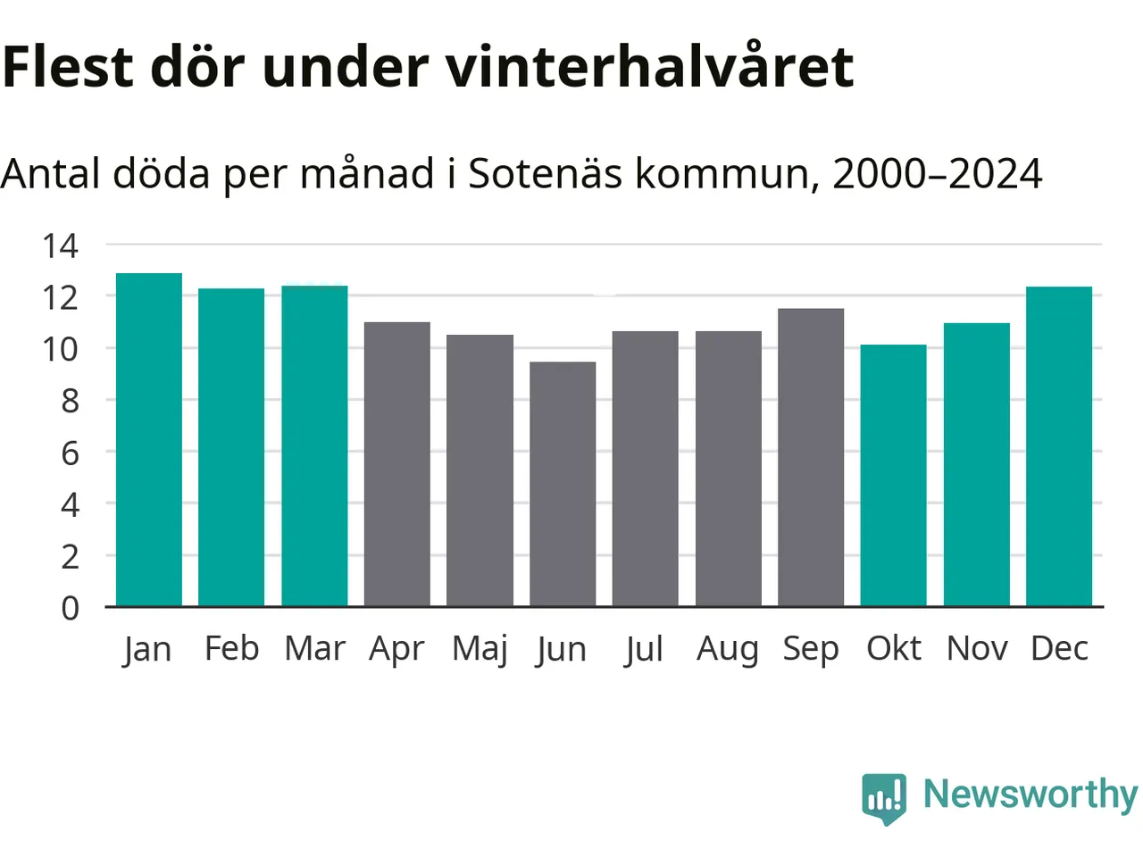 Så är det även i Sotenäs. Under de senaste 25 åren har 1 771 personer dött i kommunen under vinterhalvåret, jämfört med 1 551 personer under sommarhalvåret – alltså 14 procent fler.