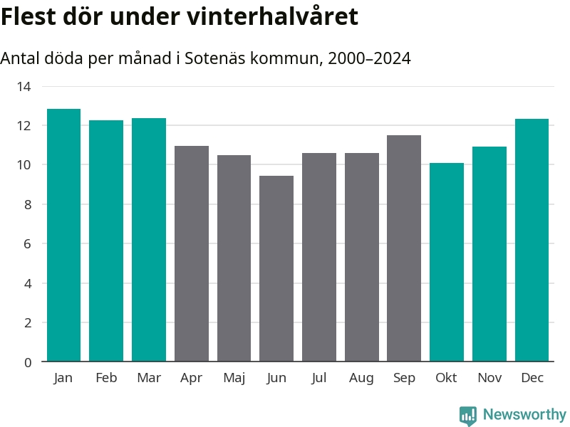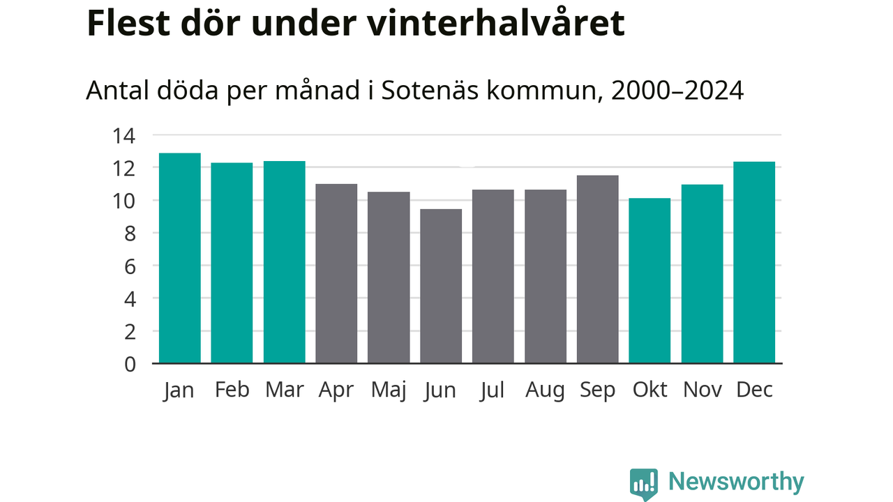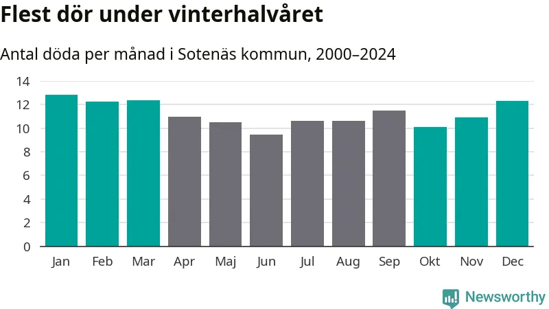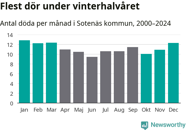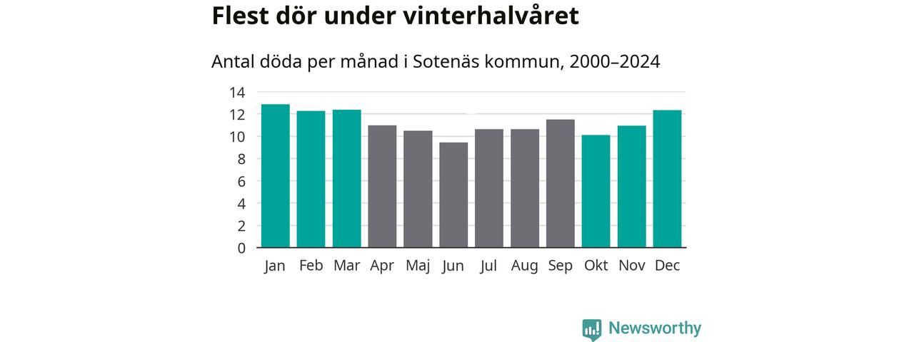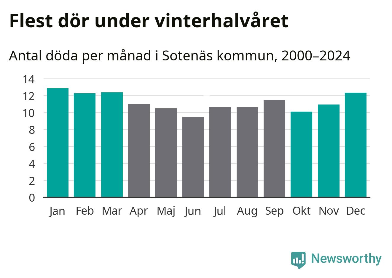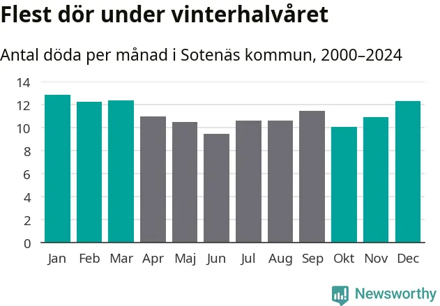 Så är det även i Sotenäs. Under de senaste 25 åren har 1 771 personer dött i kommunen under vinterhalvåret, jämfört med 1 551 personer under sommarhalvåret – alltså 14 procent fler.
