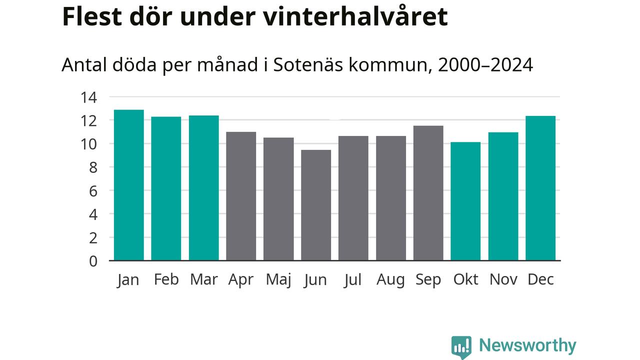 I landet som helhet är det veckorna kring årsskiftet som är de allra dödligaste. I Sotenäs har flest istället dött vecka 10. Sammanlagt under de senaste 25 åren handlar det om 85 personer, vilket är 33 procent fler än snittet för resten av året.