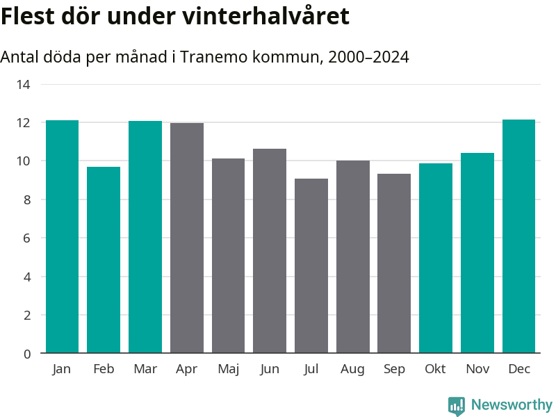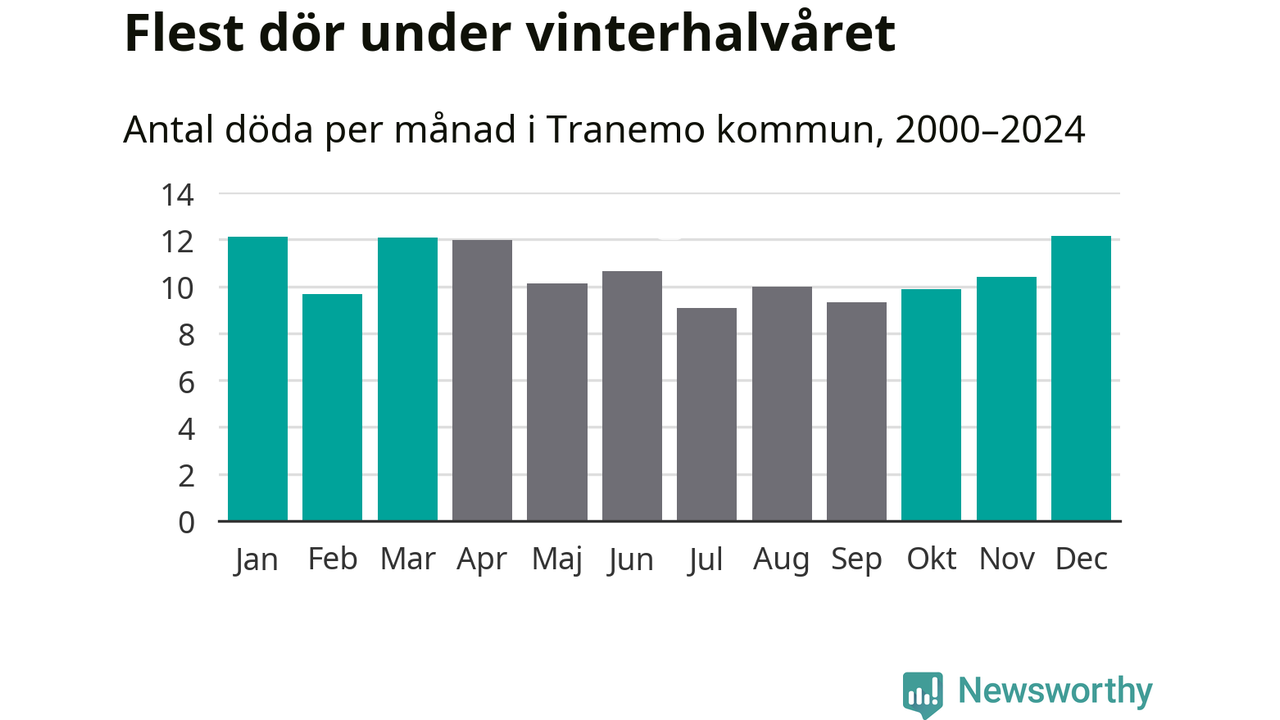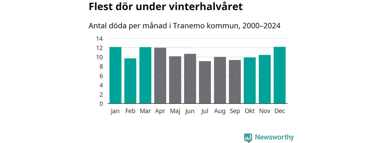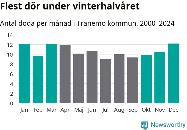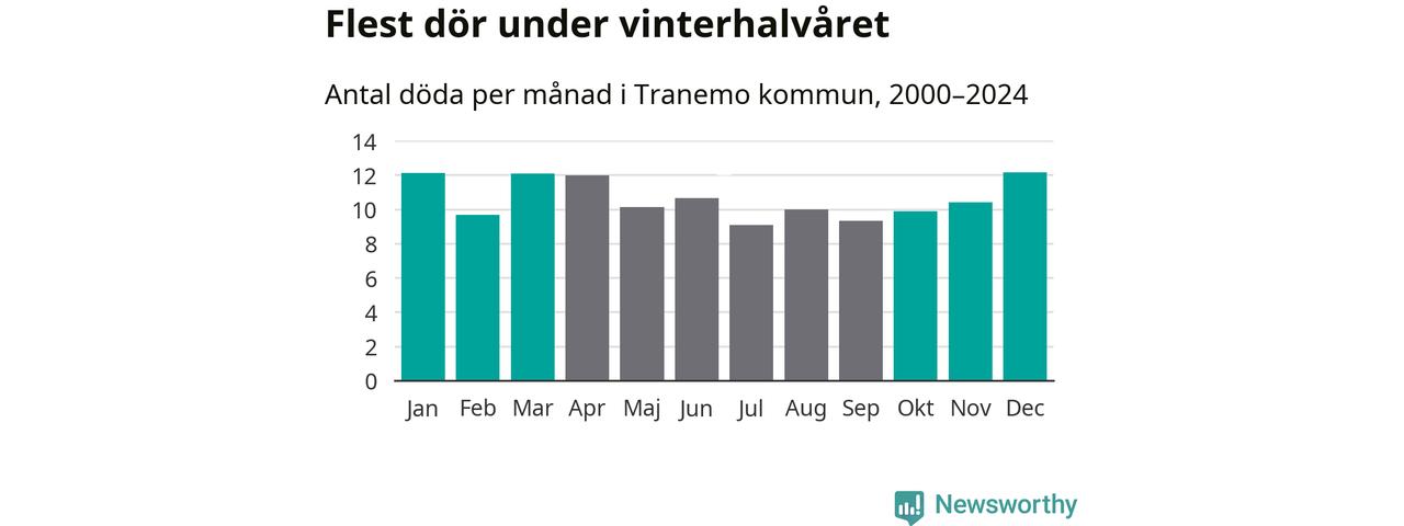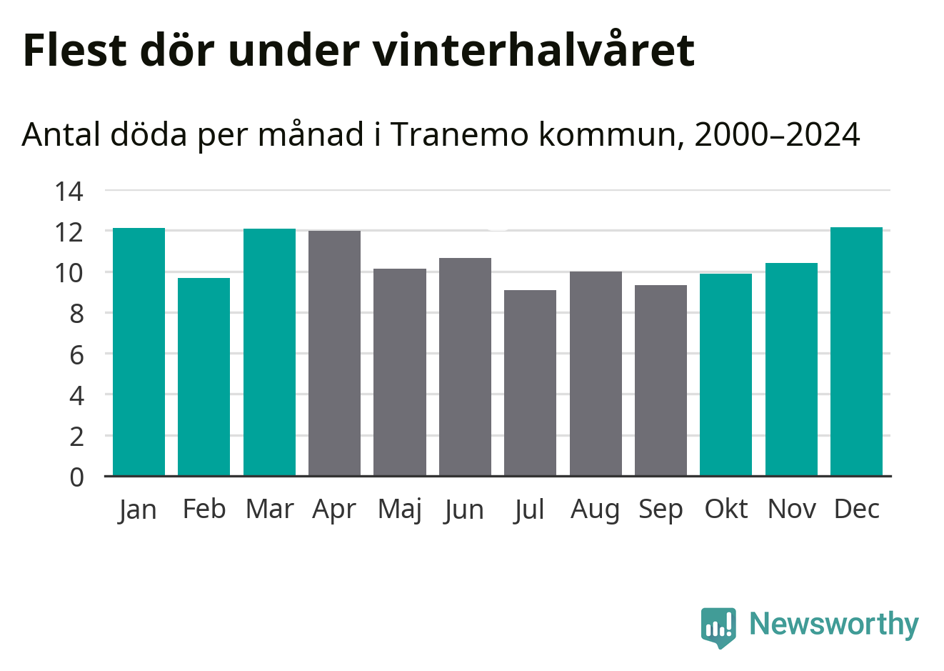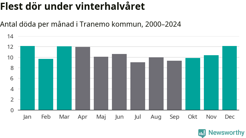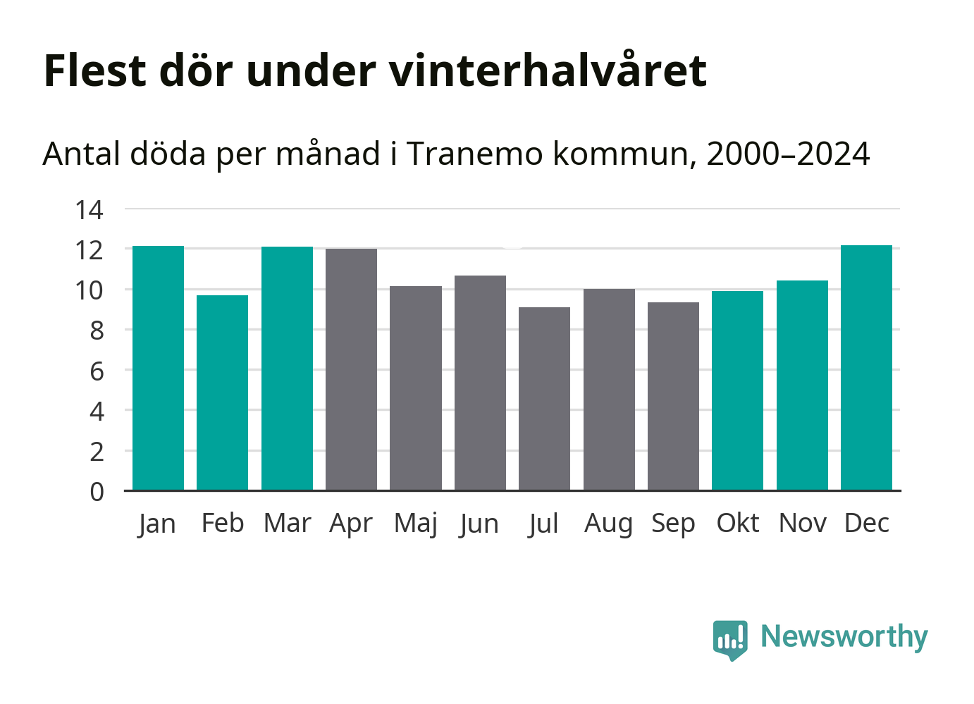 Så är det även i Tranemo. Under de senaste 25 åren har 1 672 personer dött i kommunen under vinterhalvåret, jämfört med 1 467 personer under sommarhalvåret – alltså 14 procent fler.
