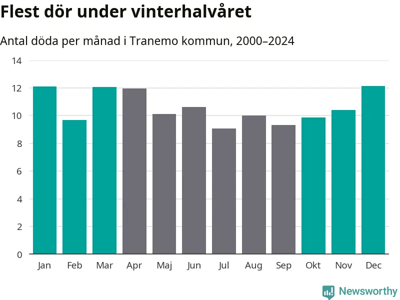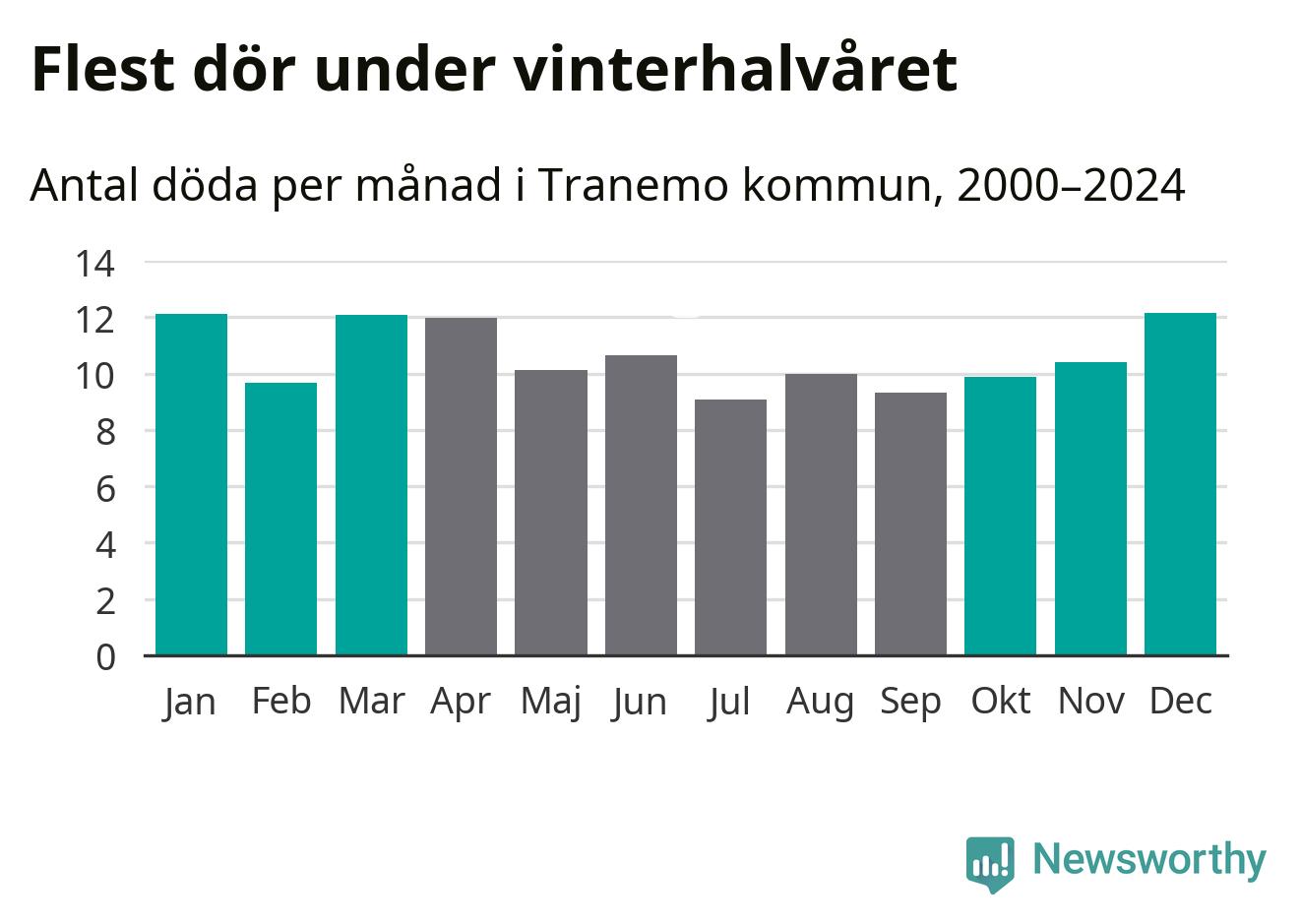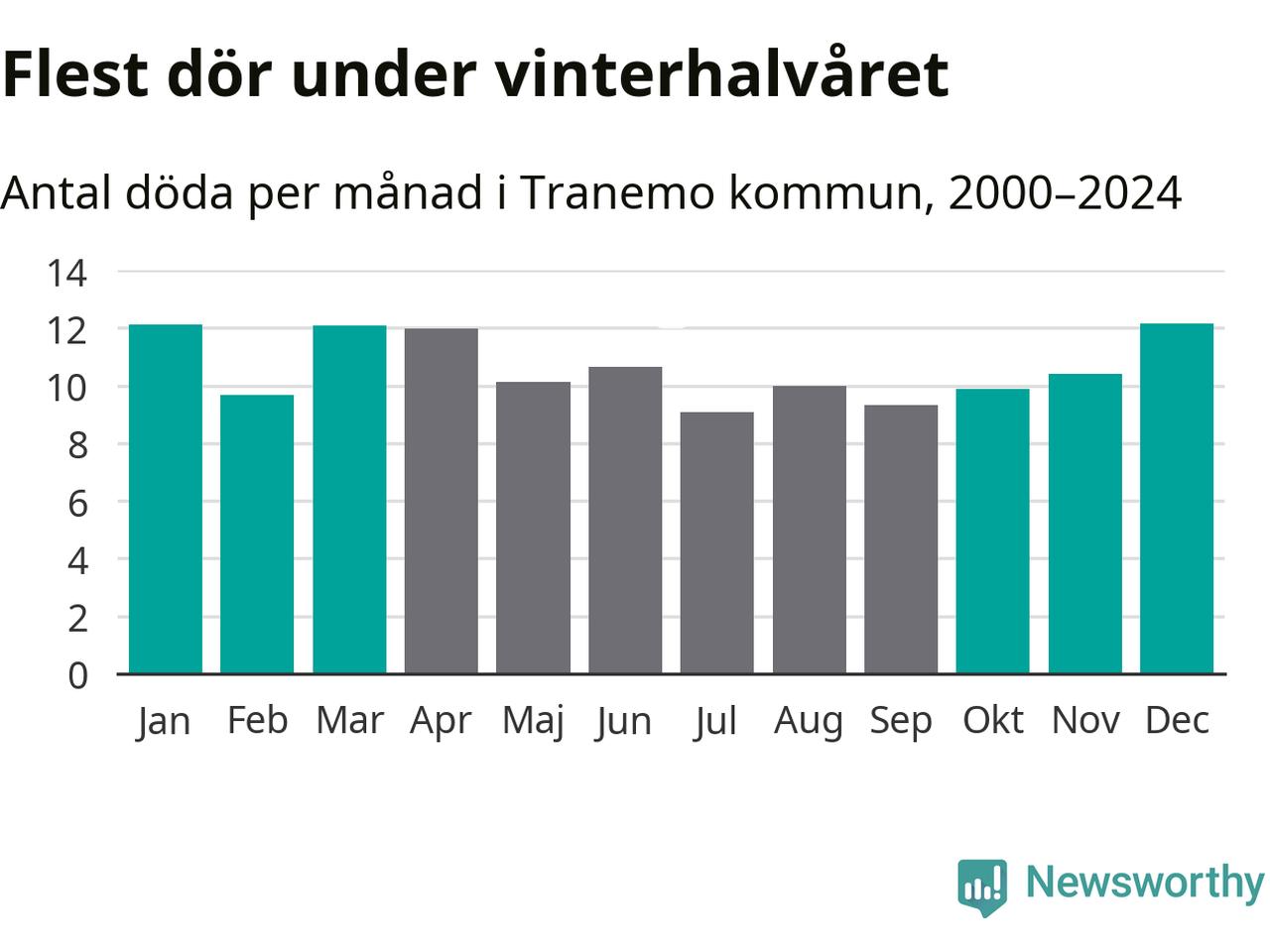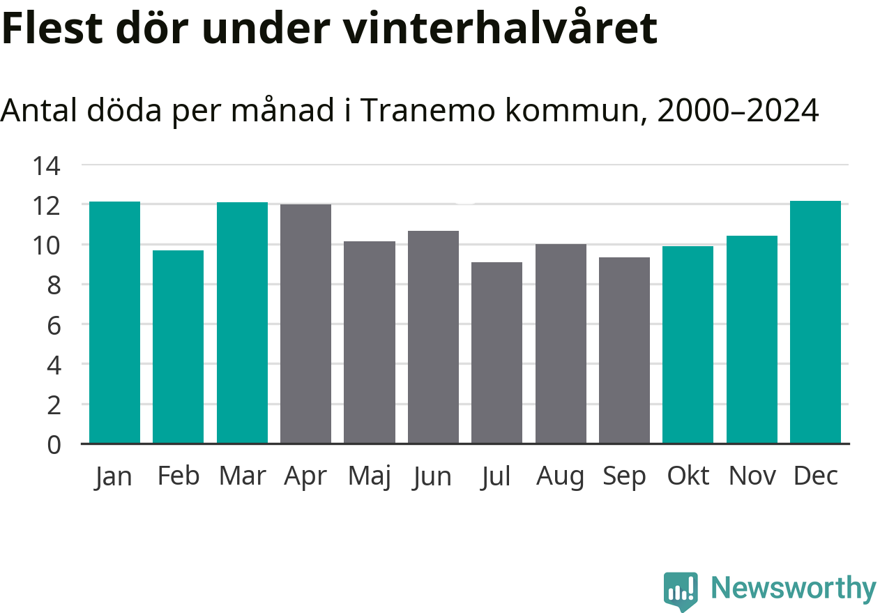 I landet som helhet är det veckorna kring årsskiftet som är de allra dödligaste. I Tranemo har flest istället dött vecka 10. Sammanlagt under de senaste 25 åren handlar det om 81 personer, vilket är 34 procent fler än snittet för resten av året.