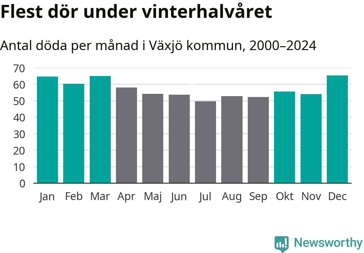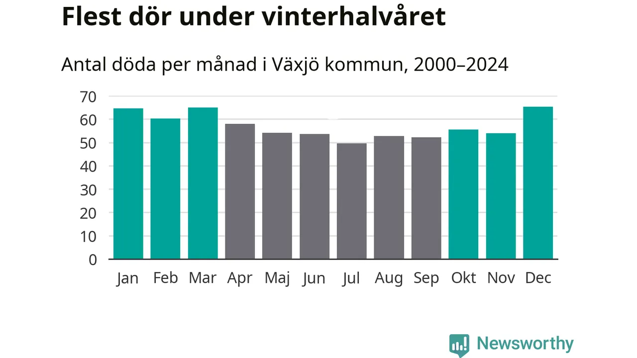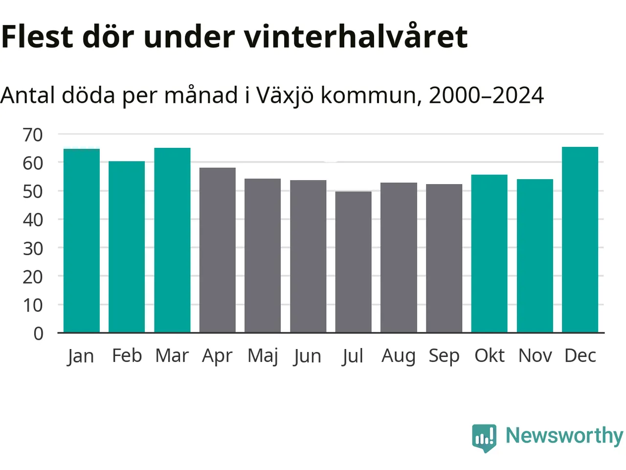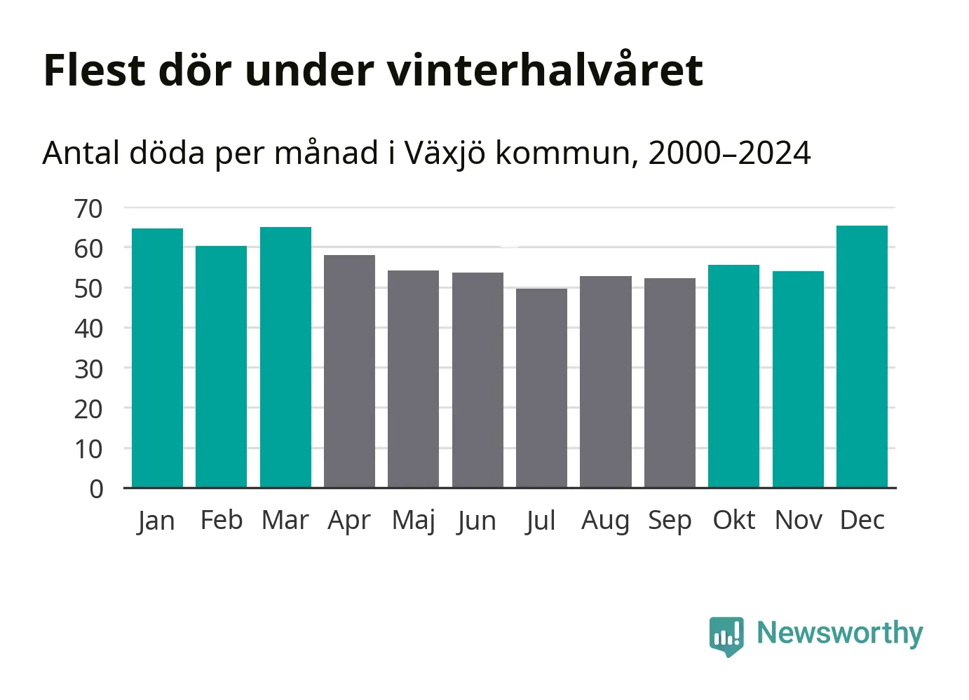 Så är det även i Växjö. Under de senaste 25 åren har 9 024 personer dött i kommunen under vinterhalvåret, jämfört med 7 817 personer under sommarhalvåret – alltså 15 procent fler.
