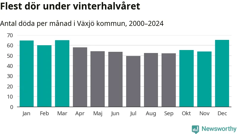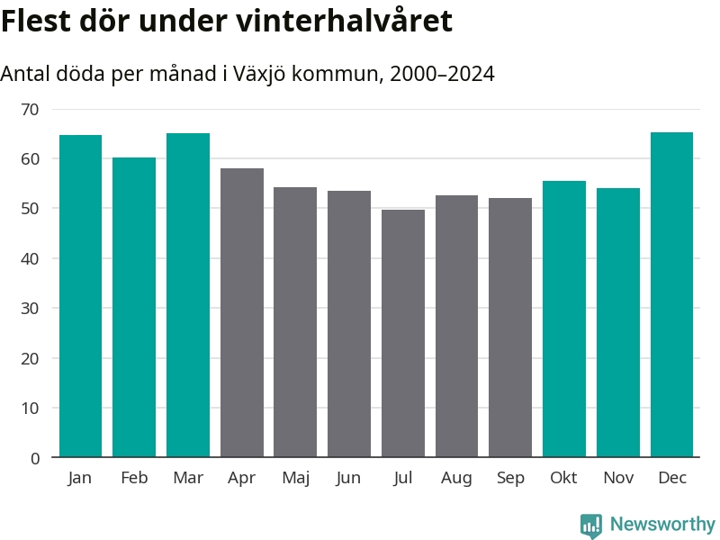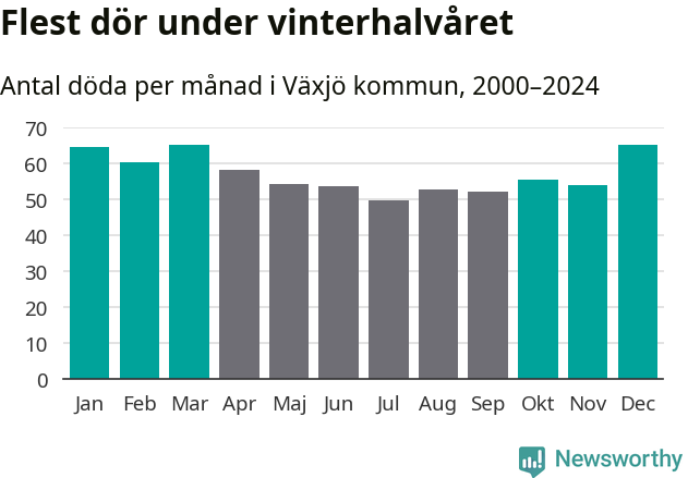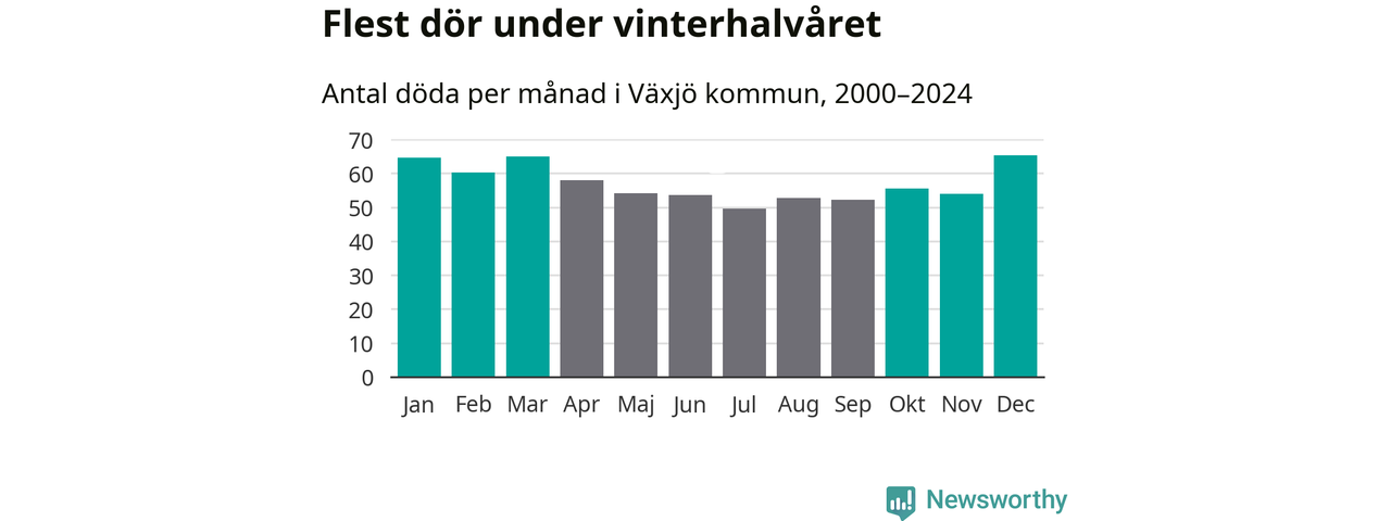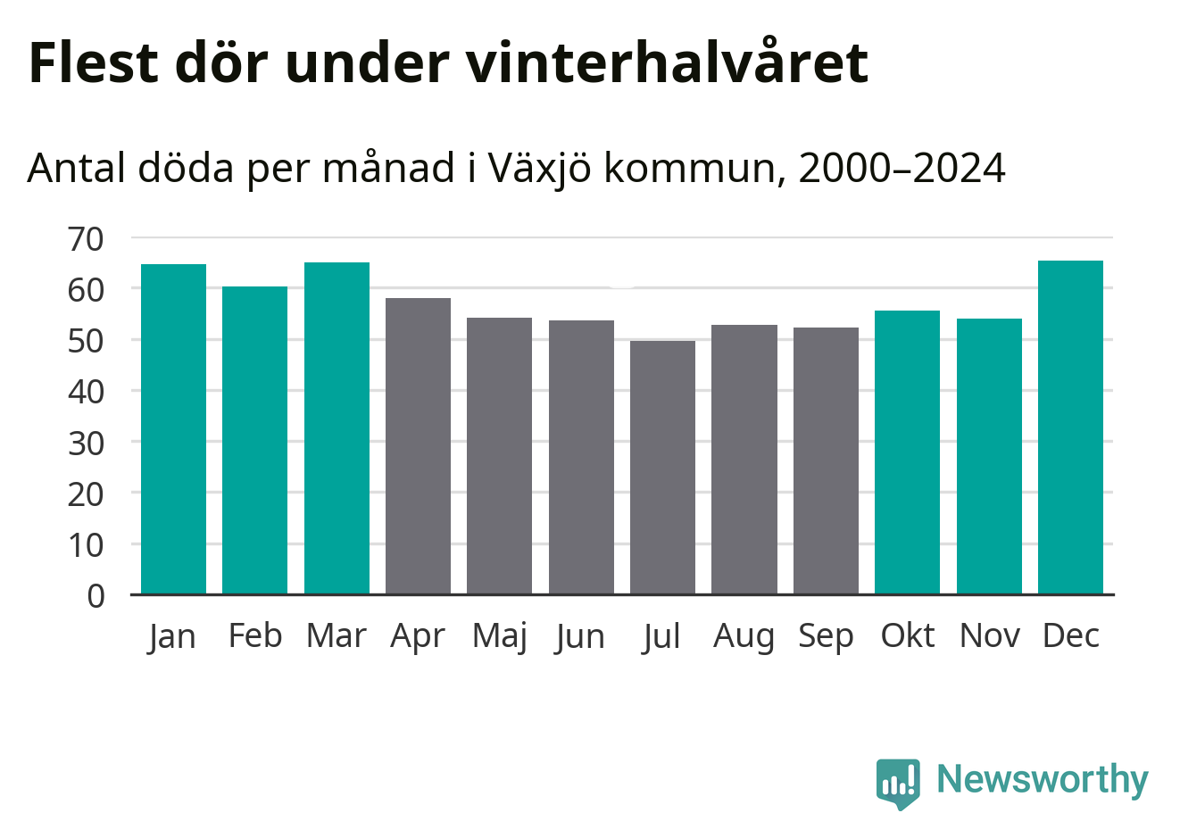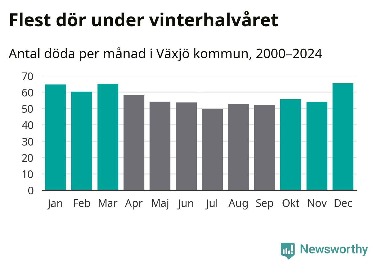 Så är det även i Växjö. Under de senaste 25 åren har 9 024 personer dött i kommunen under vinterhalvåret, jämfört med 7 817 personer under sommarhalvåret – alltså 15 procent fler.