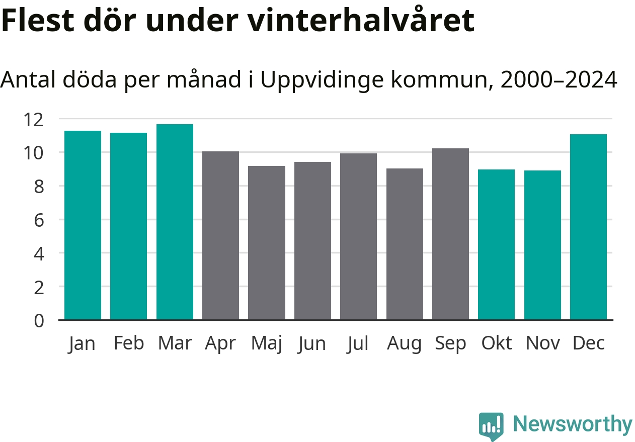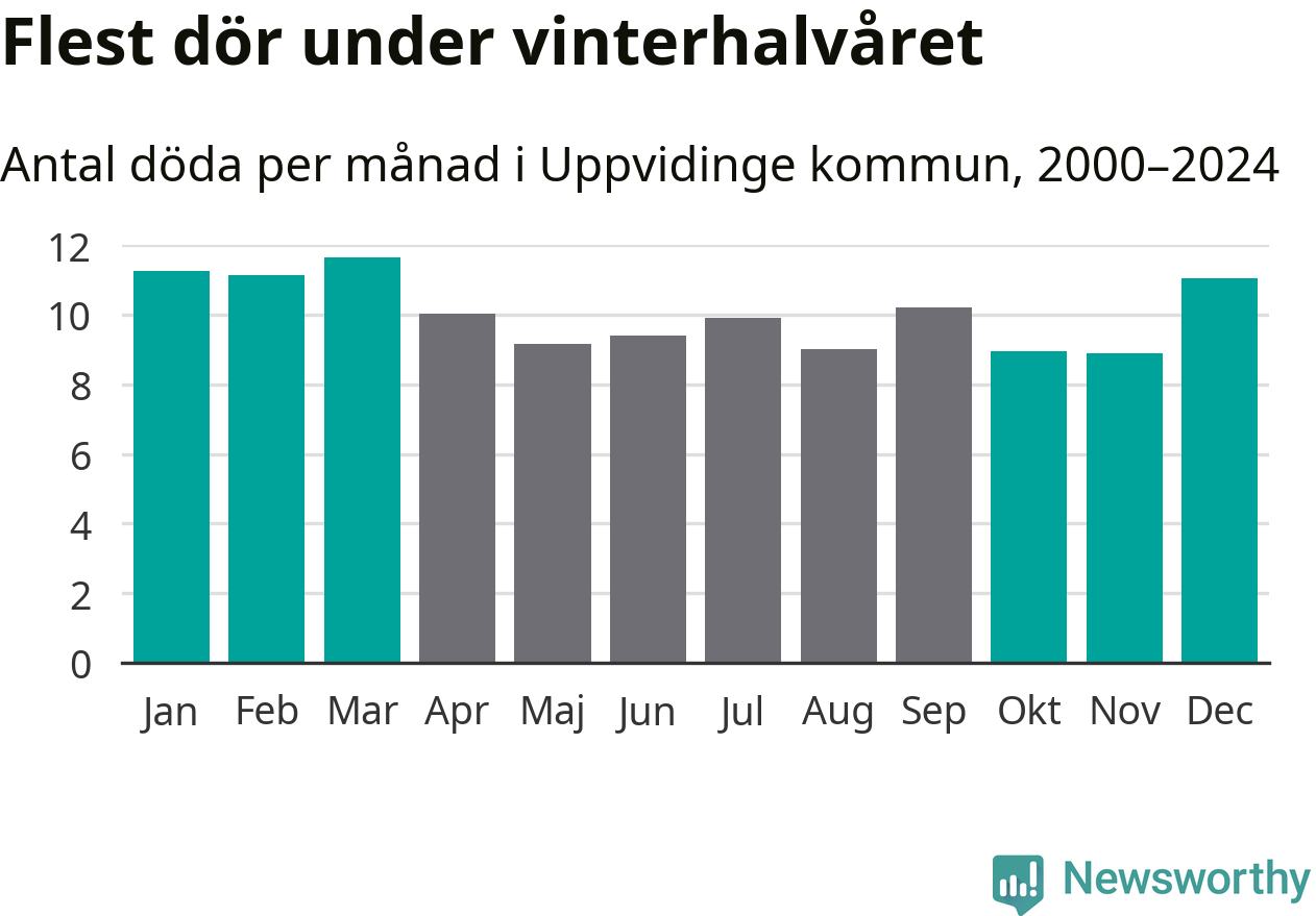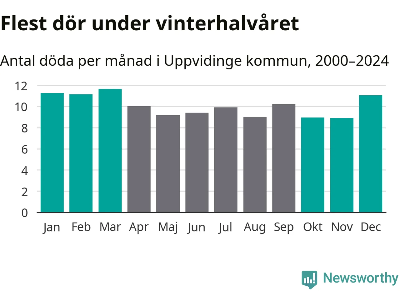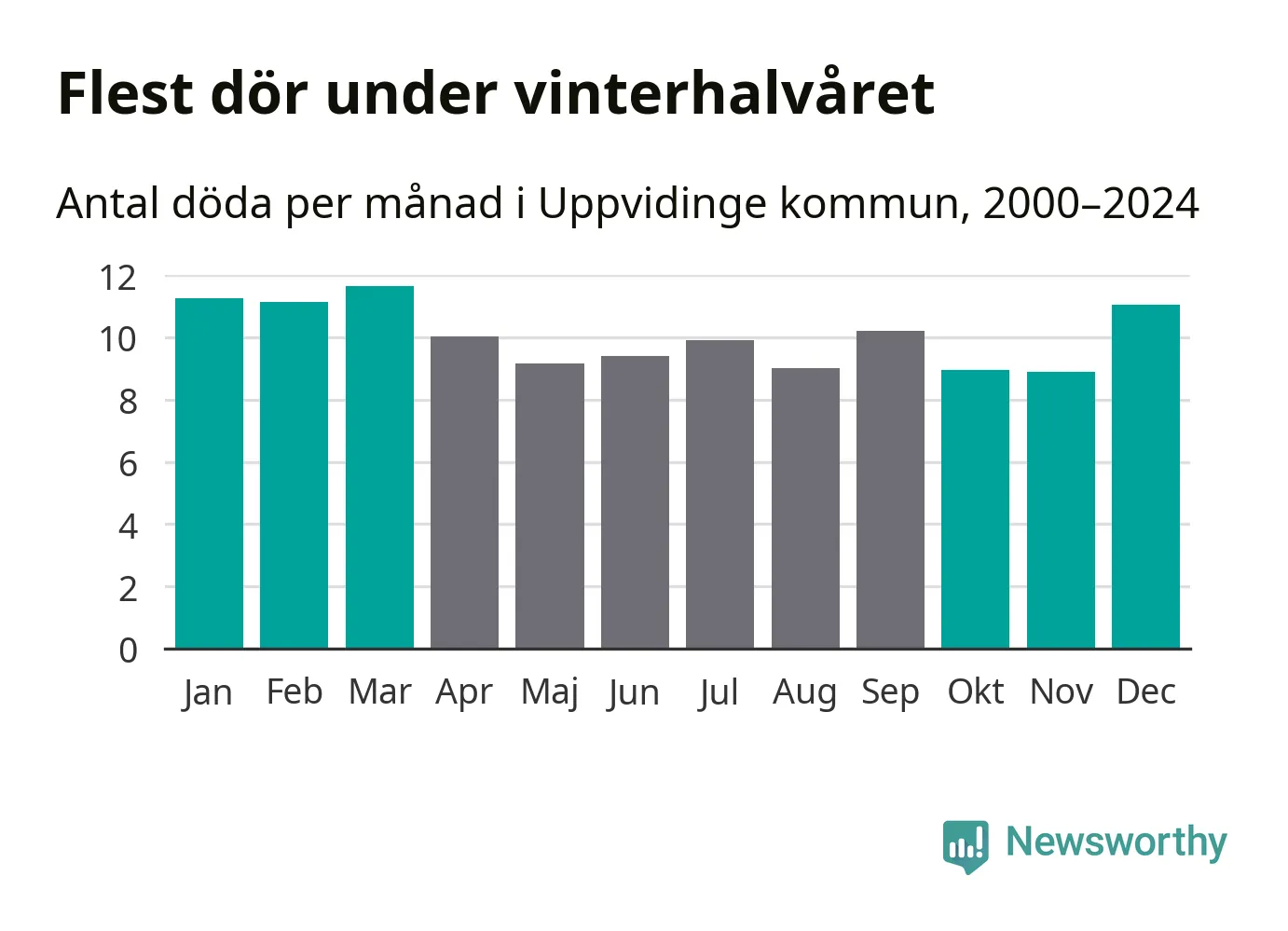 Så är det även i Uppvidinge. Under de senaste 25 åren har 1 576 personer dött i kommunen under vinterhalvåret, jämfört med 1 396 personer under sommarhalvåret – alltså 13 procent fler.