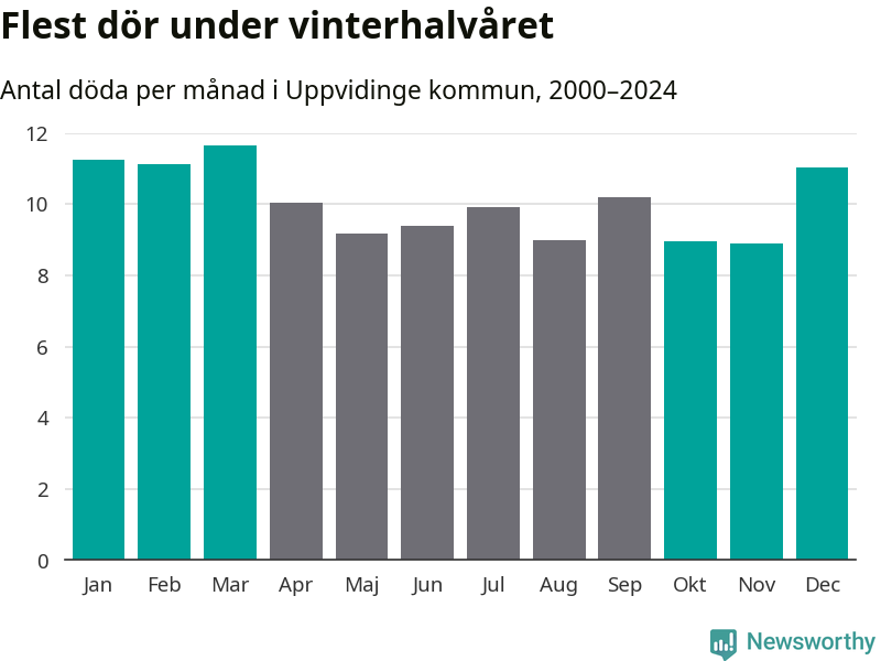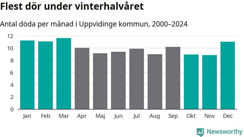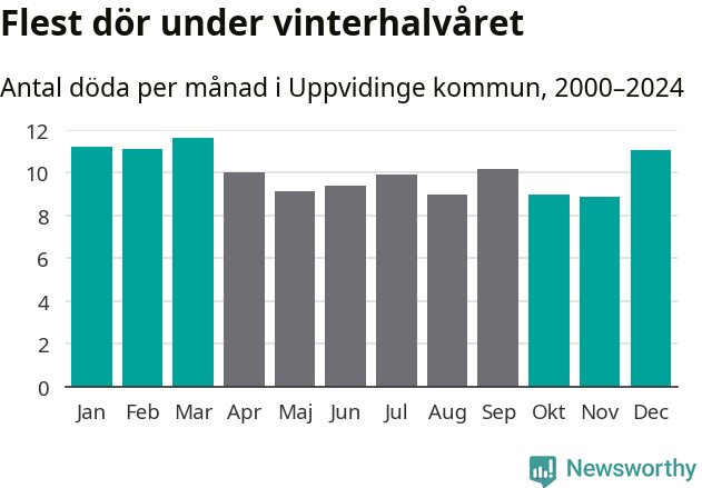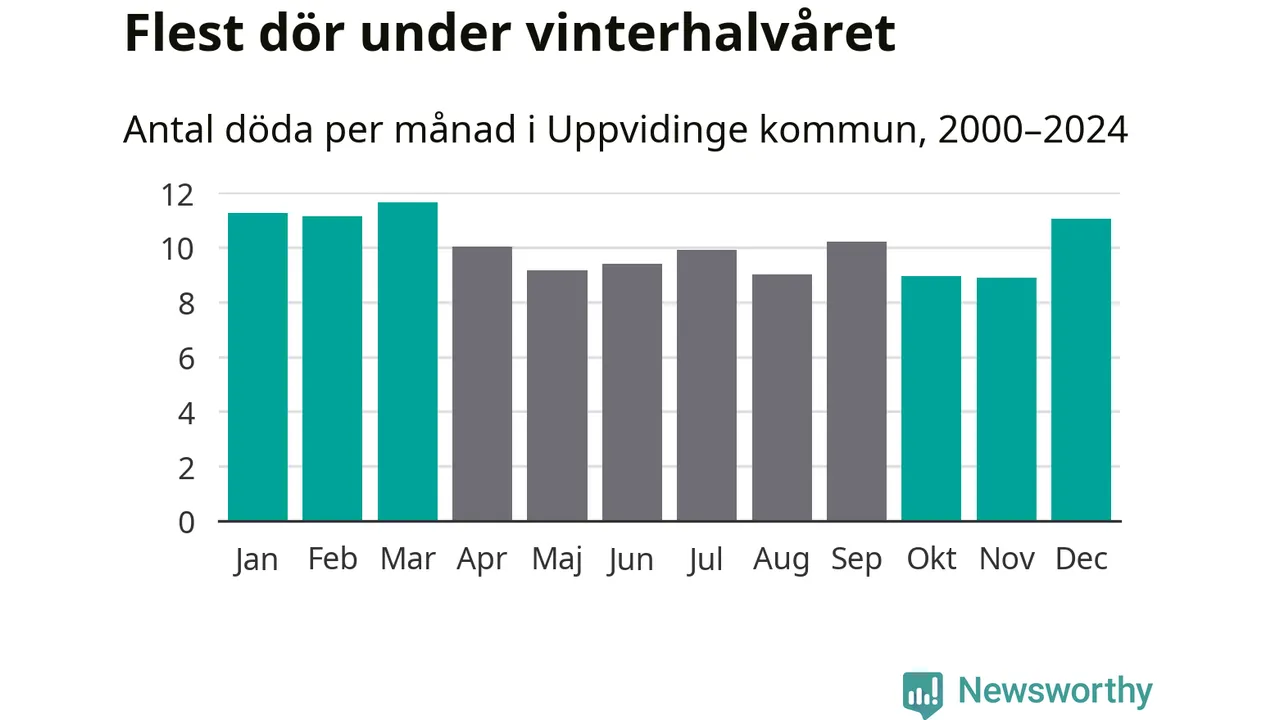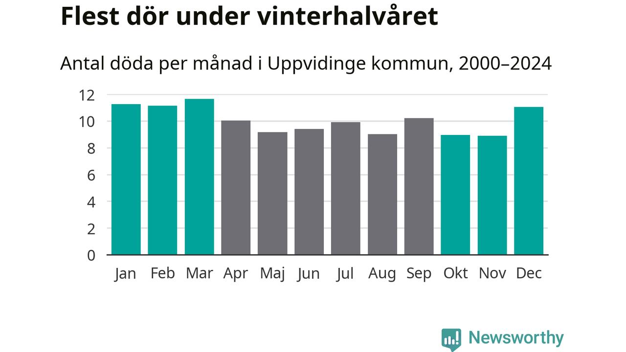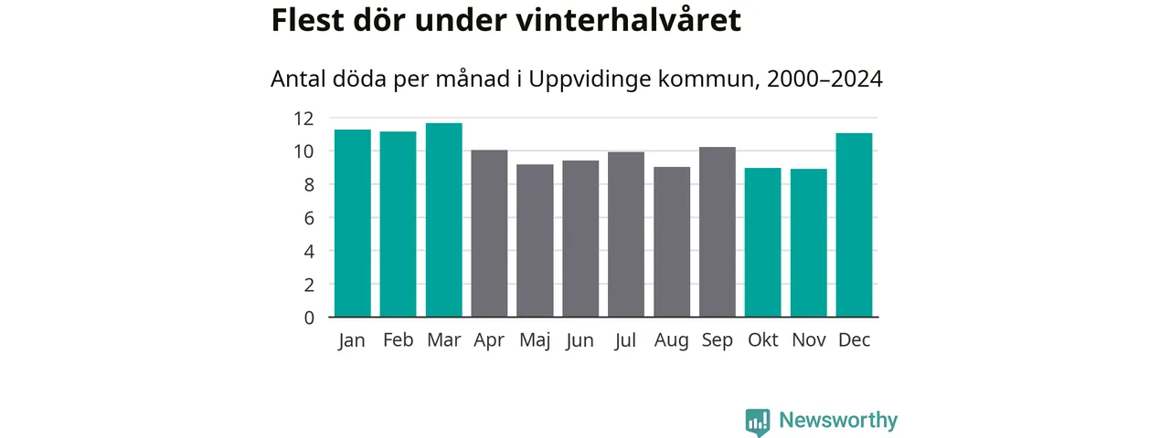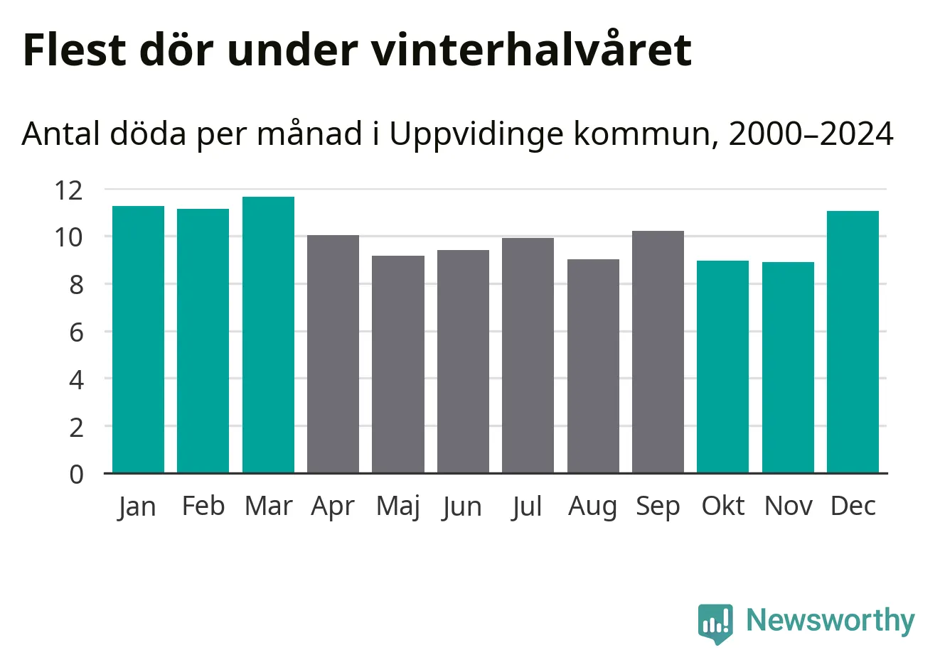 Så är det även i Uppvidinge. Under de senaste 25 åren har 1 576 personer dött i kommunen under vinterhalvåret, jämfört med 1 396 personer under sommarhalvåret – alltså 13 procent fler.