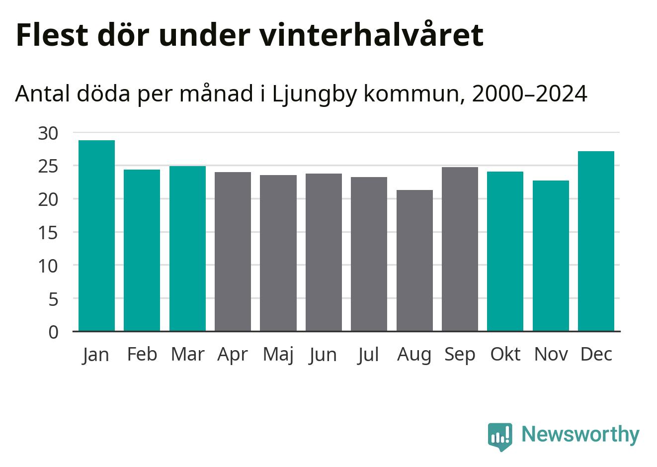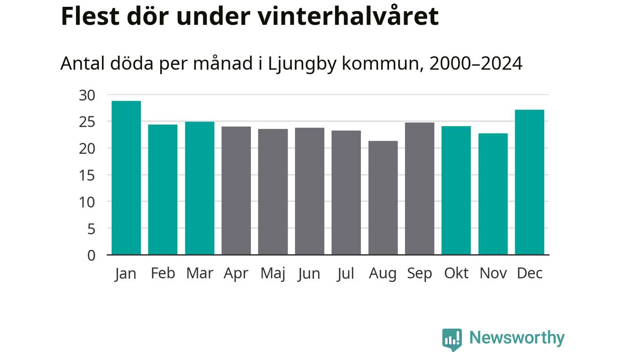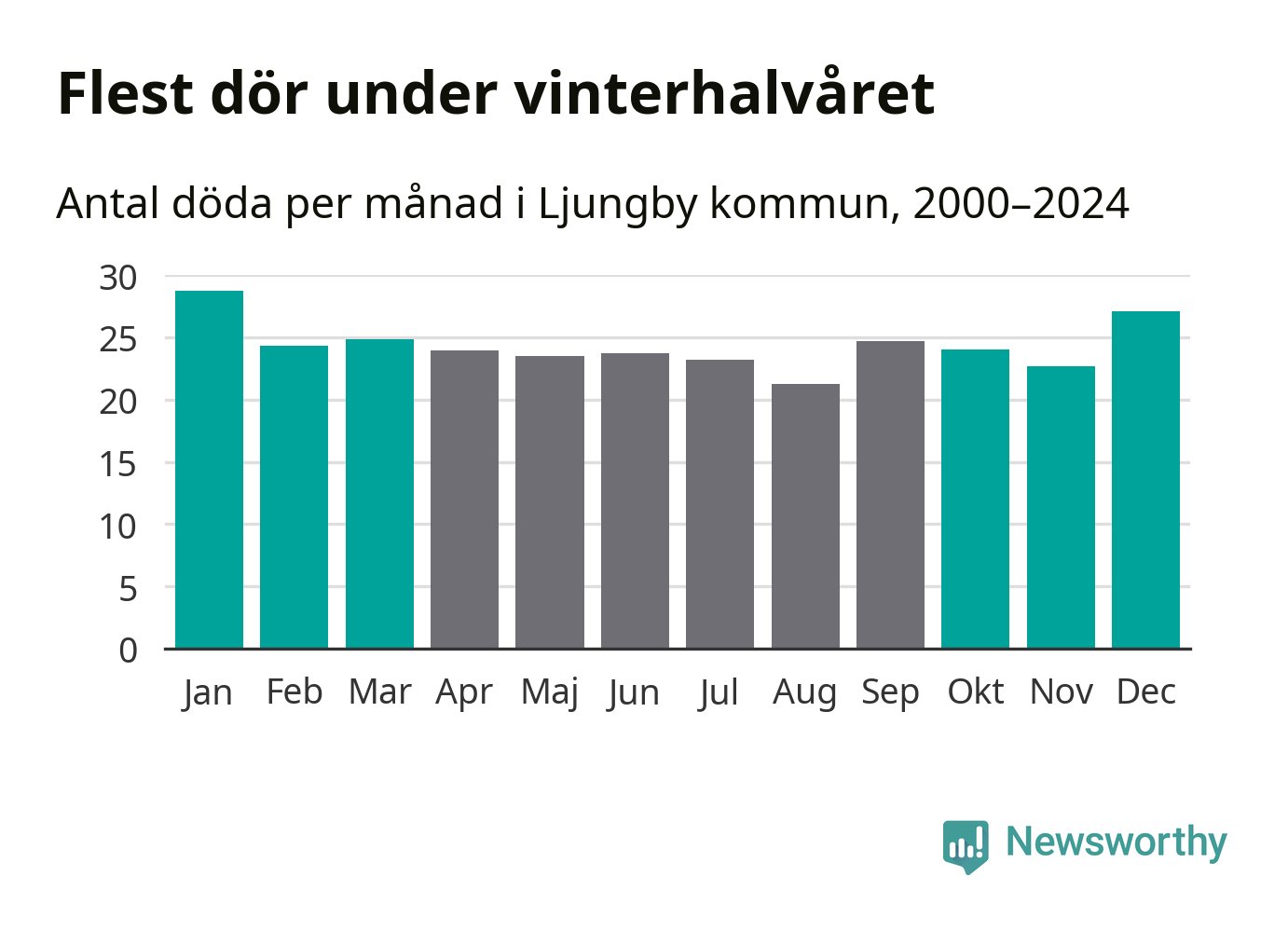 Så är det även i Ljungby. Under de senaste 25 åren har 3 739 personer dött i kommunen under vinterhalvåret, jämfört med 3 457 personer under sommarhalvåret – alltså åtta procent fler.