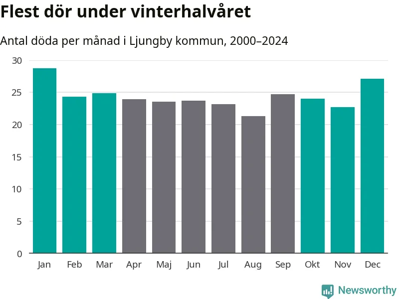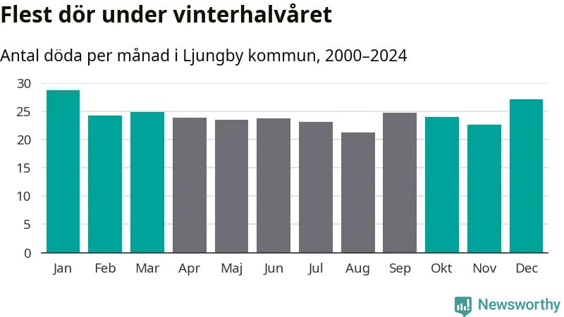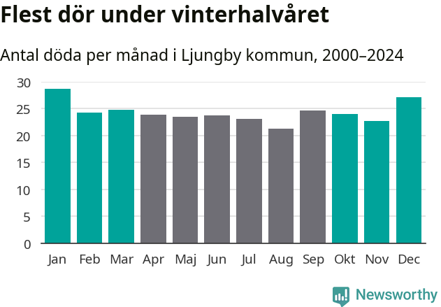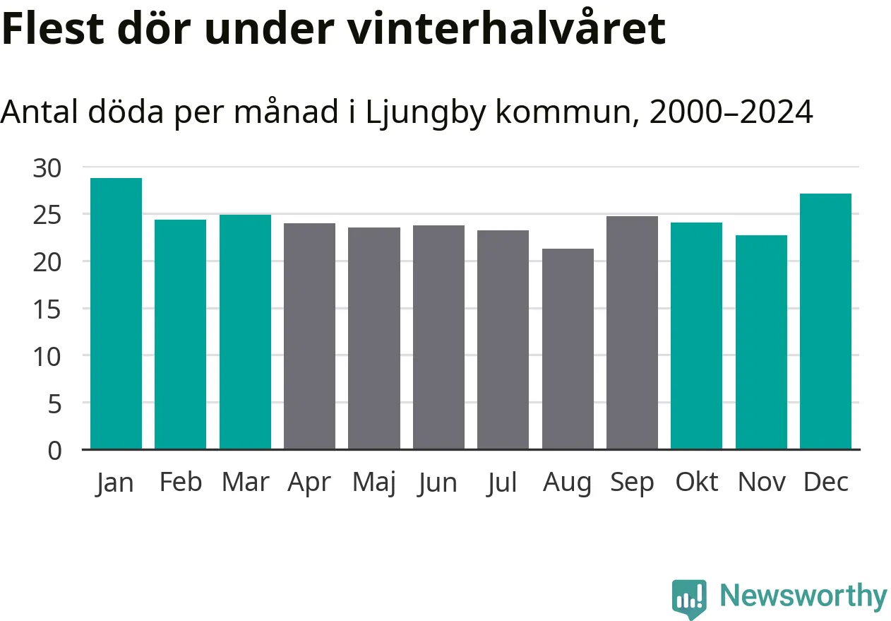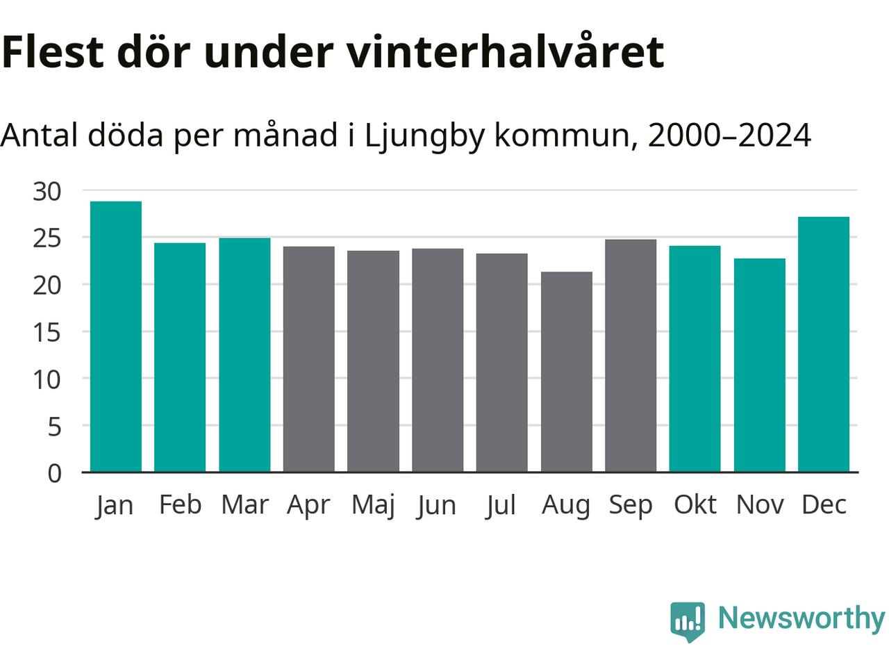 Så är det även i Ljungby. Under de senaste 25 åren har 3 739 personer dött i kommunen under vinterhalvåret, jämfört med 3 457 personer under sommarhalvåret – alltså åtta procent fler.