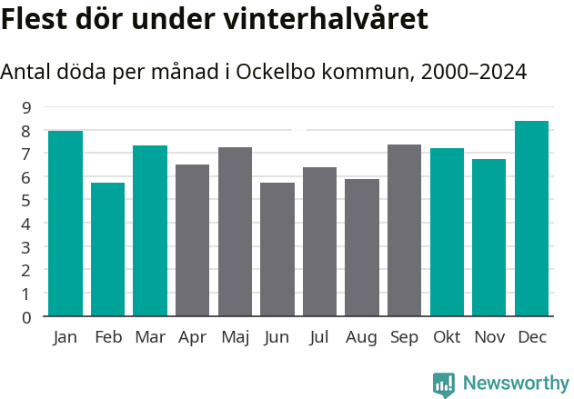 Så är det även i Ockelbo. Under de senaste 25 åren har 1 044 personer dött i kommunen under vinterhalvåret, jämfört med 984 personer under sommarhalvåret – alltså sex procent fler.
