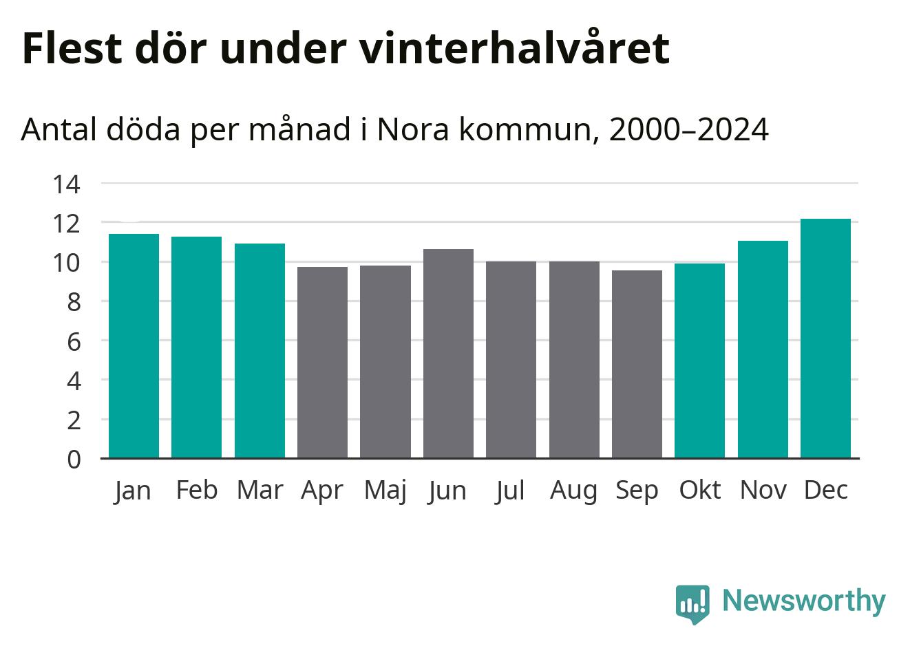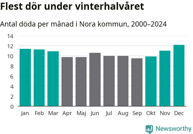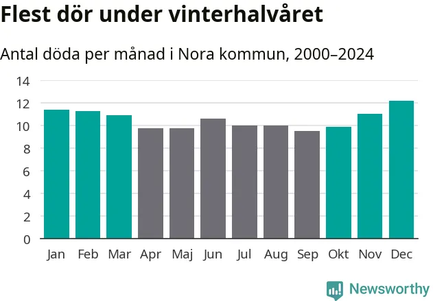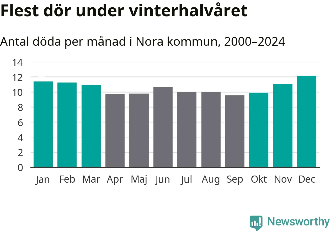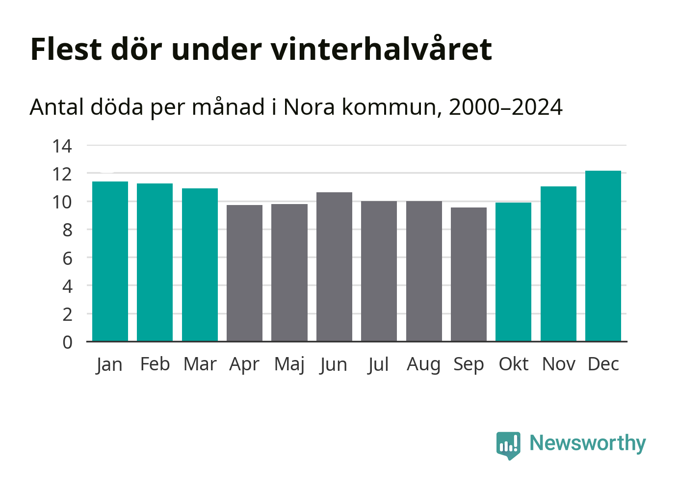 Så är det även i Nora. Under de senaste 25 åren har 1 636 personer dött i kommunen under vinterhalvåret, jämfört med 1 474 personer under sommarhalvåret – alltså elva procent fler.