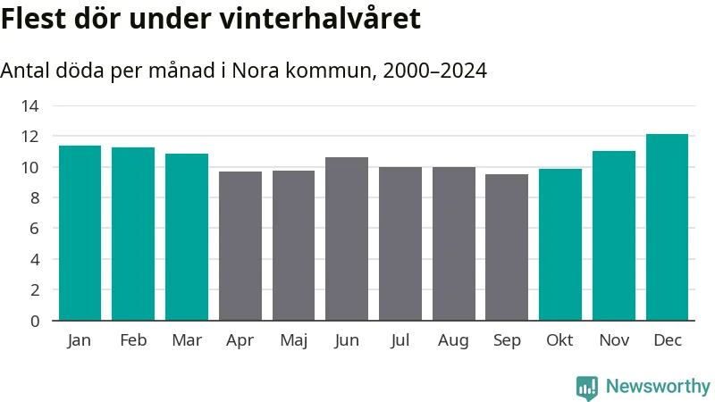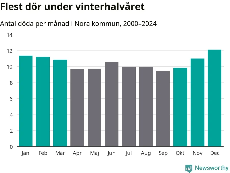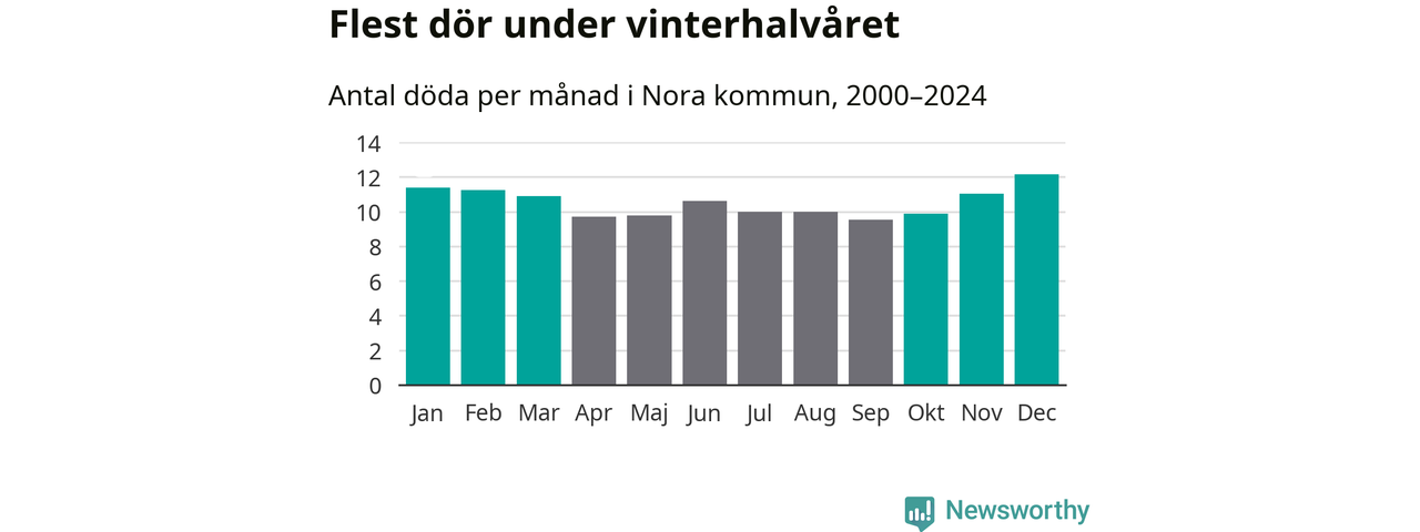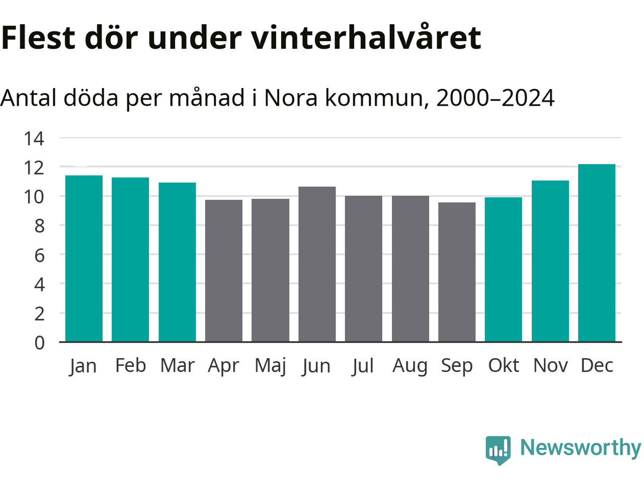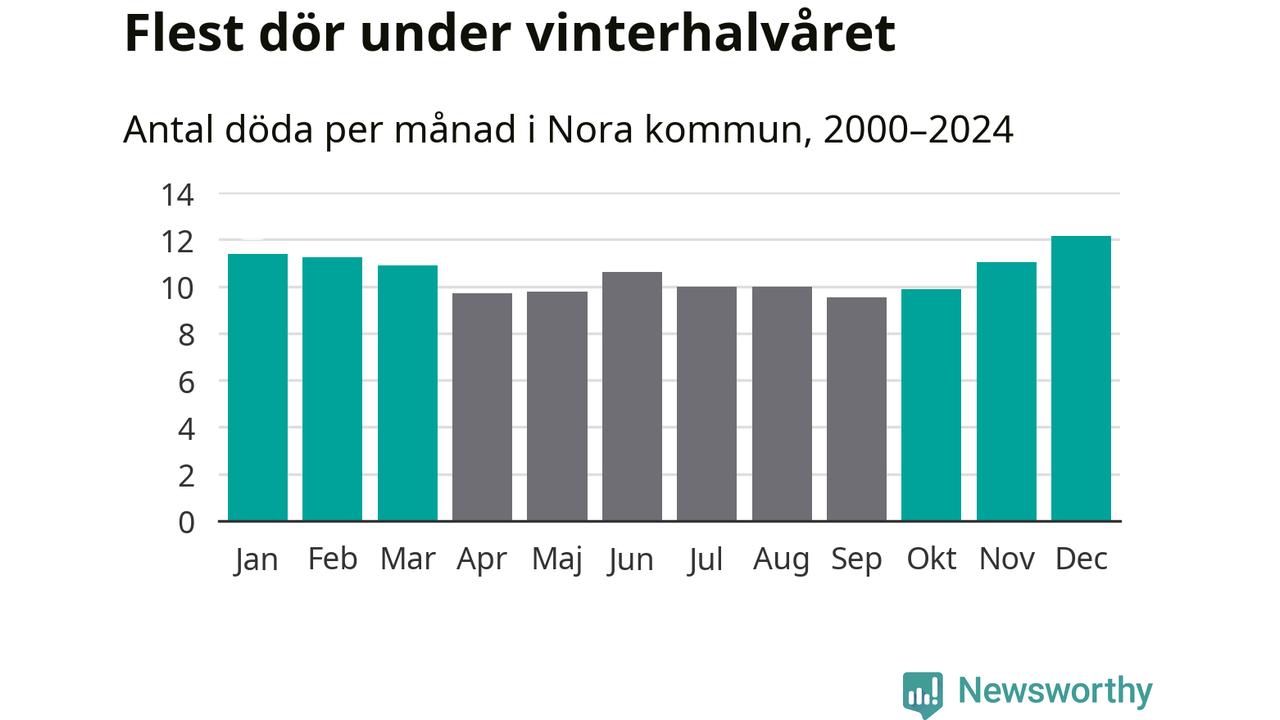 Så är det även i Nora. Under de senaste 25 åren har 1 636 personer dött i kommunen under vinterhalvåret, jämfört med 1 474 personer under sommarhalvåret – alltså elva procent fler.