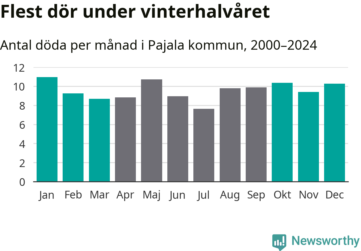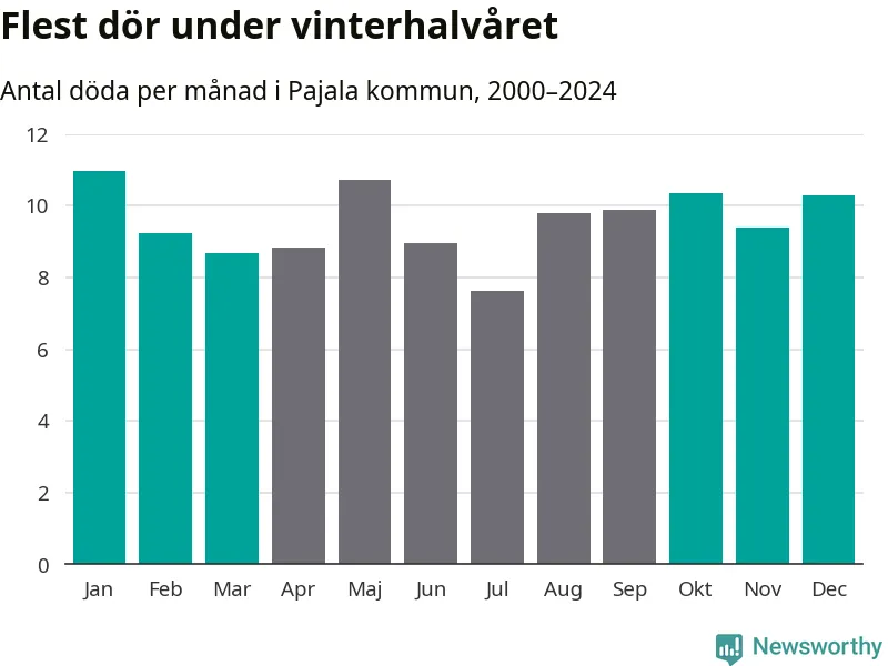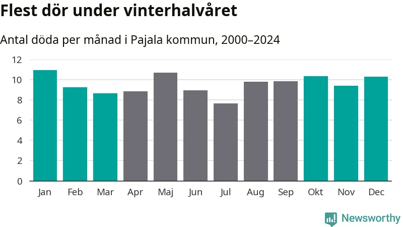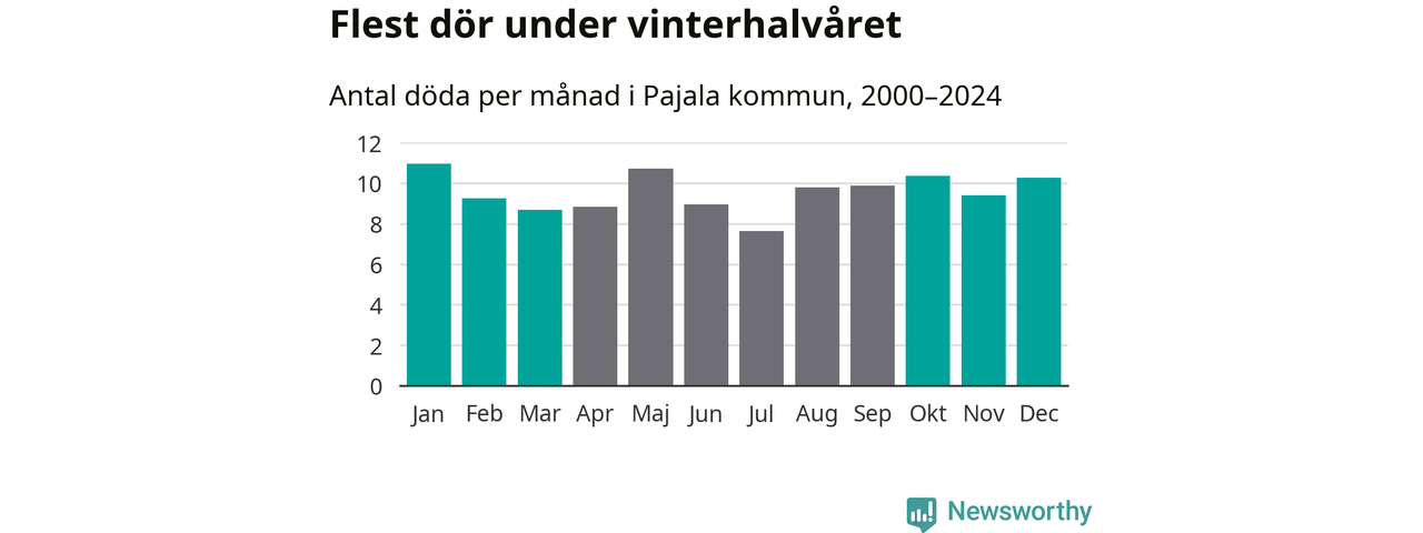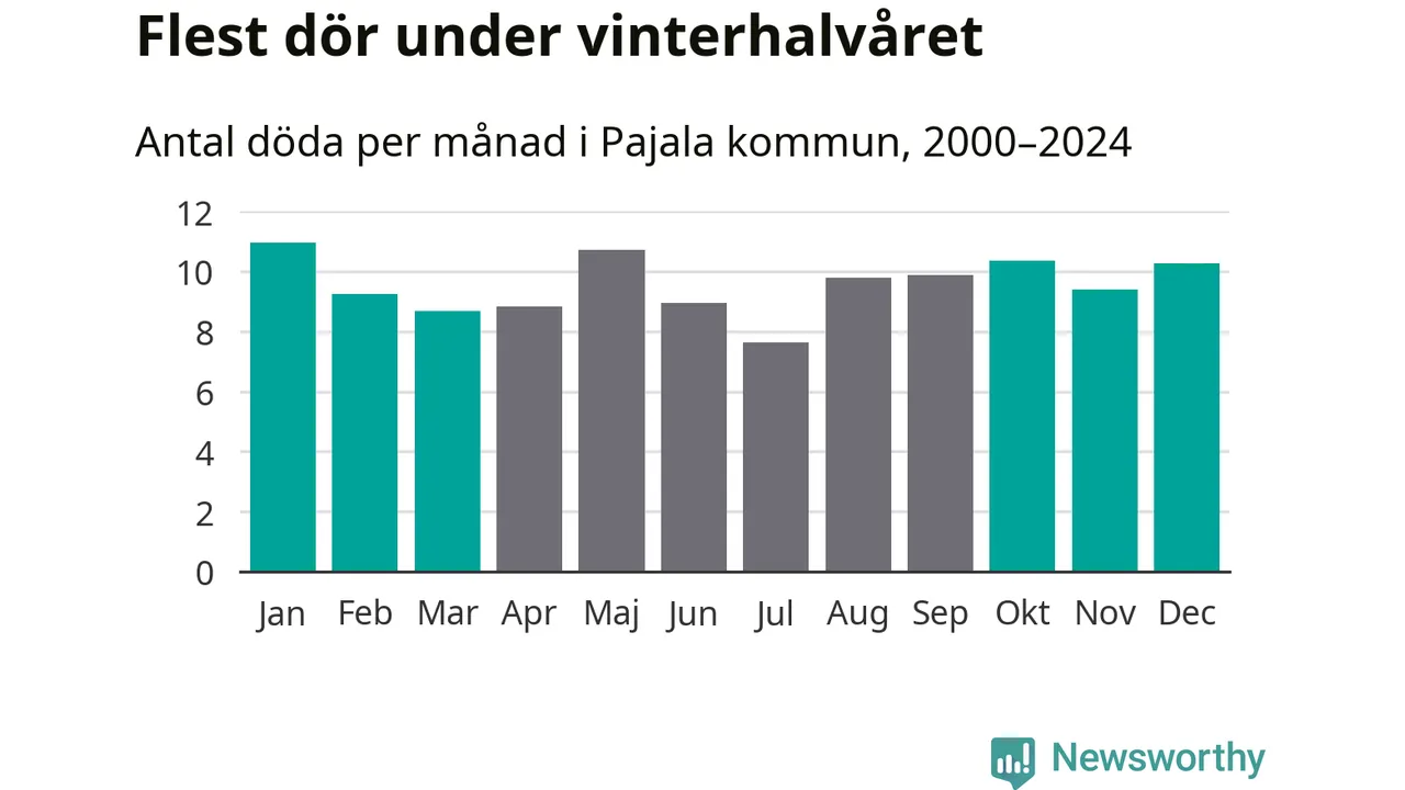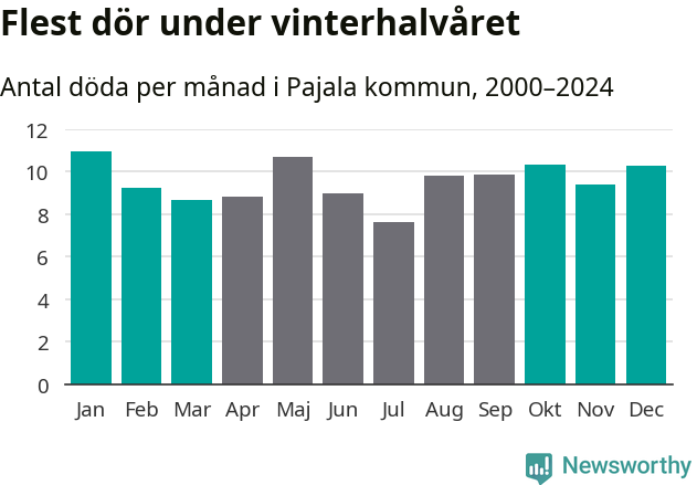 Så är det även i Pajala, men här är skillnaden i dödlighet mellan vinter- och sommarhalvåret mindre uttalad än i landet som helhet. Endast sju personer skiljer säsongerna från varandra, med en liten övervikt på vinterhalvåret.