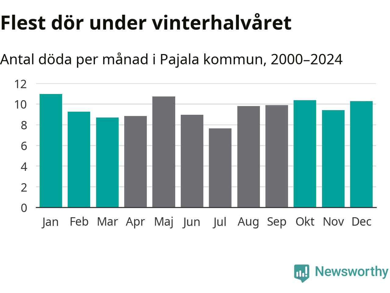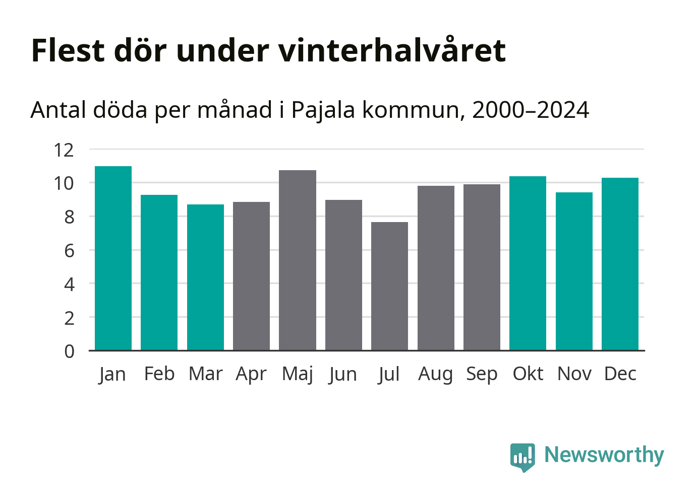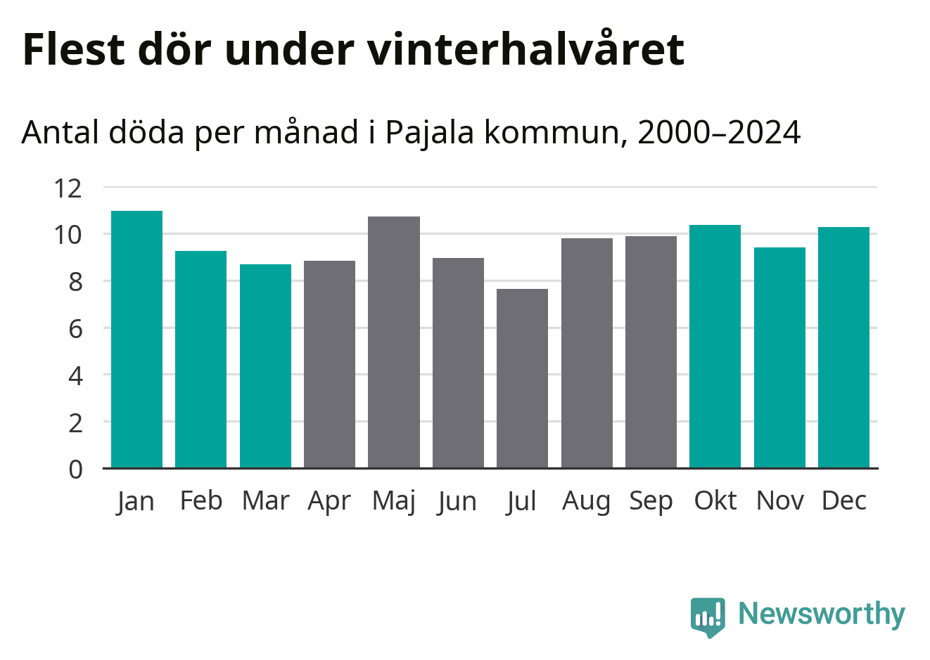 Så är det även i Pajala, men här är skillnaden i dödlighet mellan vinter- och sommarhalvåret mindre uttalad än i landet som helhet. Endast sju personer skiljer säsongerna från varandra, med en liten övervikt på vinterhalvåret.
