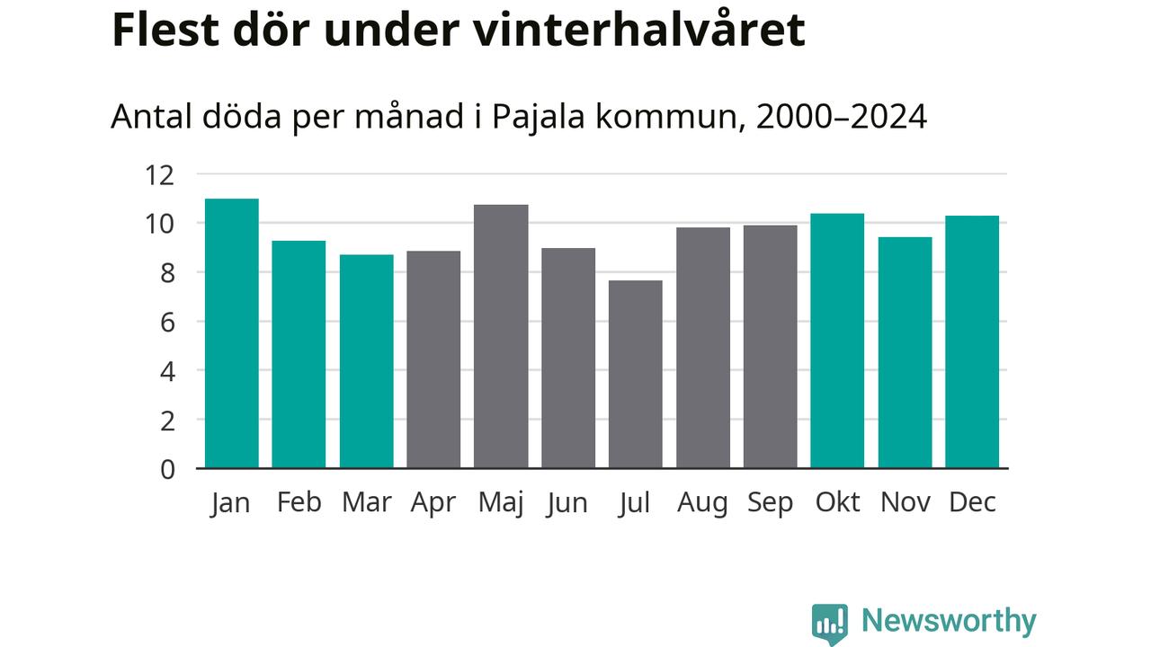 I landet som helhet är det veckorna kring årsskiftet som är de allra dödligaste. I Pajala har flest istället dött vecka 7. Sammanlagt under de senaste 25 åren handlar det om 77 personer, vilket är 40 procent fler än snittet för resten av året.
