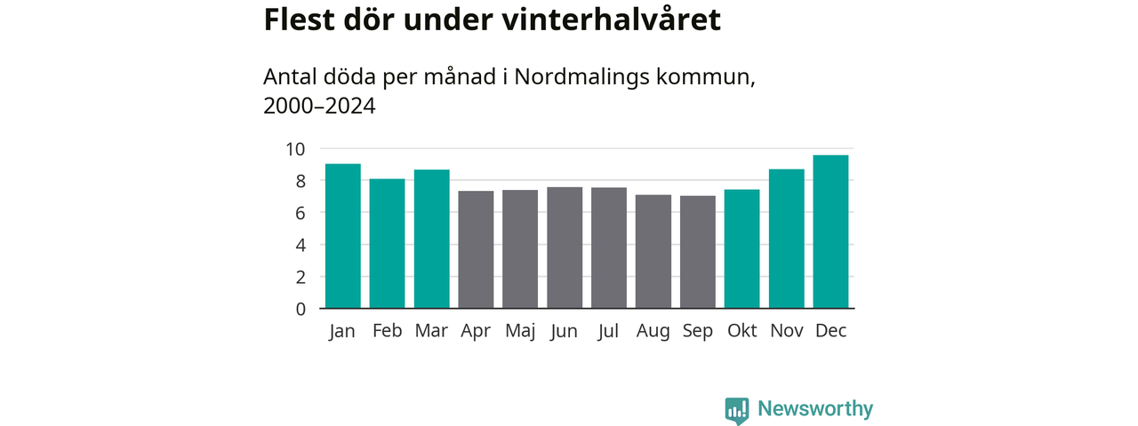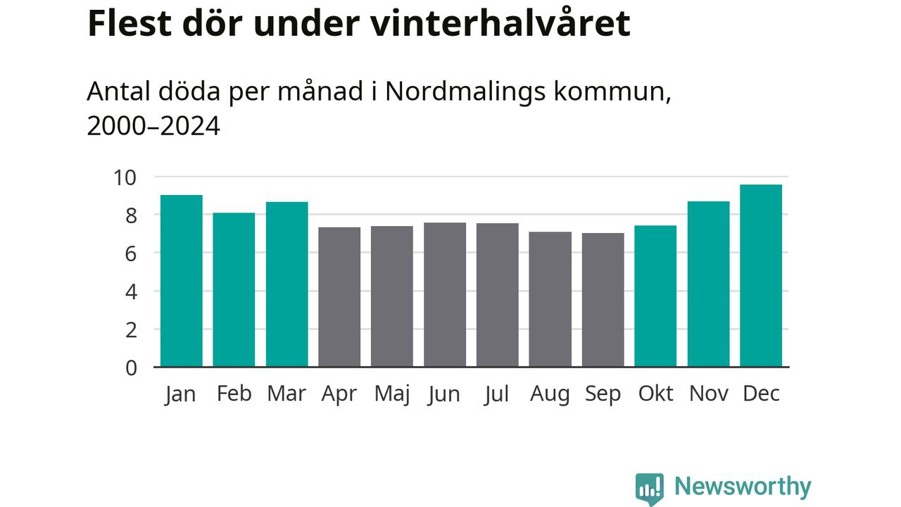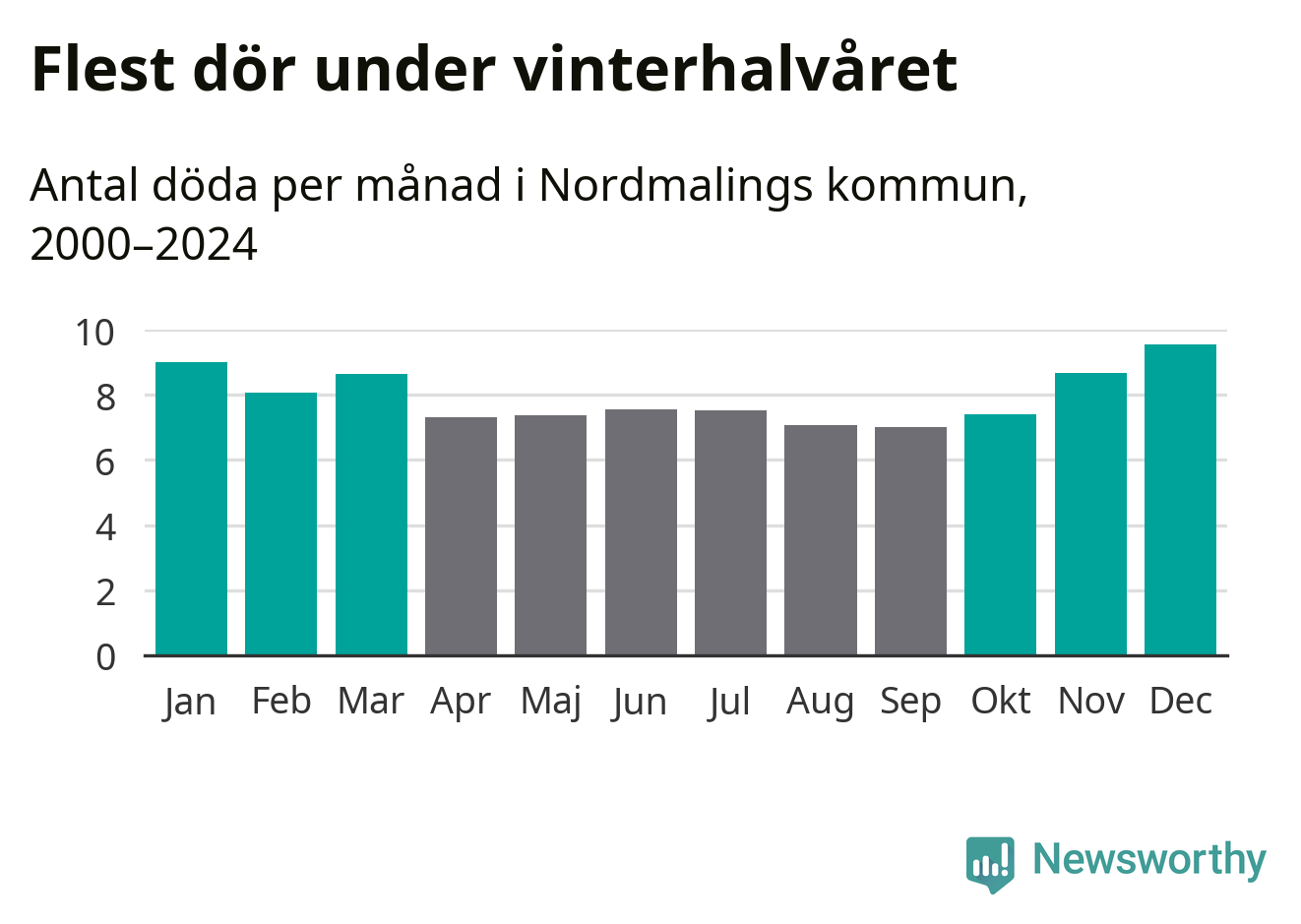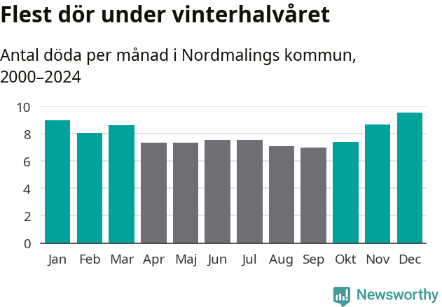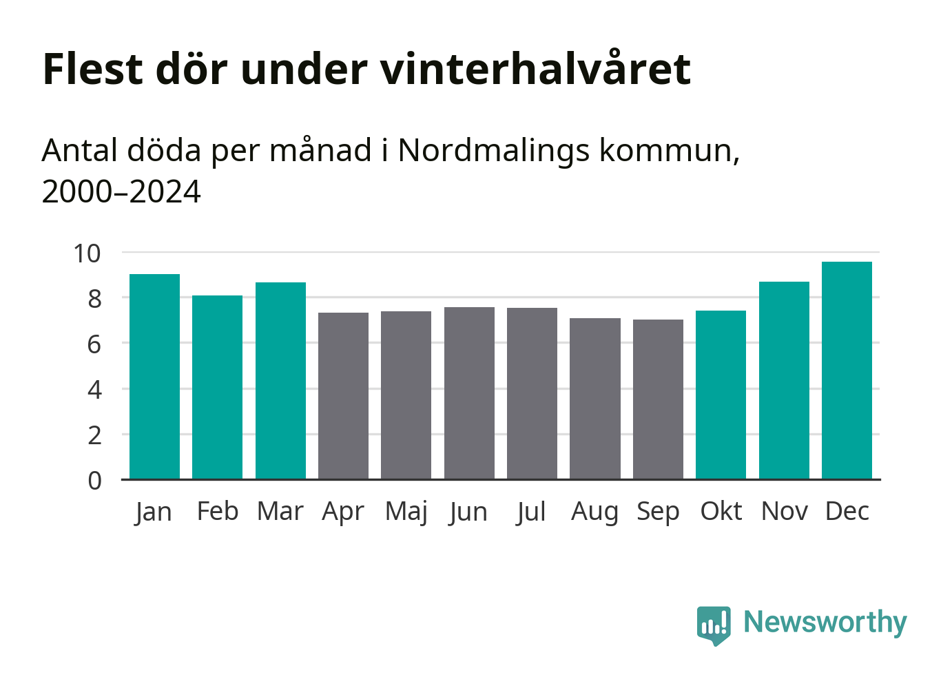 Så är det även i Nordmaling. Under de senaste 25 åren har 1 270 personer dött i kommunen under vinterhalvåret, jämfört med 1 084 personer under sommarhalvåret – alltså 17 procent fler.