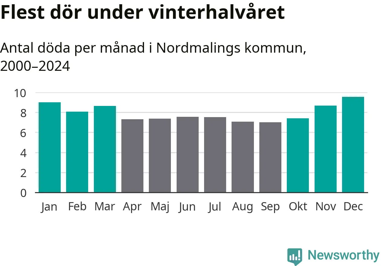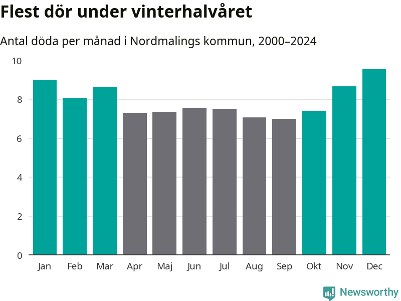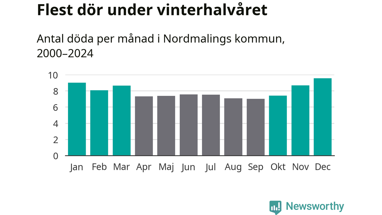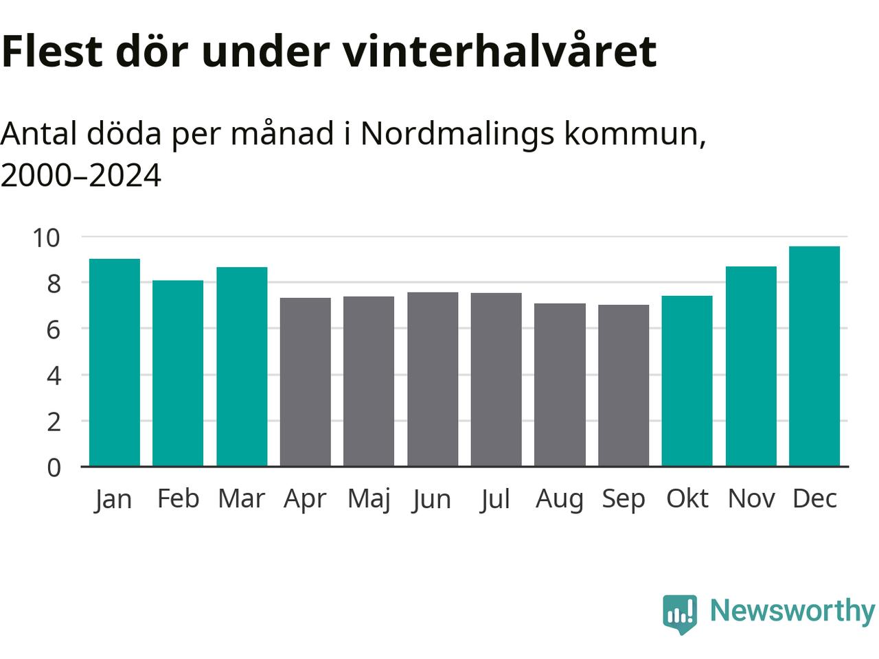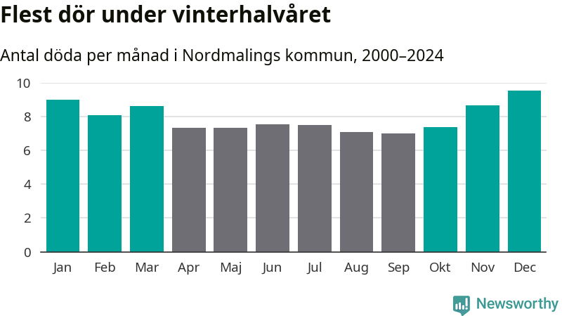 Så är det även i Nordmaling. Under de senaste 25 åren har 1 270 personer dött i kommunen under vinterhalvåret, jämfört med 1 084 personer under sommarhalvåret – alltså 17 procent fler.