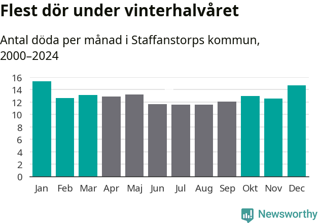 I landet som helhet är det veckorna kring årsskiftet som är de allra dödligaste. Så är det även i Staffanstorp, där den dödligaste perioden infaller under vecka 2, enligt statistik för de senaste 25 åren. Sammanlagt handlar det om 92 personer , vilket är 27 procent fler än snittet för resten av året.