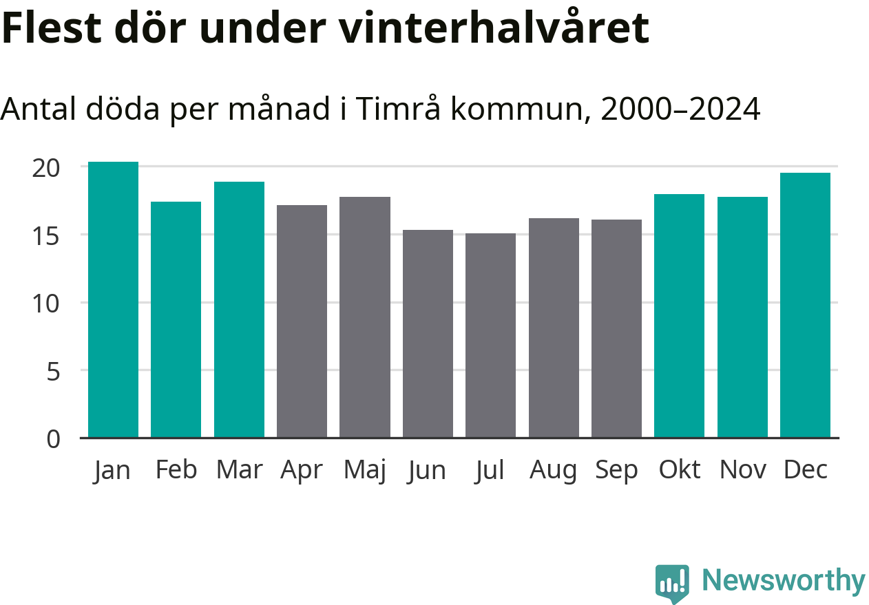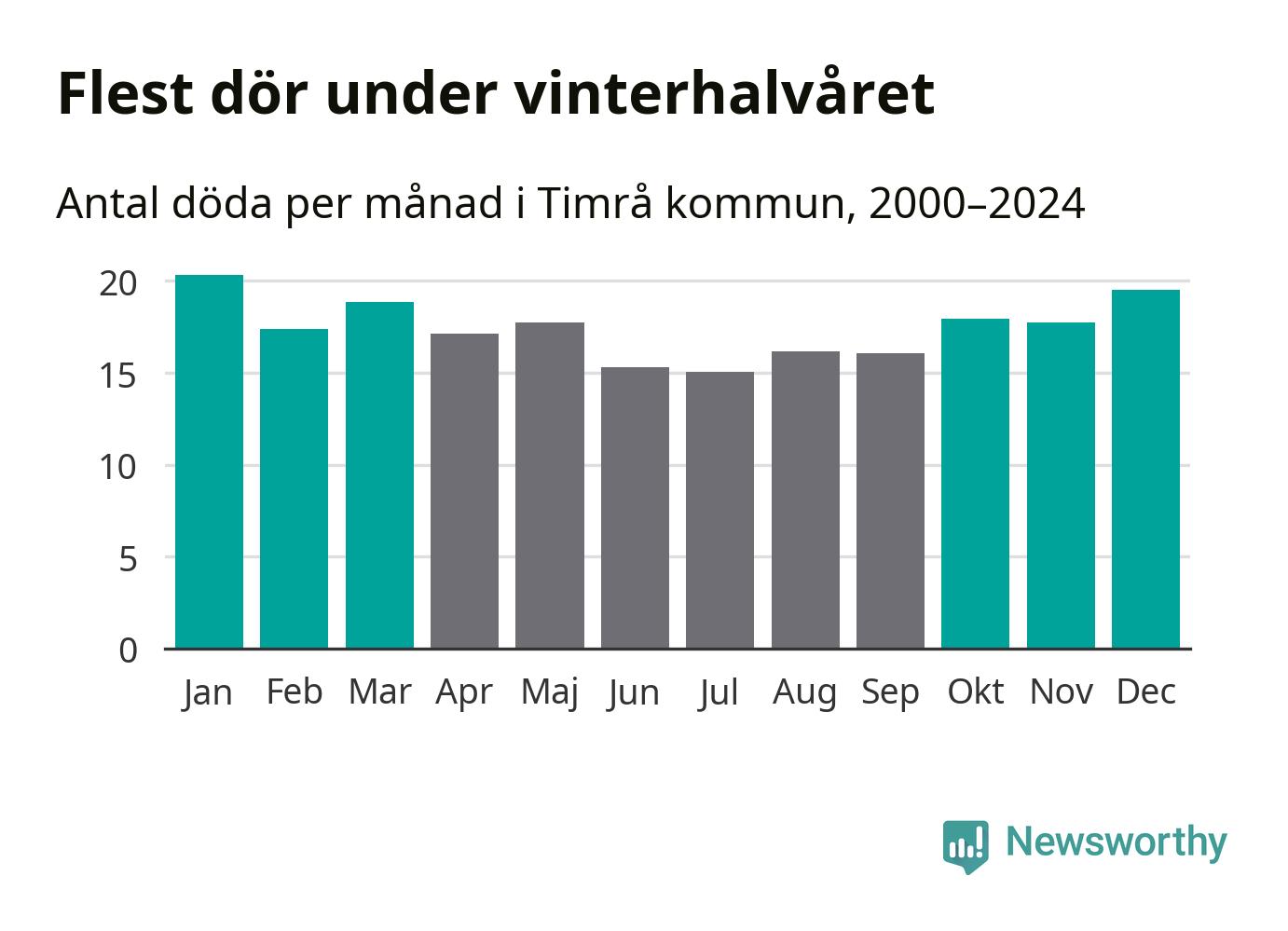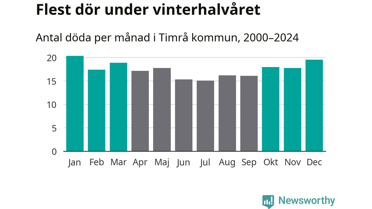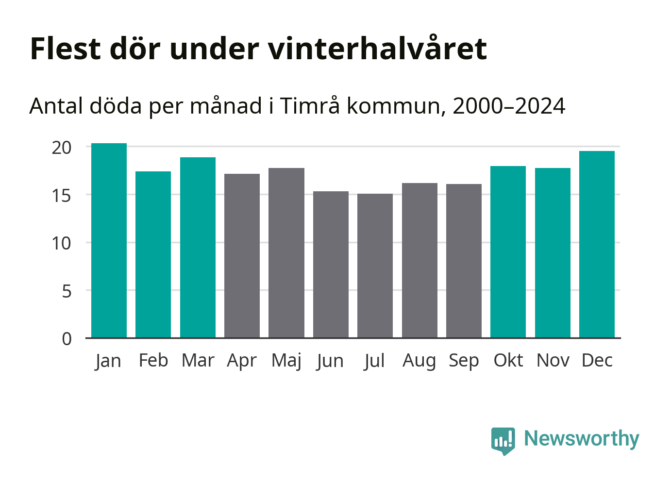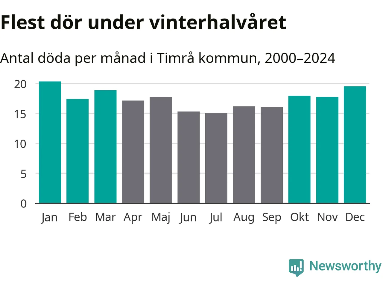 Så är det även i Timrå. Under de senaste 25 åren har 2 748 personer dött i kommunen under vinterhalvåret, jämfört med 2 438 personer under sommarhalvåret – alltså 13 procent fler.