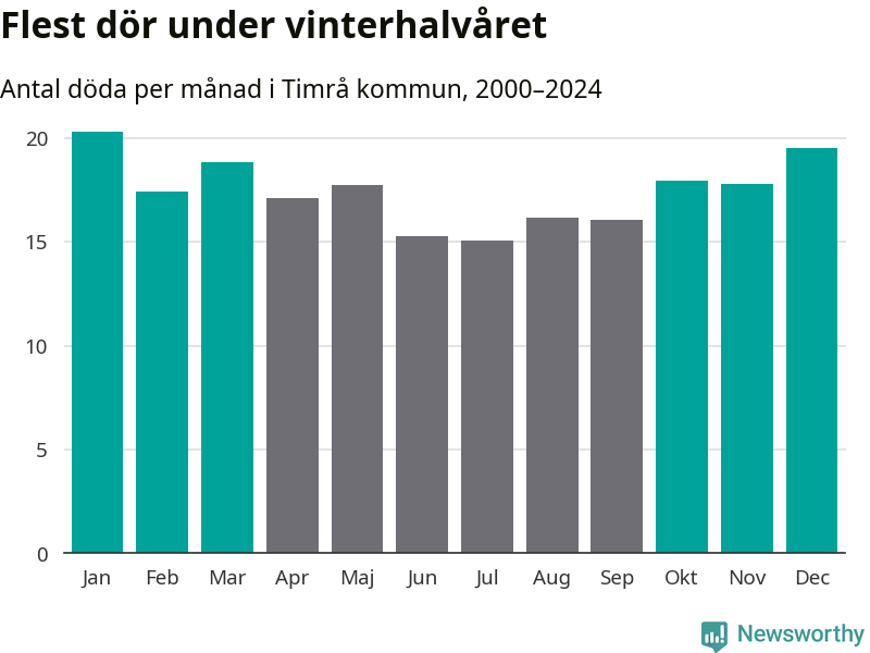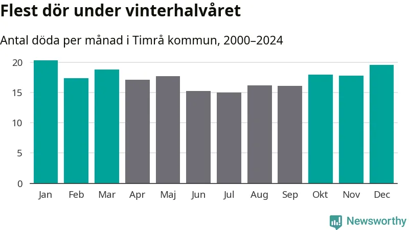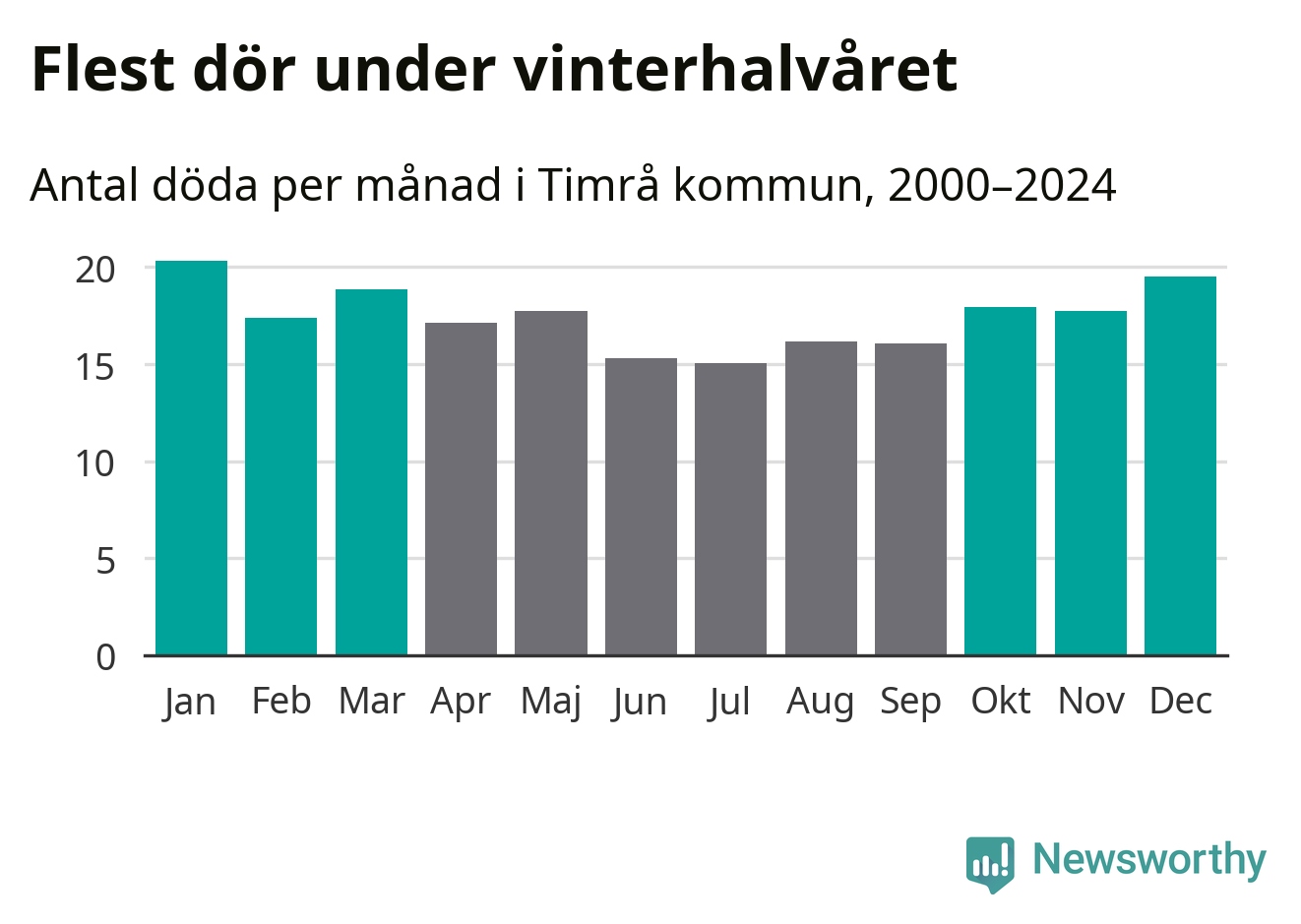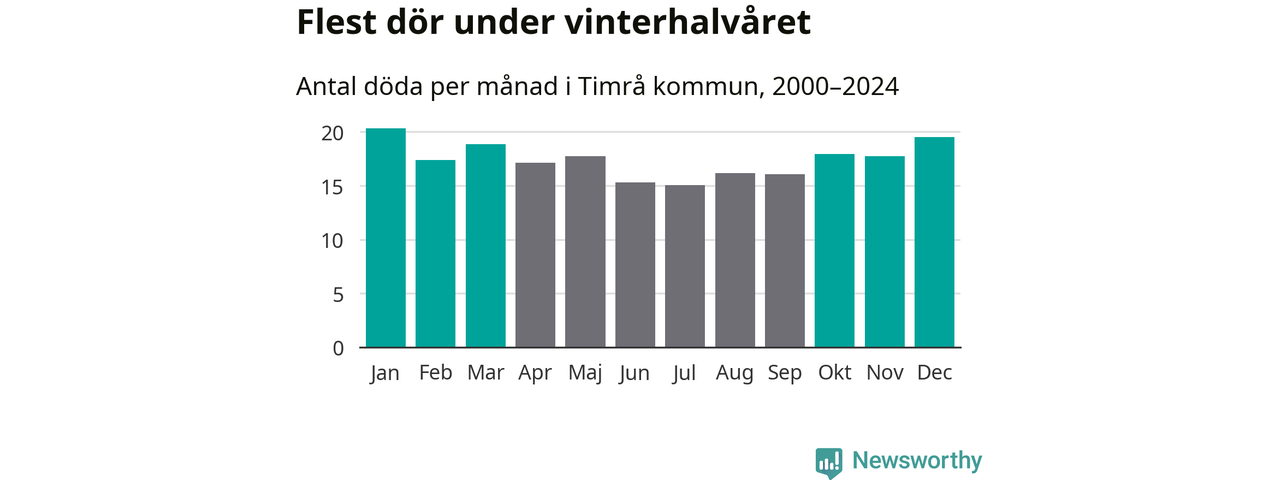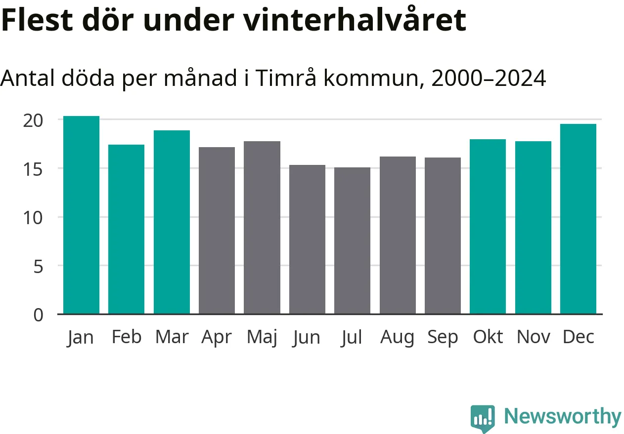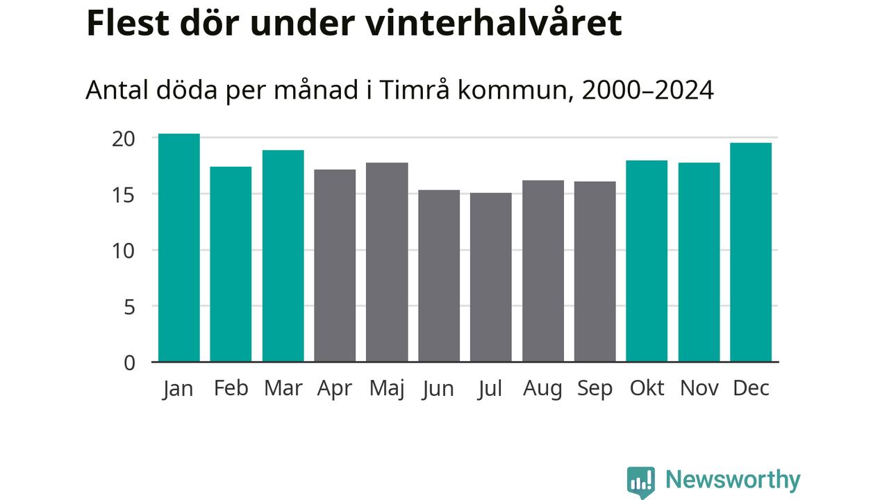 Så är det även i Timrå. Under de senaste 25 åren har 2 748 personer dött i kommunen under vinterhalvåret, jämfört med 2 438 personer under sommarhalvåret – alltså 13 procent fler.