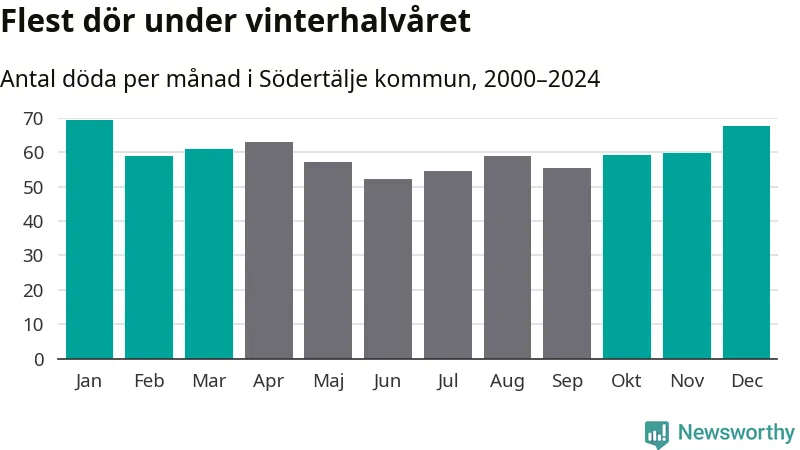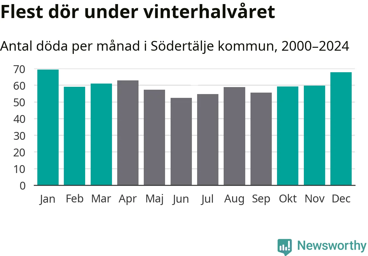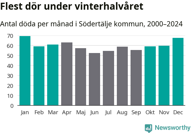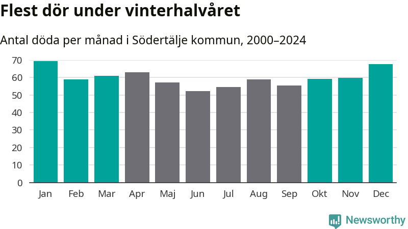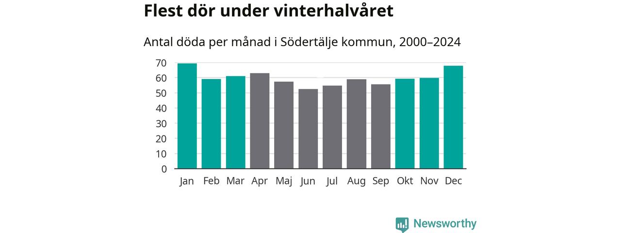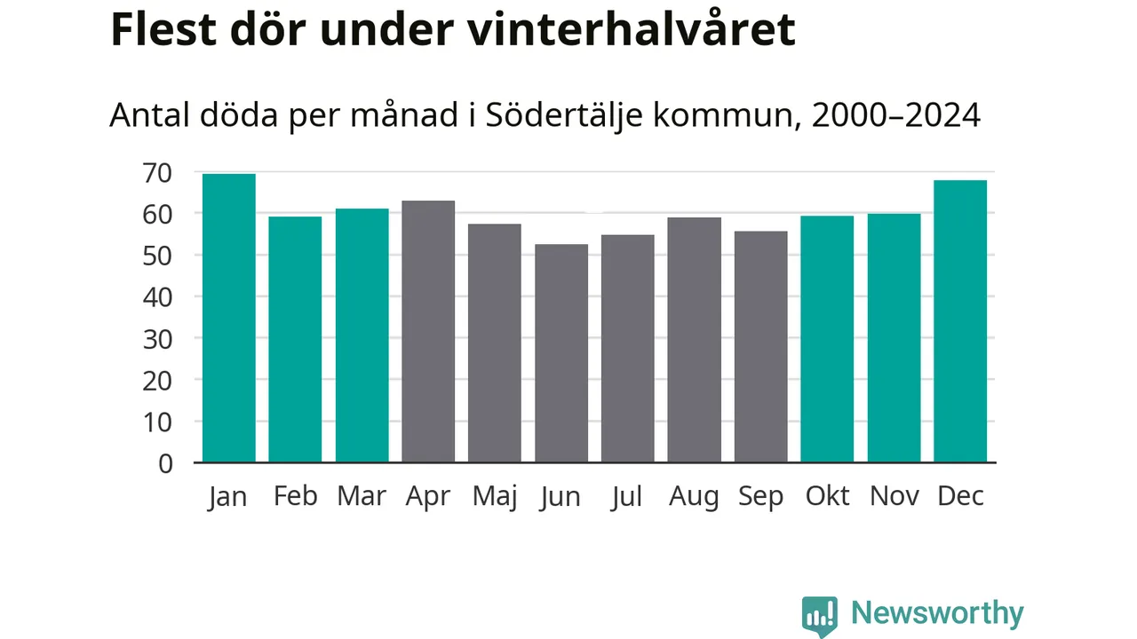 Så är det även i Södertälje. Under de senaste 25 åren har 9 377 personer dött i kommunen under vinterhalvåret, jämfört med 8 357 personer under sommarhalvåret – alltså tolv procent fler.