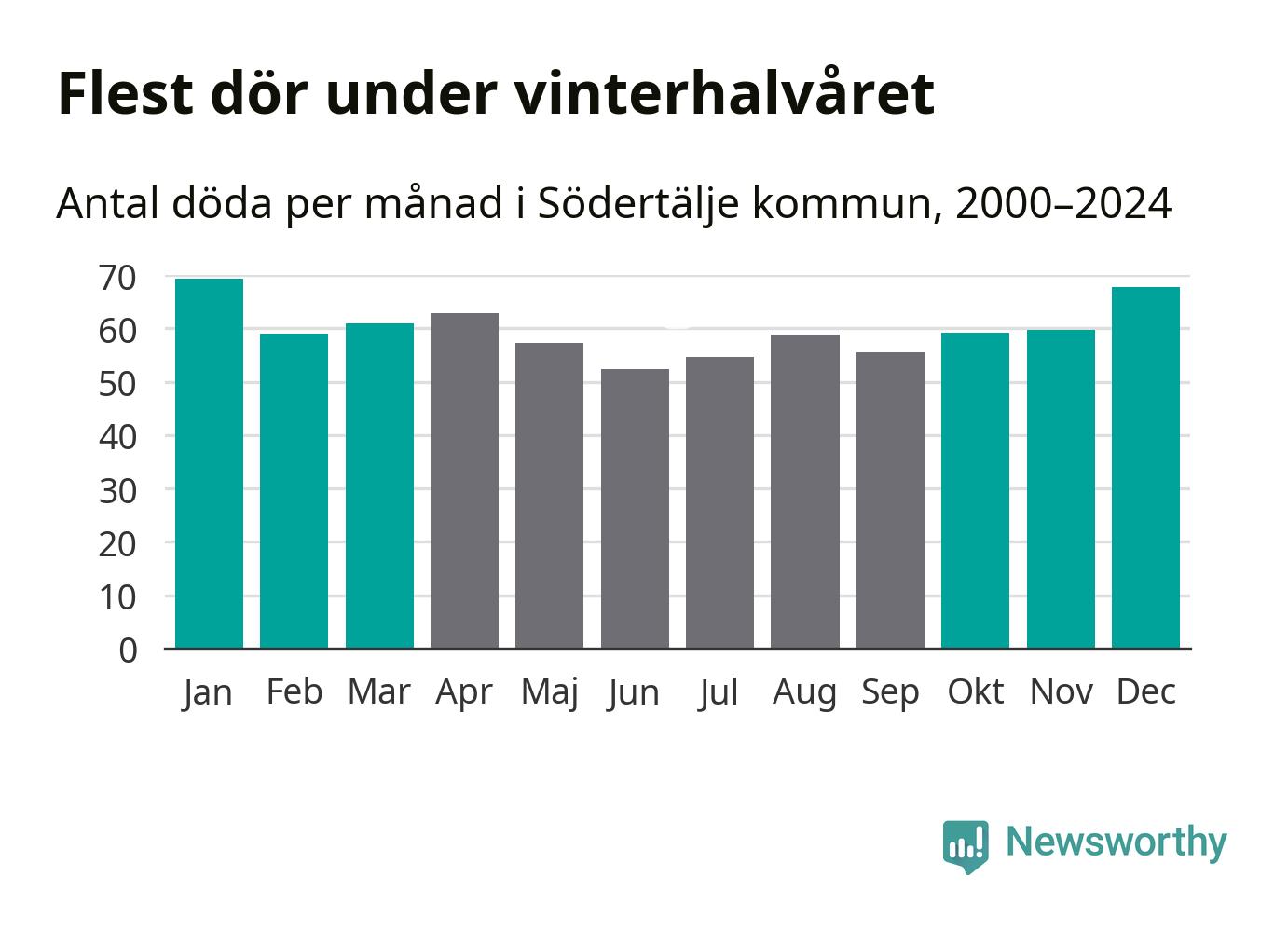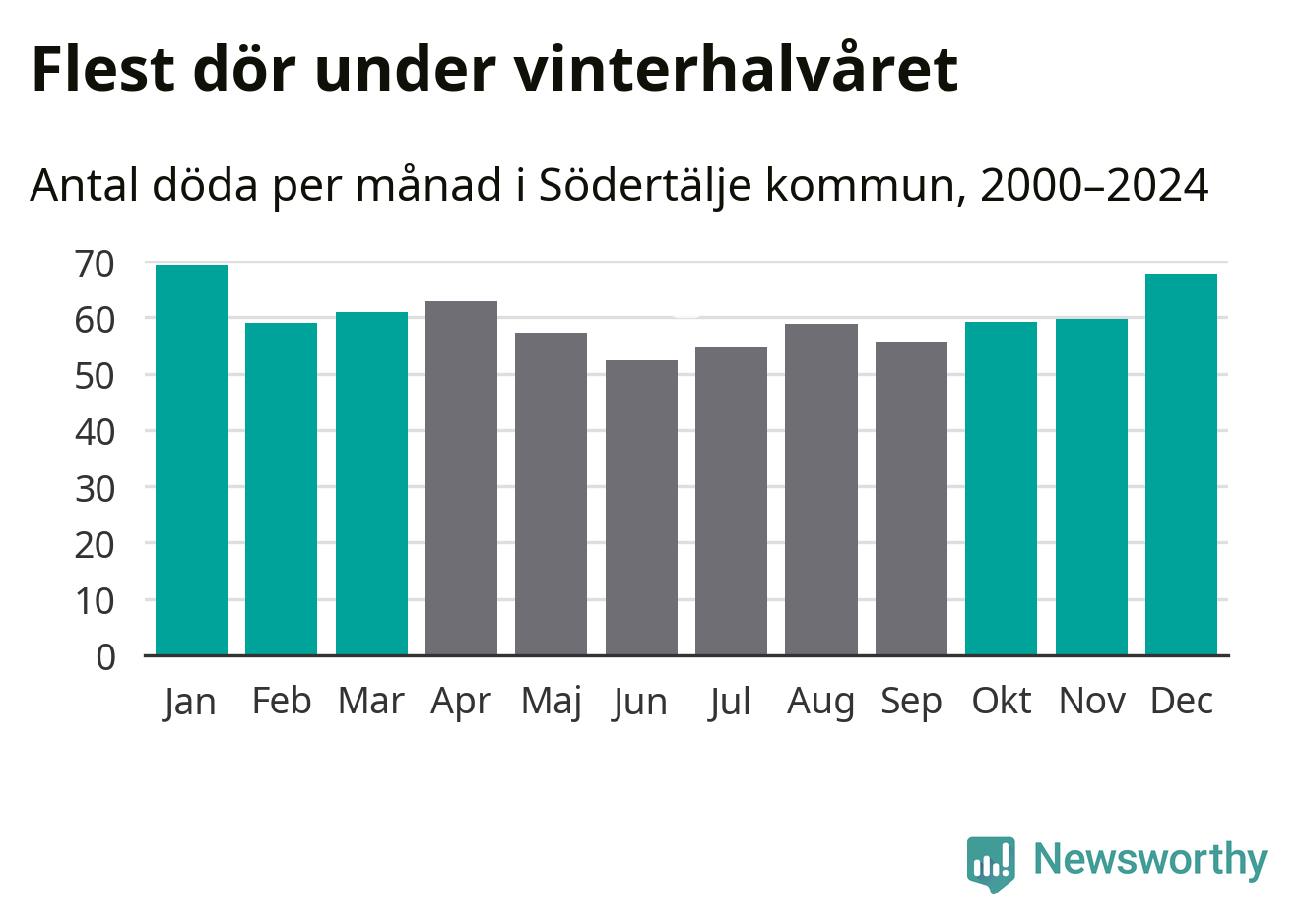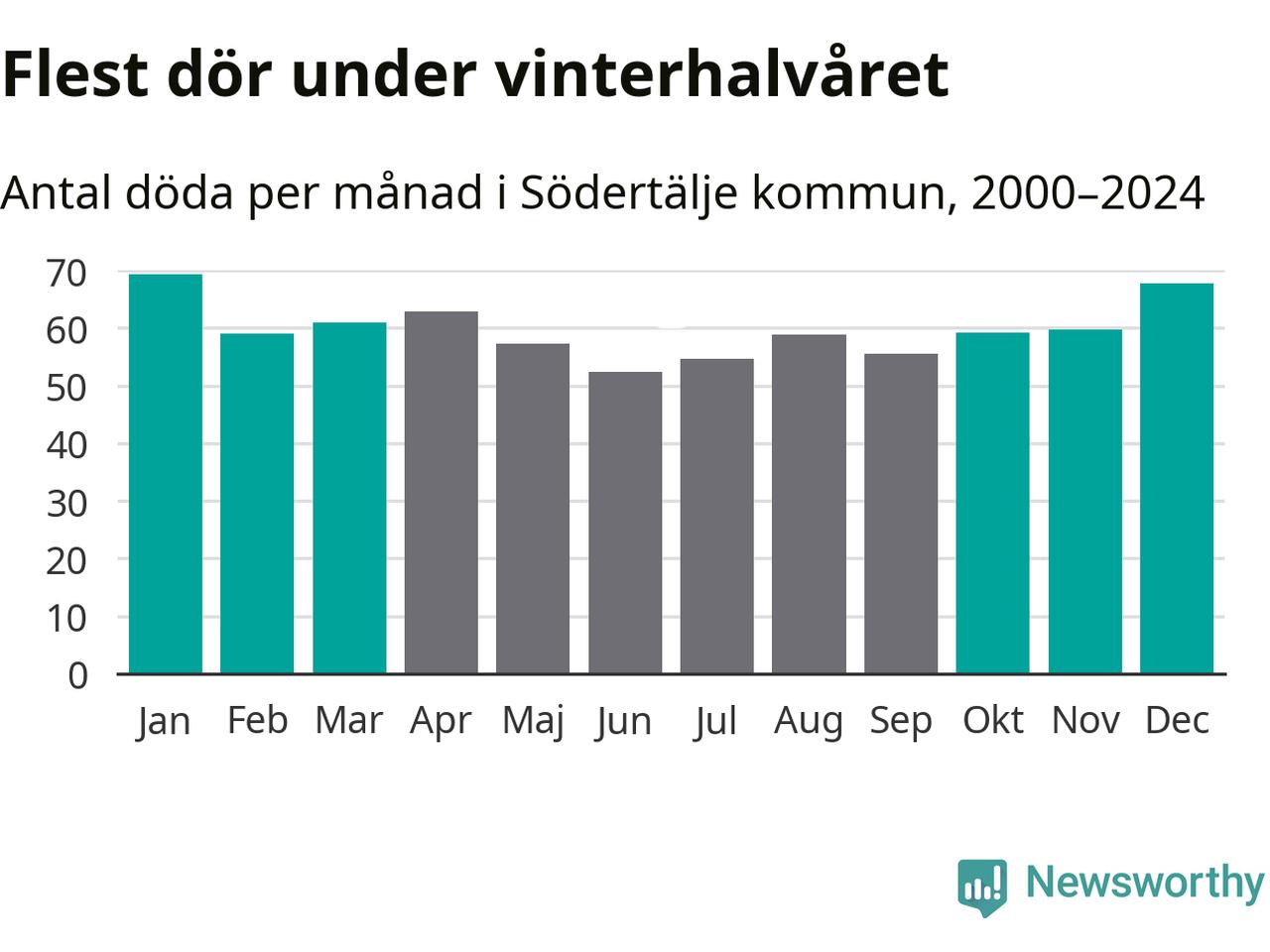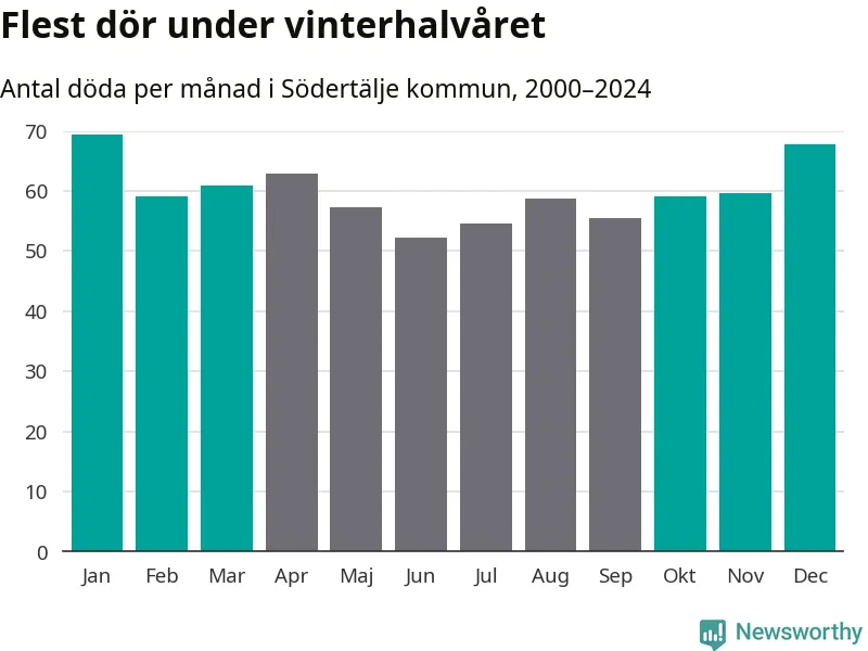 Så är det även i Södertälje. Under de senaste 25 åren har 9 377 personer dött i kommunen under vinterhalvåret, jämfört med 8 357 personer under sommarhalvåret – alltså tolv procent fler.
