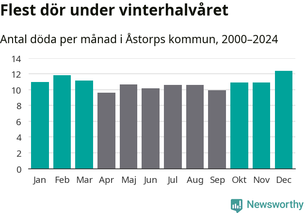 I landet som helhet är det veckorna kring årsskiftet som är de allra dödligaste. I Åstorp har flest istället dött vecka 9. Sammanlagt under de senaste 25 åren handlar det om 75 personer, vilket är 23 procent fler än snittet för resten av året.