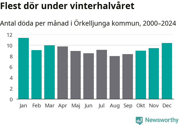 Så är det även i Örkelljunga. Under de senaste 25 åren har 1 478 personer dött i kommunen under vinterhalvåret, jämfört med 1 268 personer under sommarhalvåret – alltså 17 procent fler.
