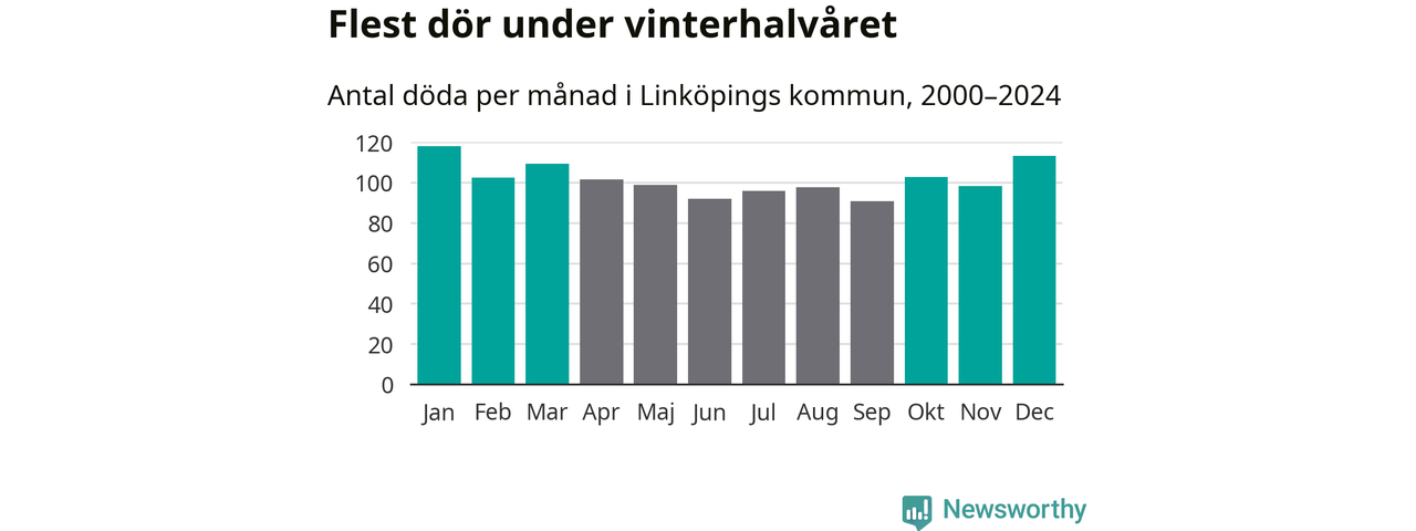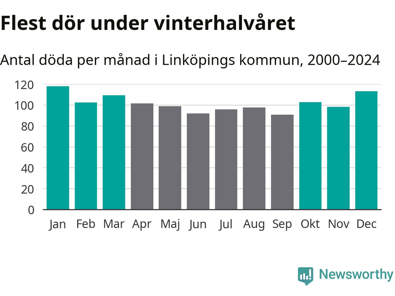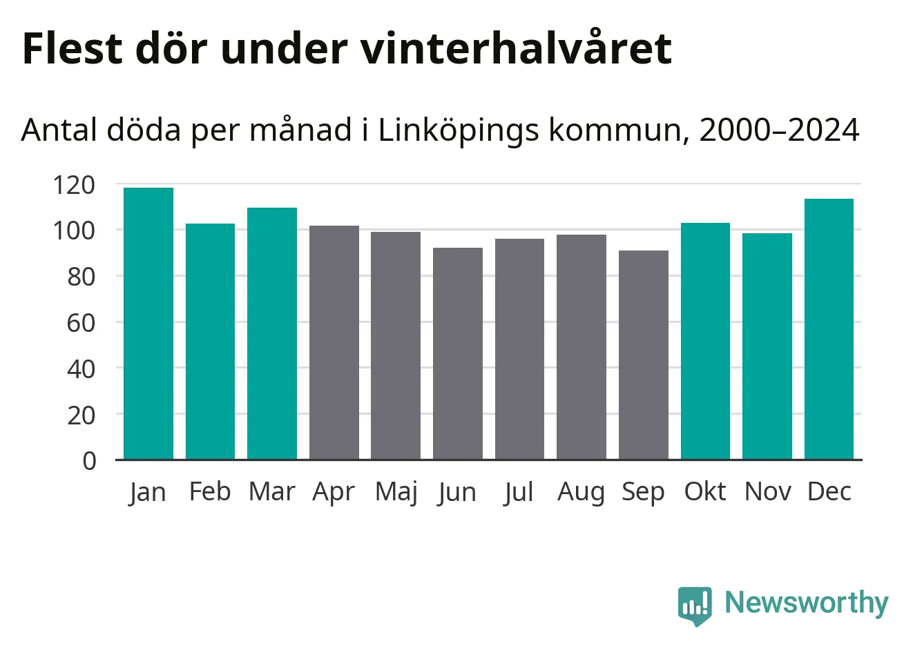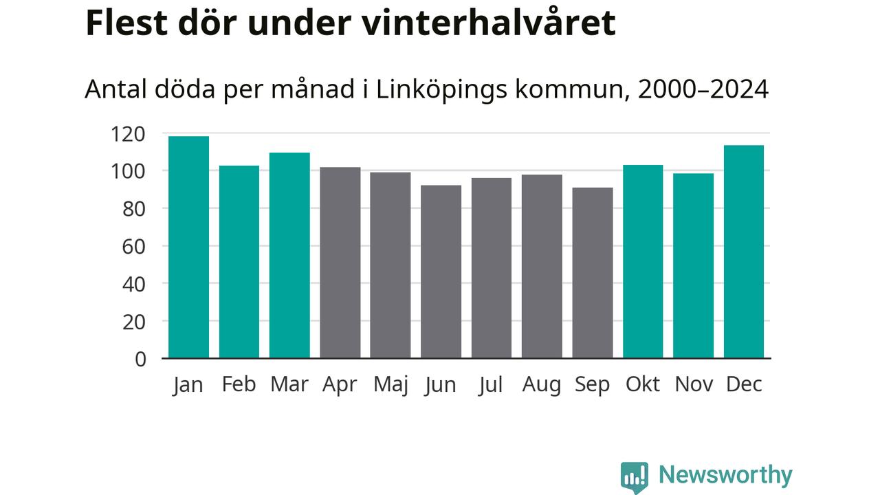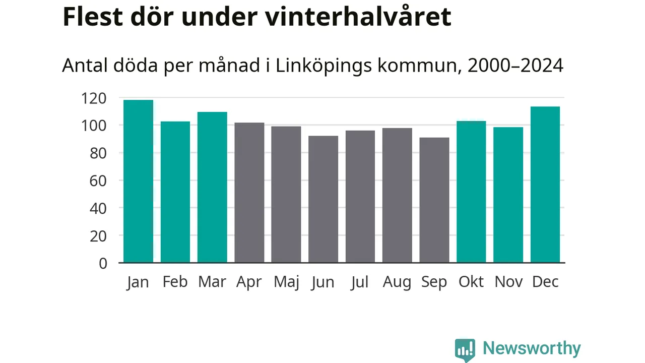 Så är det även i Linköping. Under de senaste 25 åren har 15 829 personer dött i kommunen under vinterhalvåret, jämfört med 14 236 personer under sommarhalvåret – alltså elva procent fler.