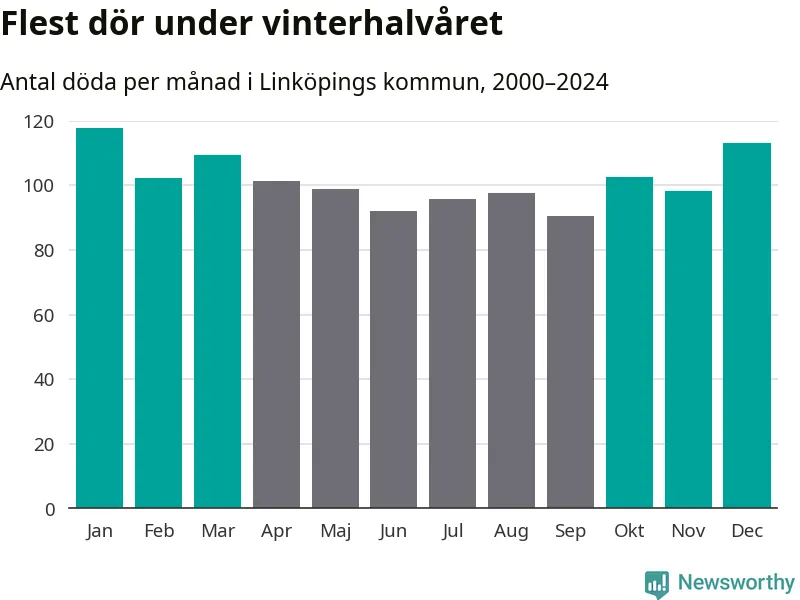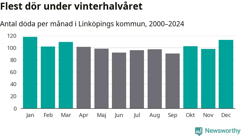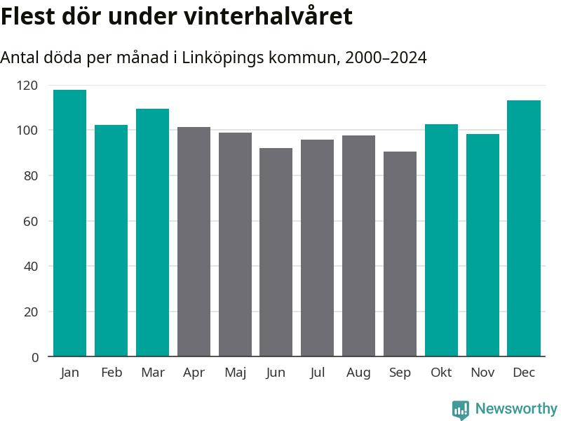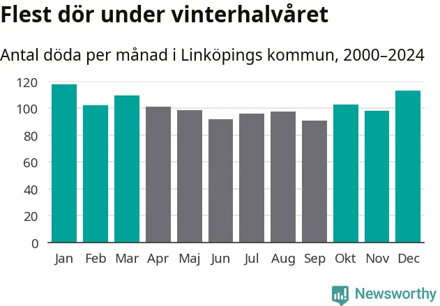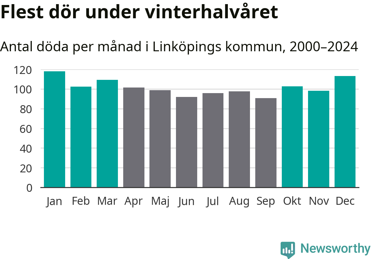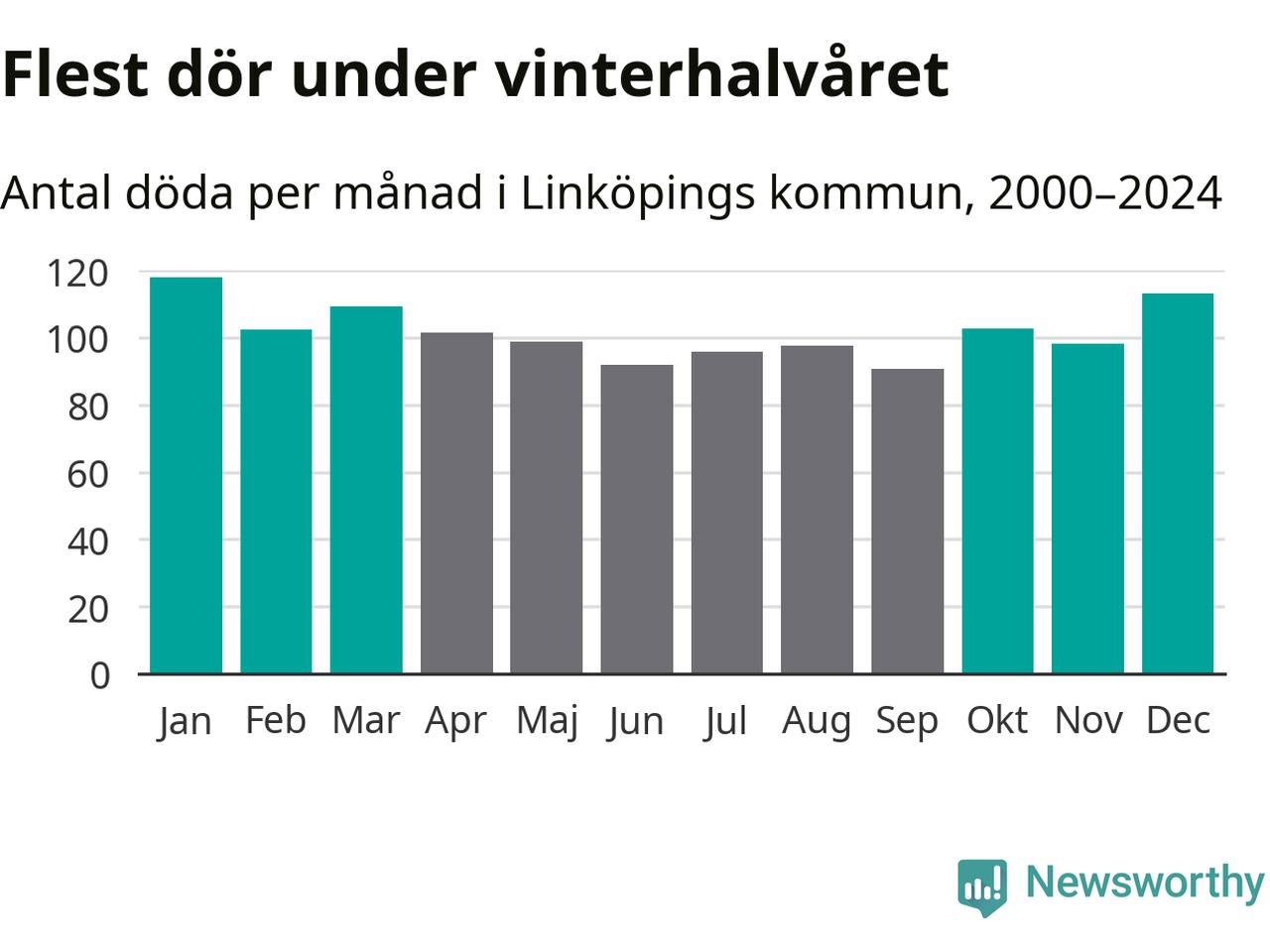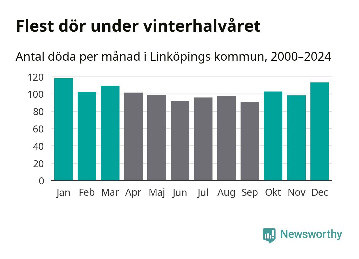 Så är det även i Linköping. Under de senaste 25 åren har 15 829 personer dött i kommunen under vinterhalvåret, jämfört med 14 236 personer under sommarhalvåret – alltså elva procent fler.