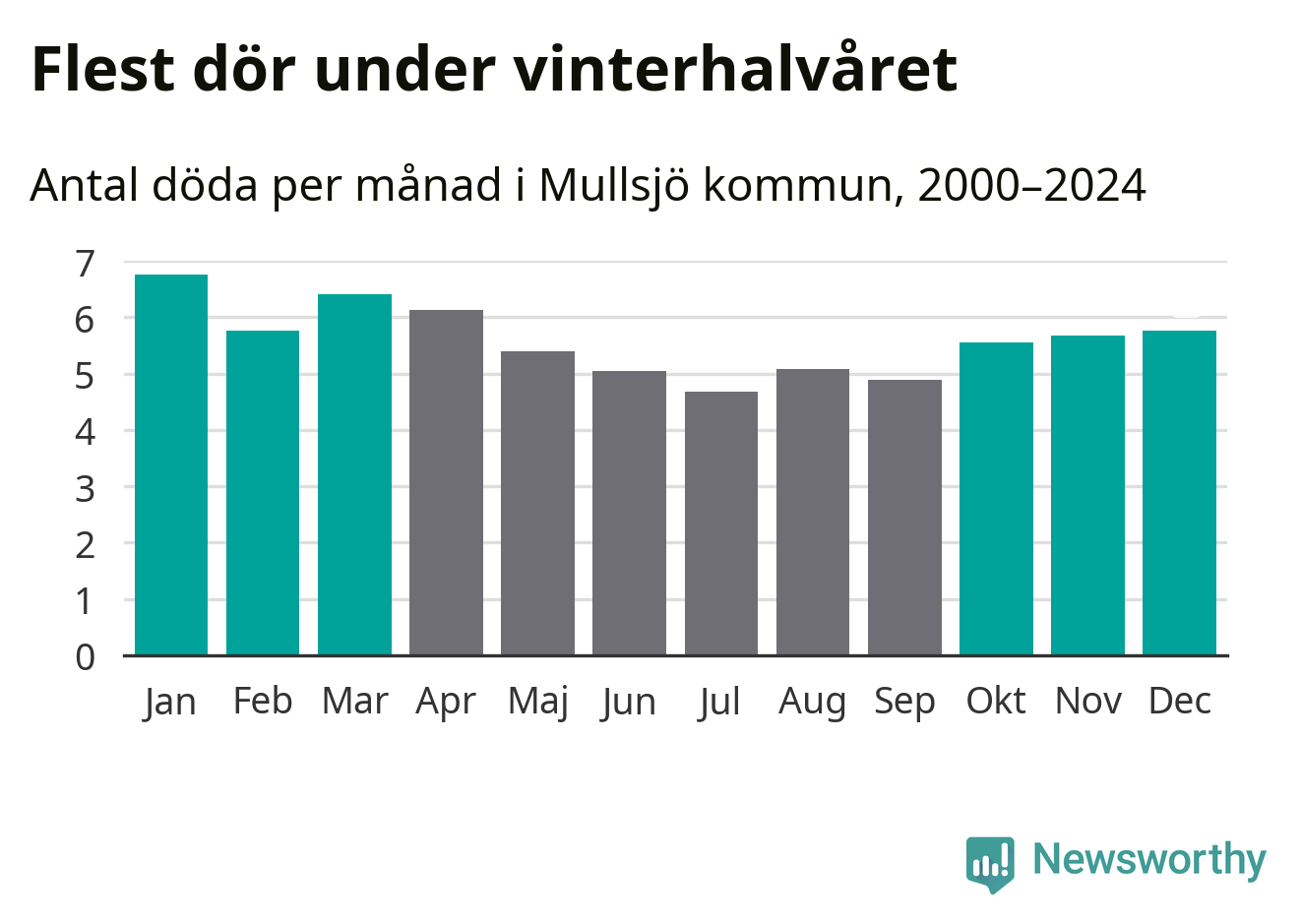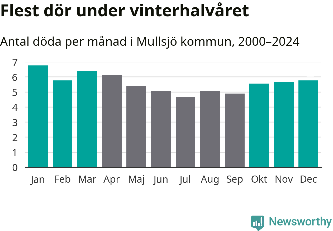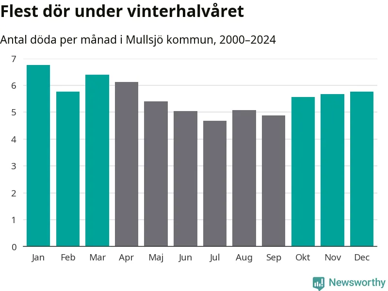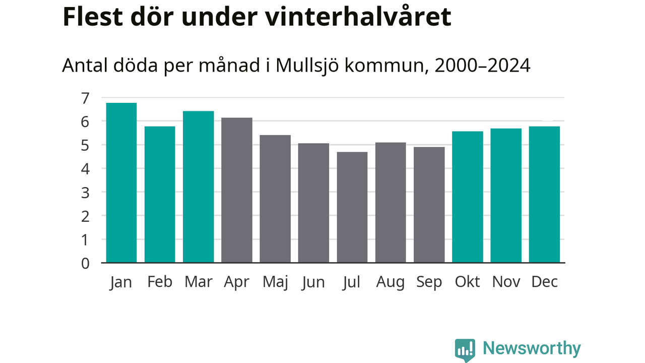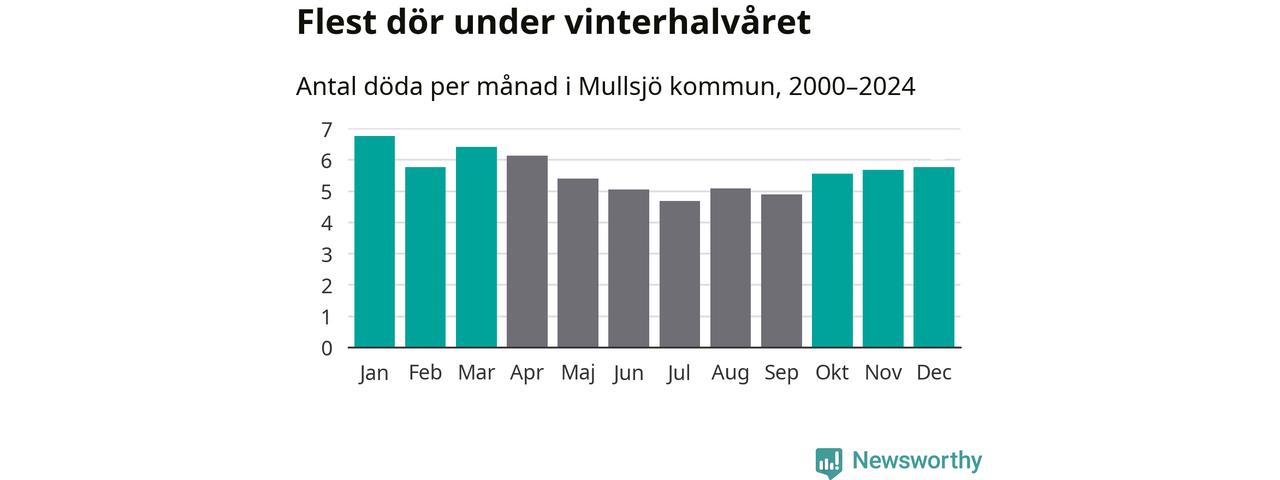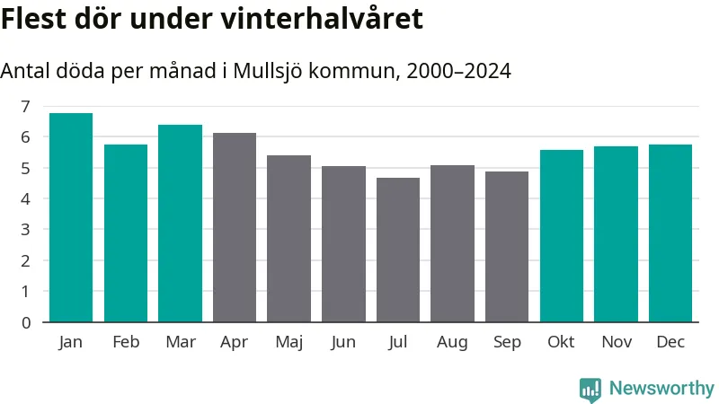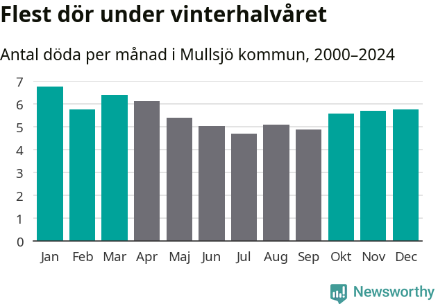 Så är det även i Mullsjö. Under de senaste 25 åren har 895 personer dött i kommunen under vinterhalvåret, jämfört med 768 personer under sommarhalvåret – alltså 17 procent fler.