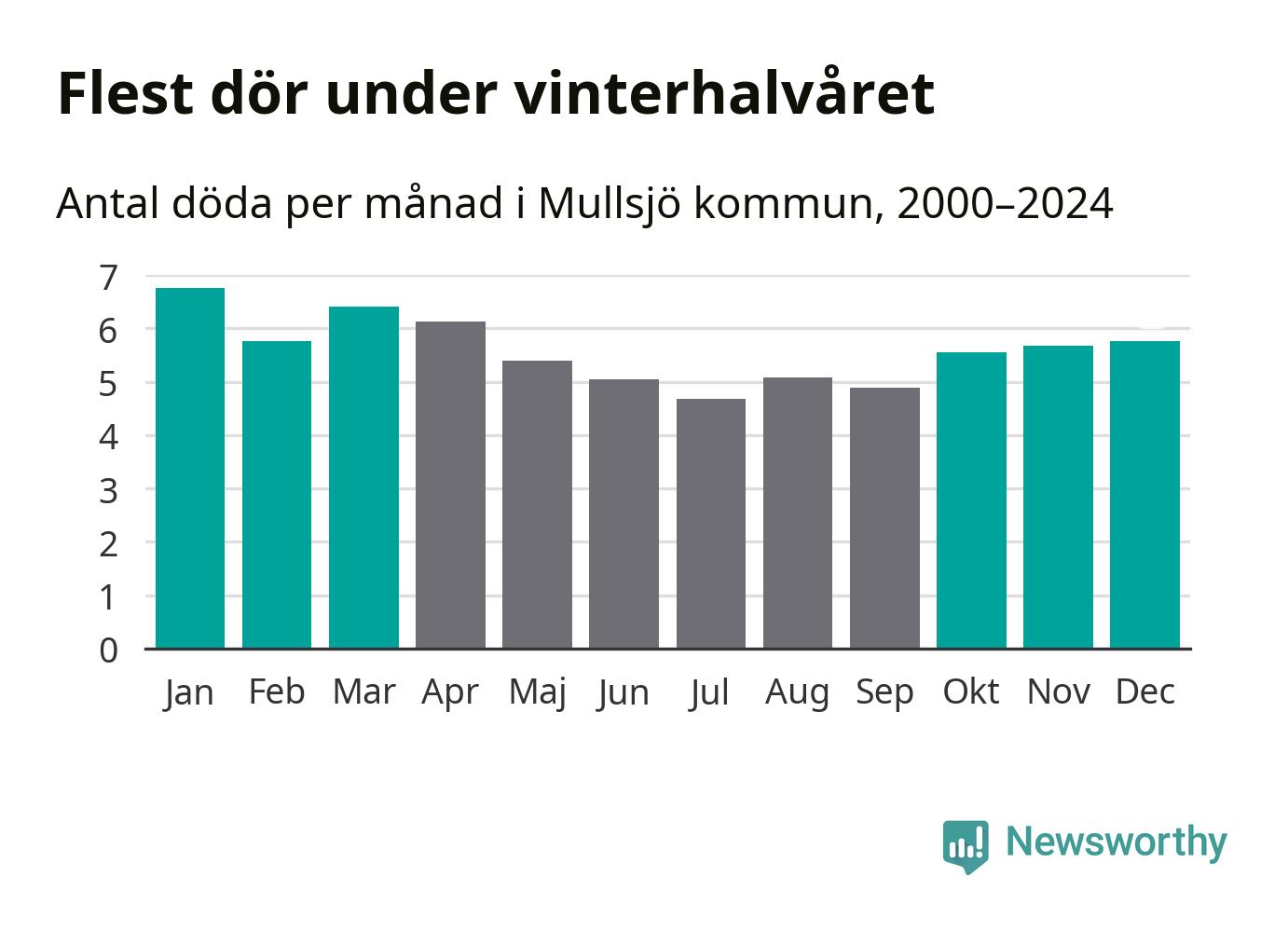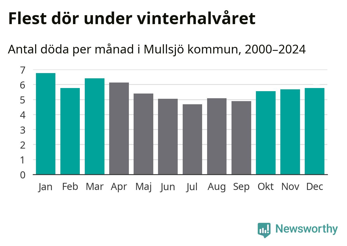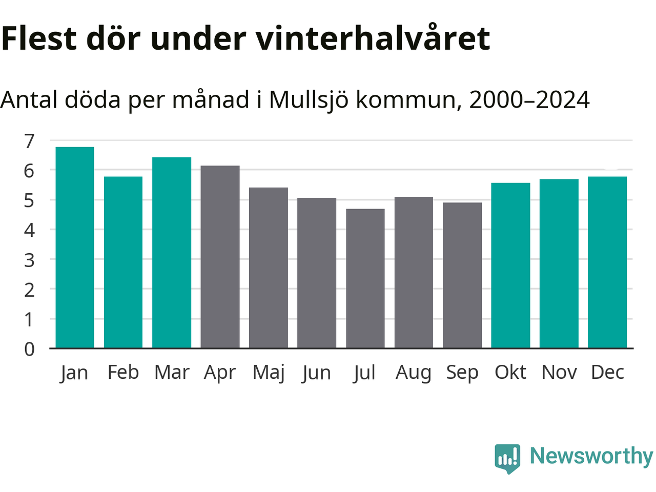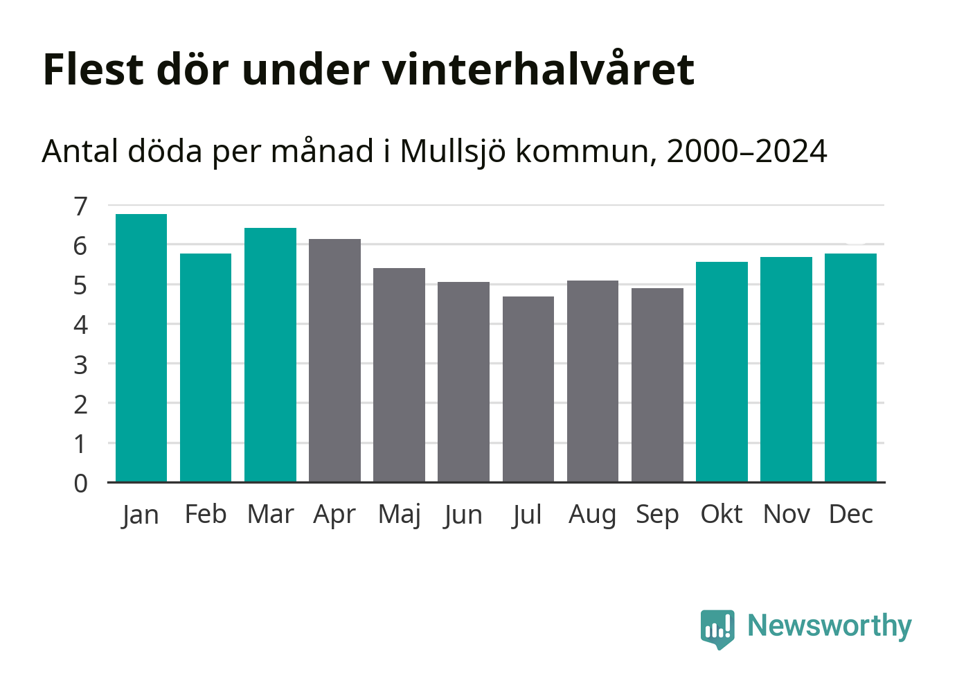 Så är det även i Mullsjö. Under de senaste 25 åren har 895 personer dött i kommunen under vinterhalvåret, jämfört med 768 personer under sommarhalvåret – alltså 17 procent fler.