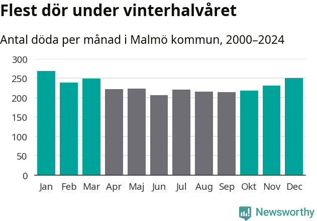 Så är det även i Malmö. Under de senaste 25 åren har 35 372 personer dött i kommunen under vinterhalvåret, jämfört med 31 543 personer under sommarhalvåret – alltså tolv procent fler.