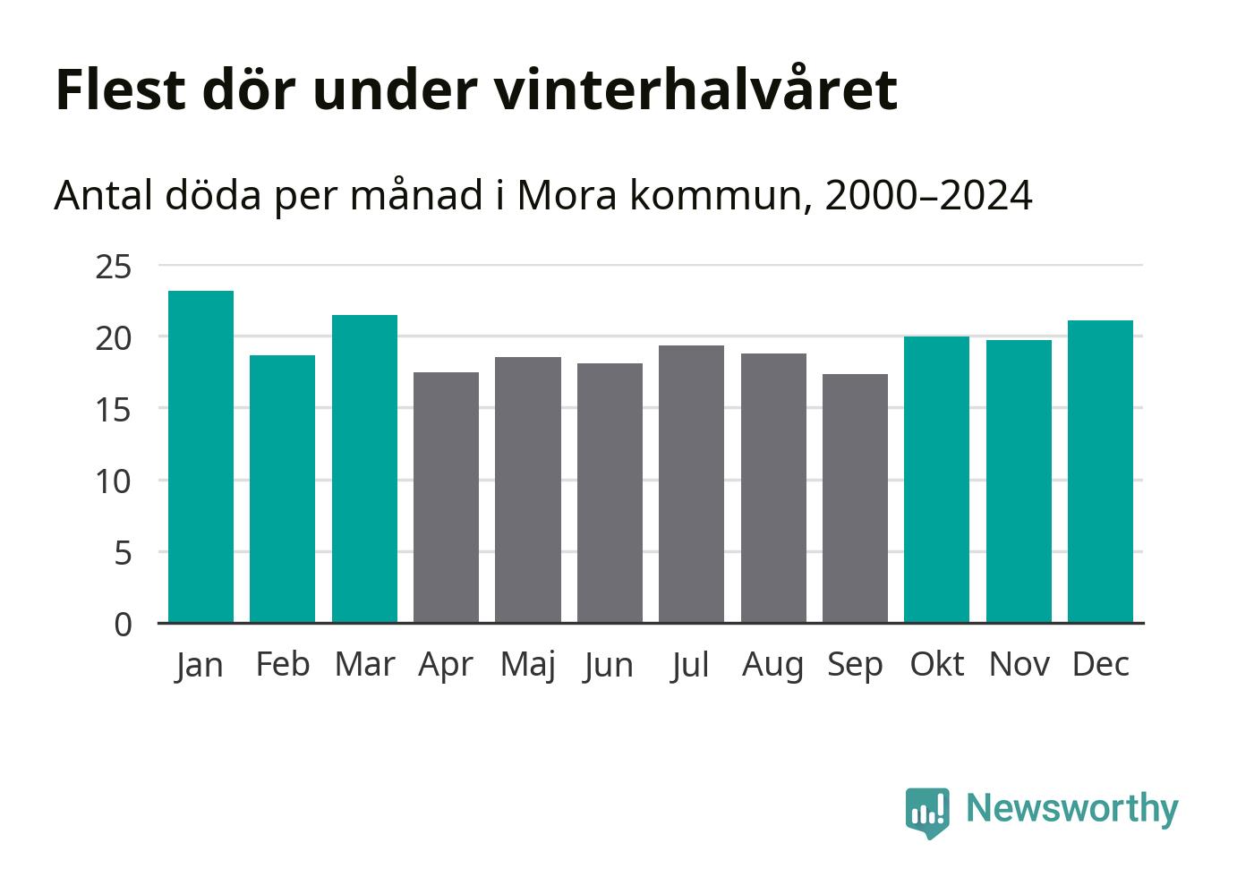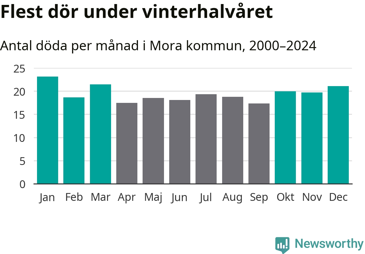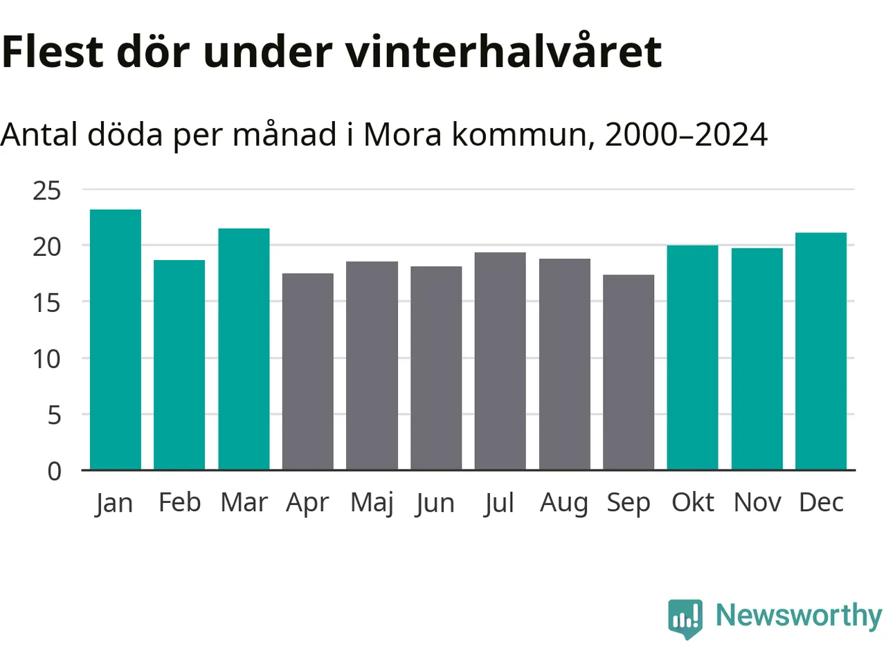 Så är det även i Mora. Under de senaste 25 åren har 3 006 personer dött i kommunen under vinterhalvåret, jämfört med 2 786 personer under sommarhalvåret – alltså åtta procent fler.