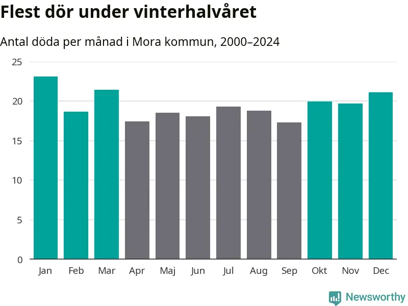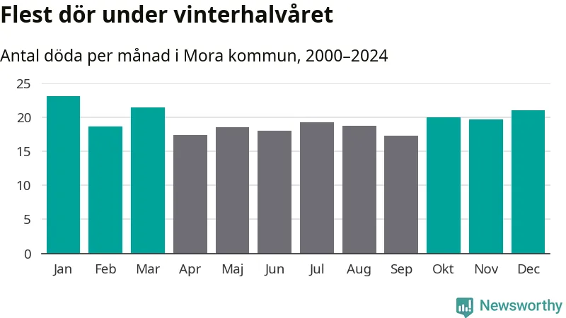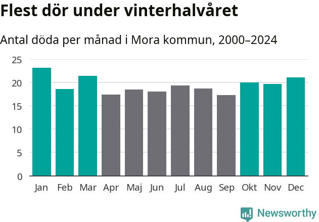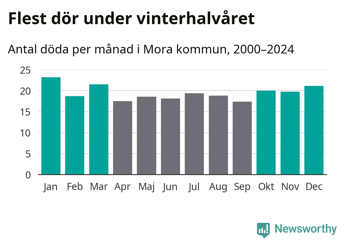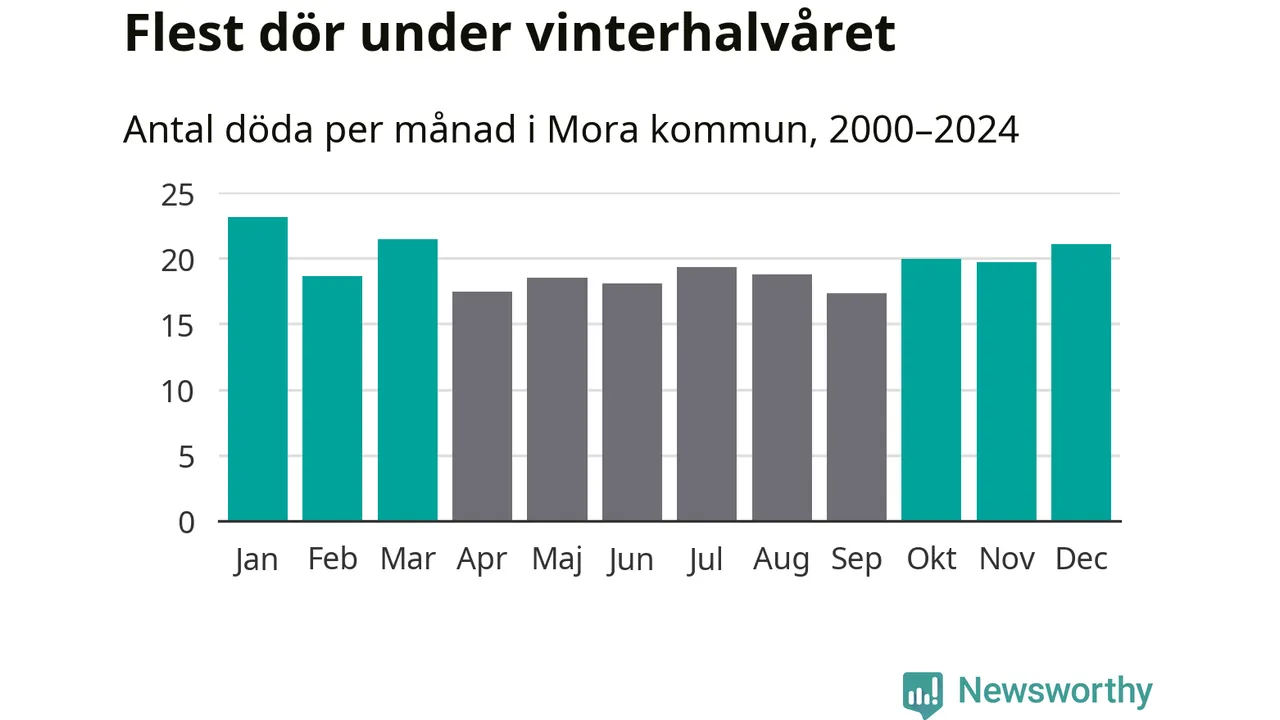 Så är det även i Mora. Under de senaste 25 åren har 3 006 personer dött i kommunen under vinterhalvåret, jämfört med 2 786 personer under sommarhalvåret – alltså åtta procent fler.