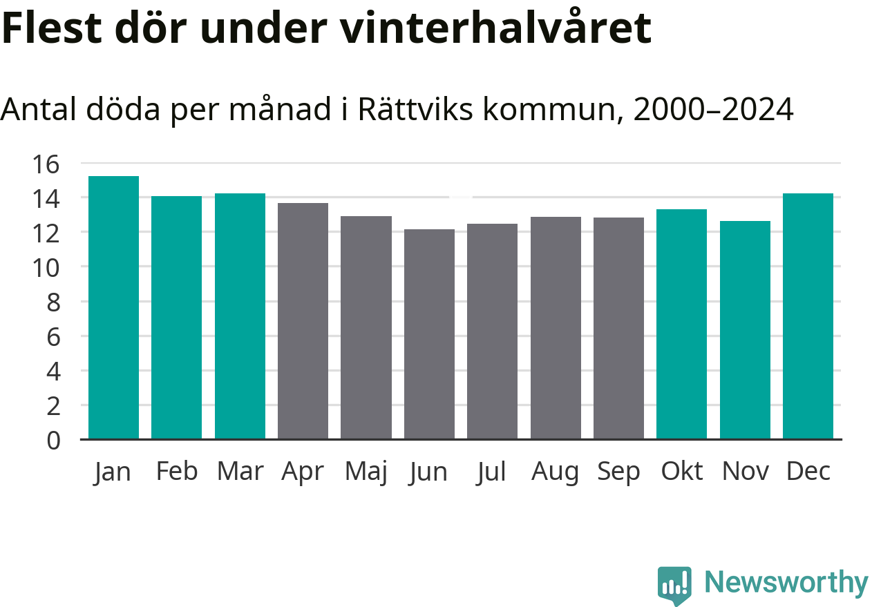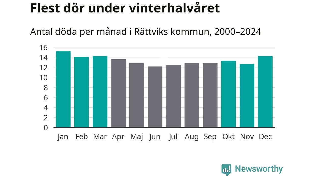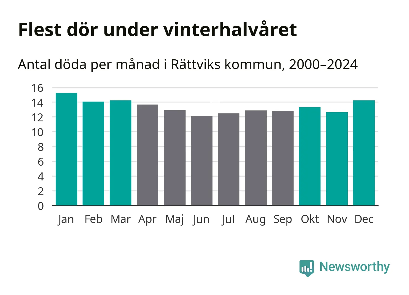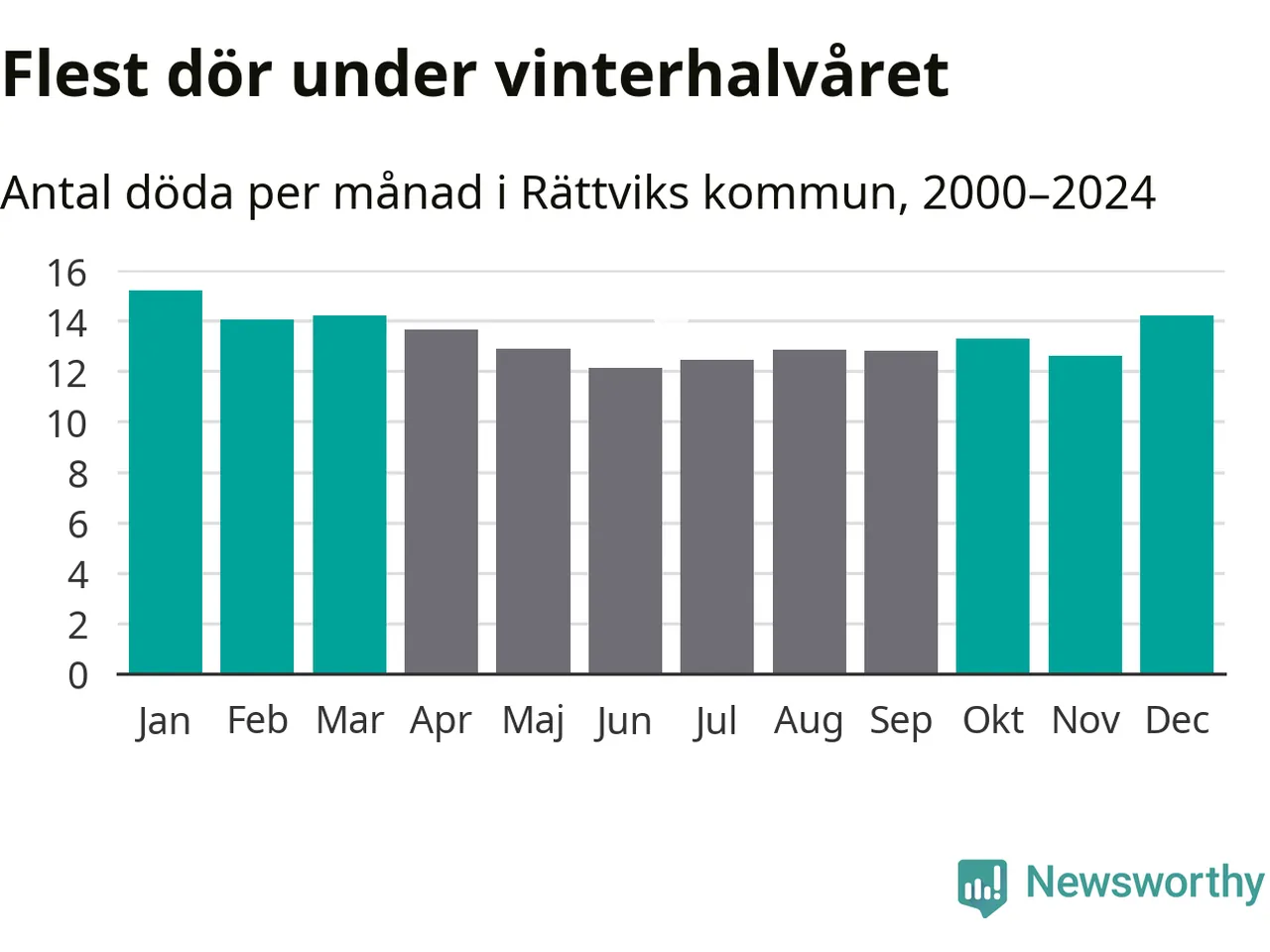 Så är det även i Rättvik. Under de senaste 25 åren har 2 070 personer dött i kommunen under vinterhalvåret, jämfört med 1 895 personer under sommarhalvåret – alltså nio procent fler.
