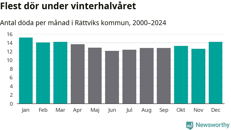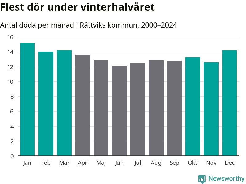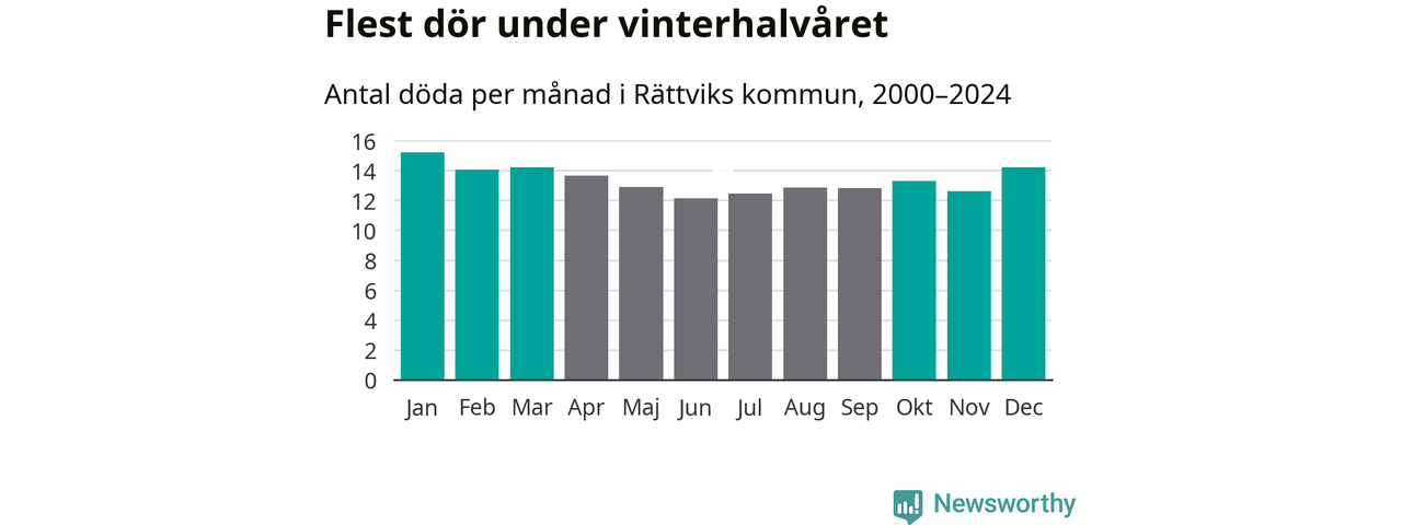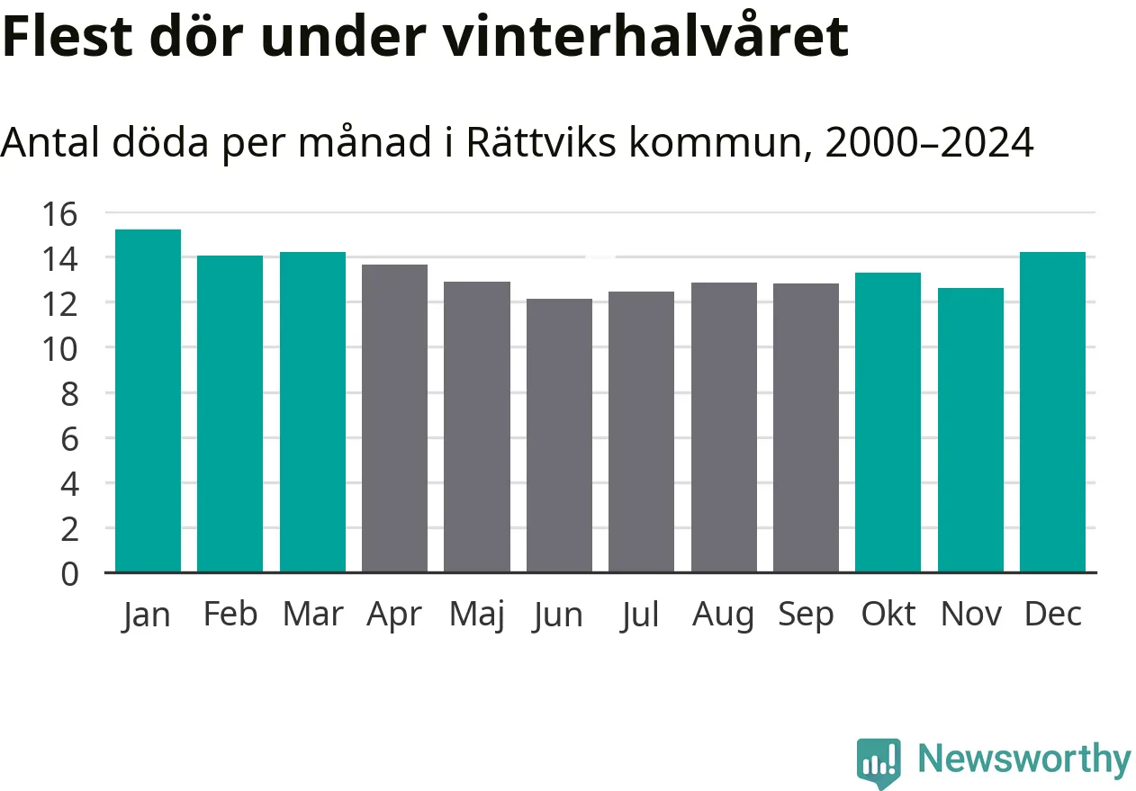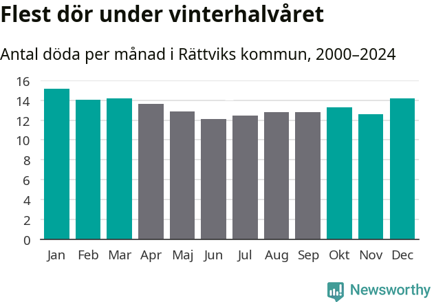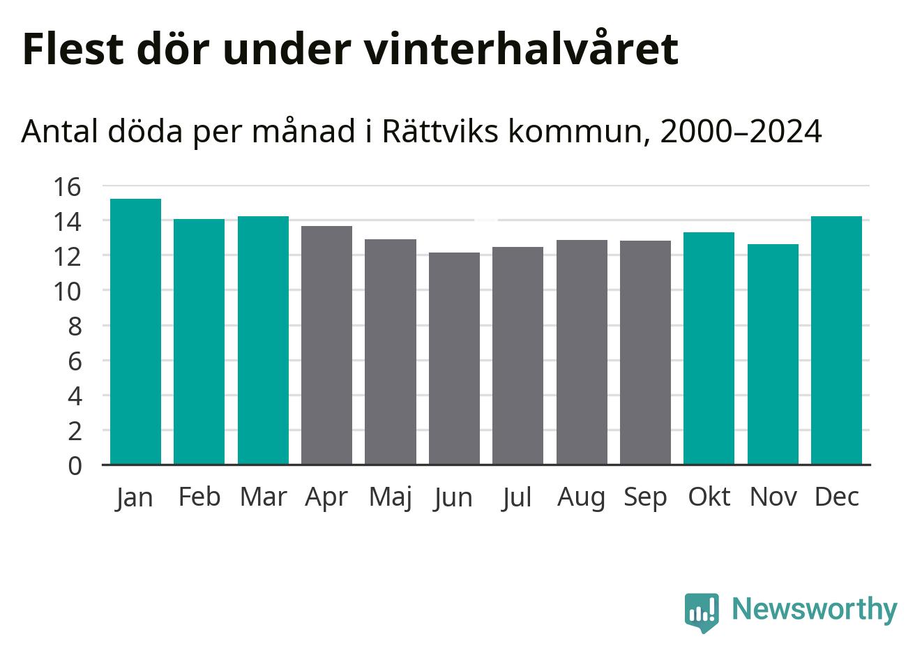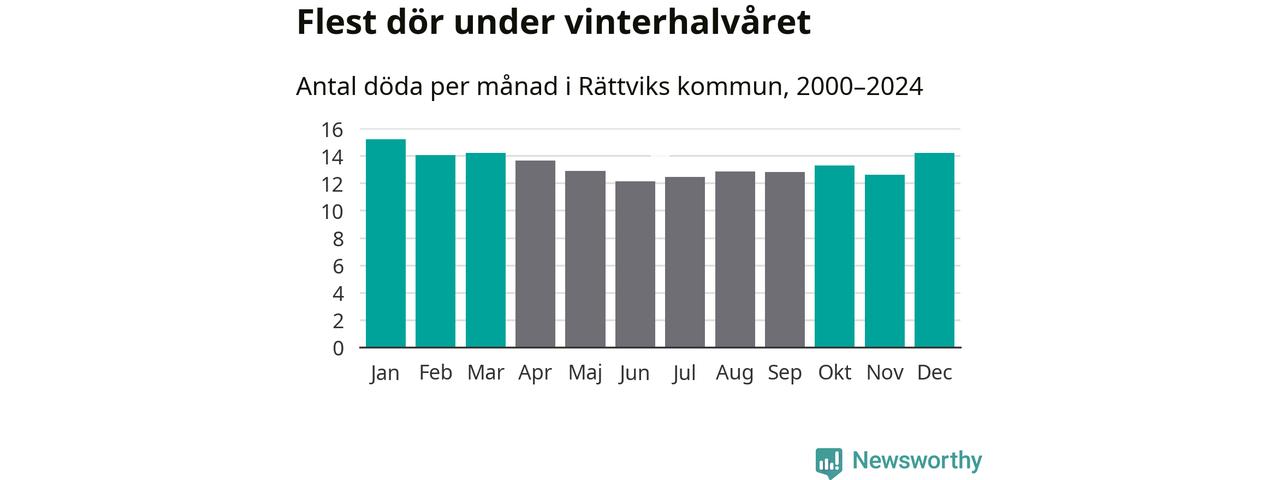 Så är det även i Rättvik. Under de senaste 25 åren har 2 070 personer dött i kommunen under vinterhalvåret, jämfört med 1 895 personer under sommarhalvåret – alltså nio procent fler.