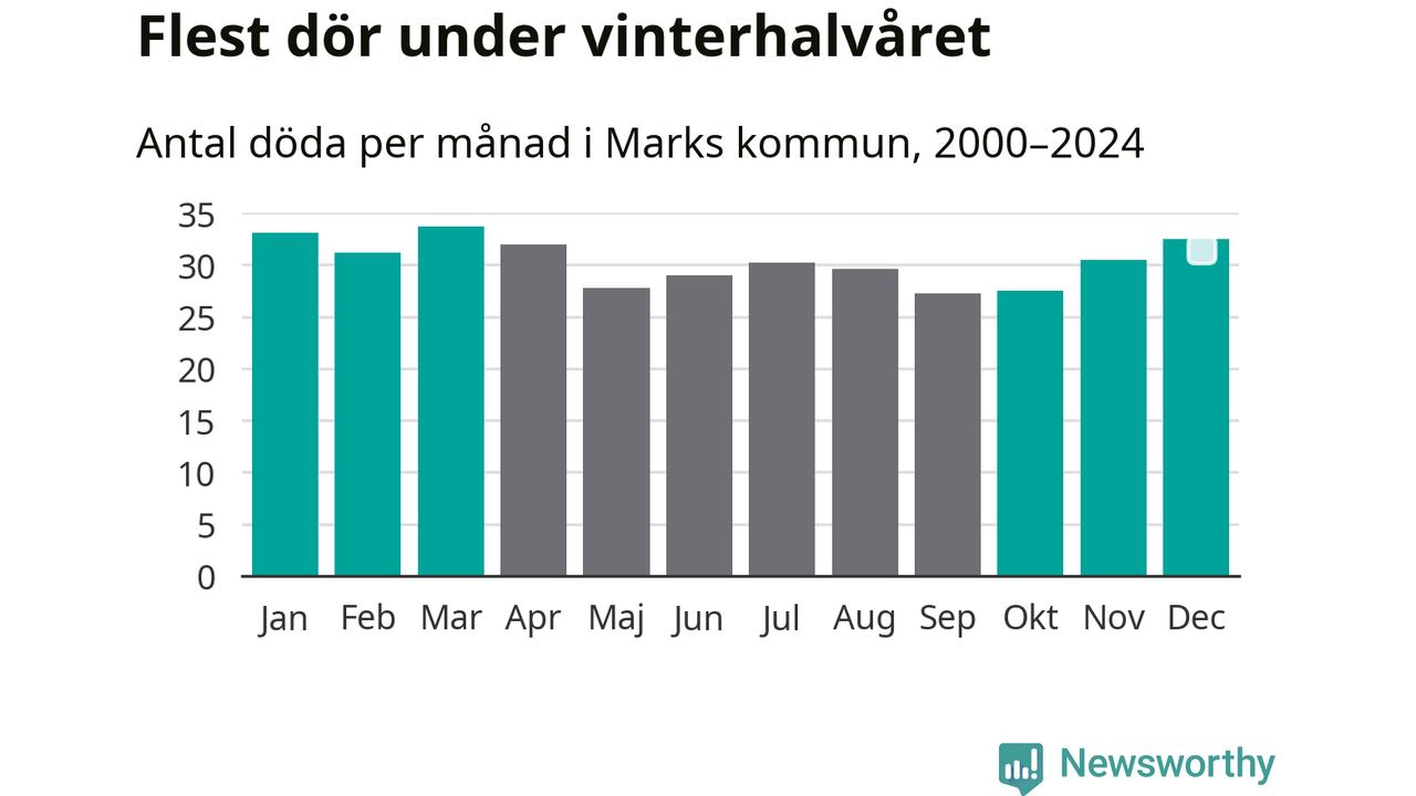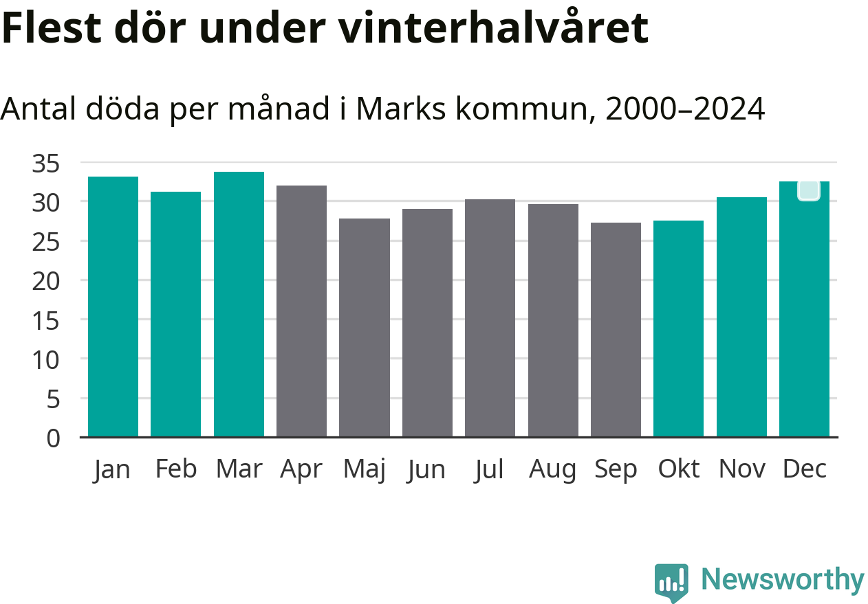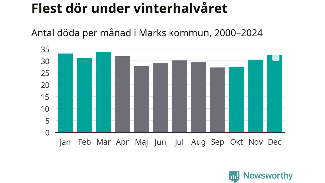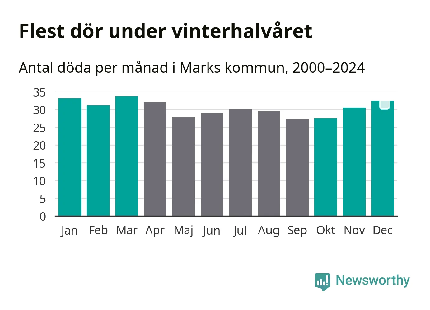 Så är det även i Mark. Under de senaste 25 åren har 4 744 personer dött i kommunen under vinterhalvåret, jämfört med 4 246 personer under sommarhalvåret – alltså tolv procent fler.
