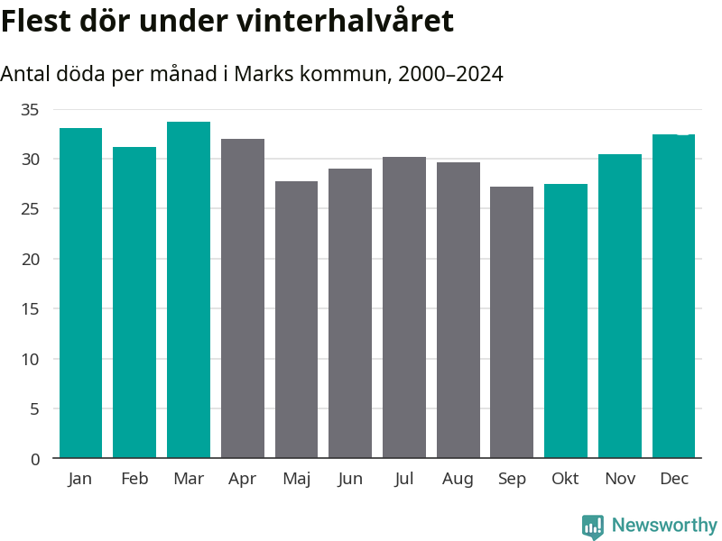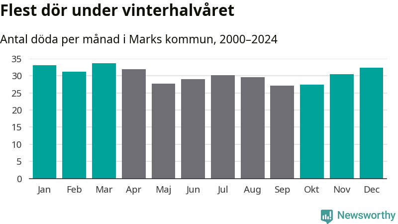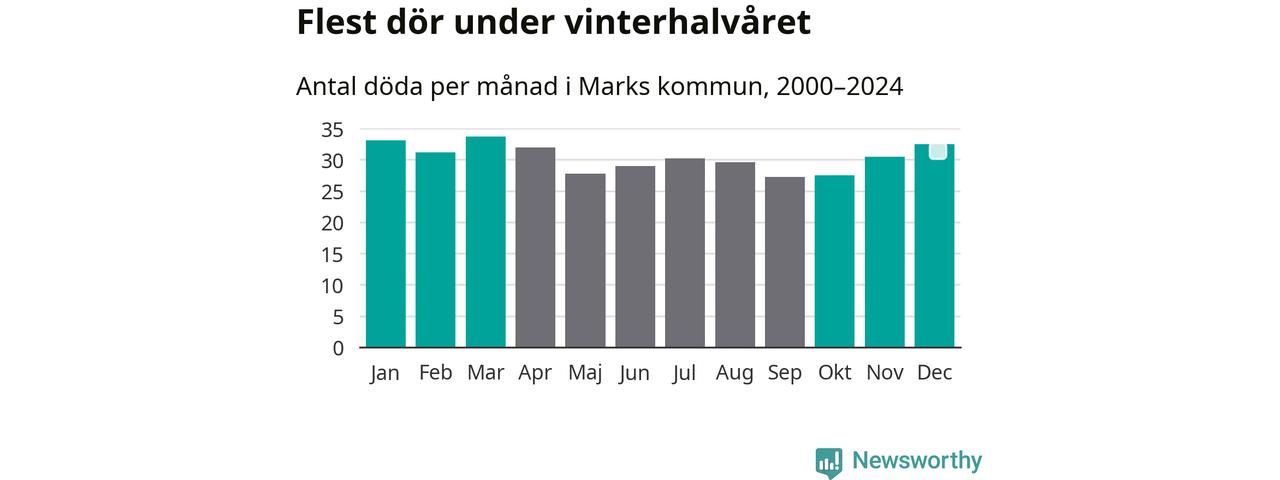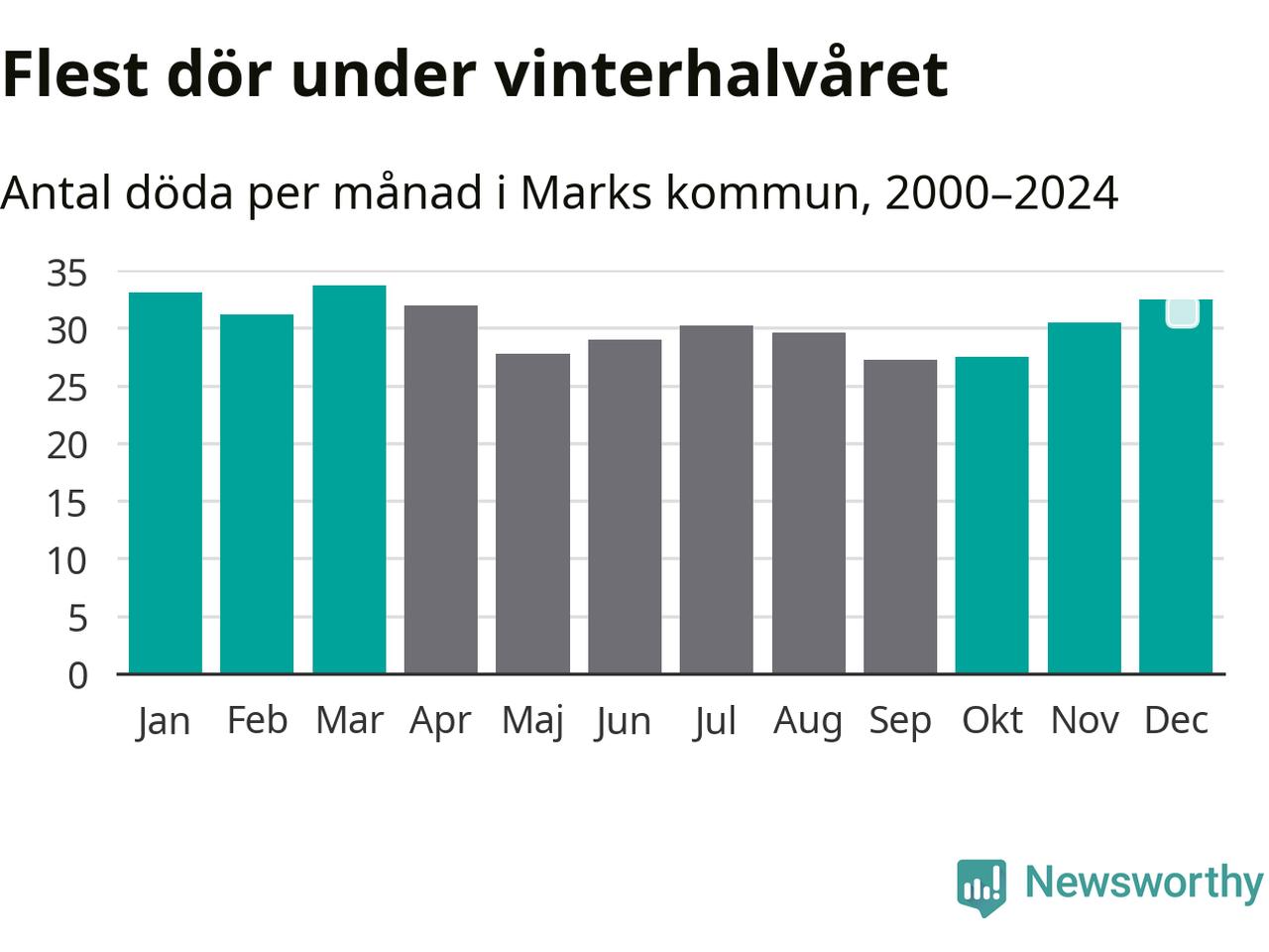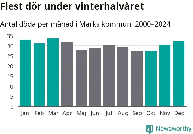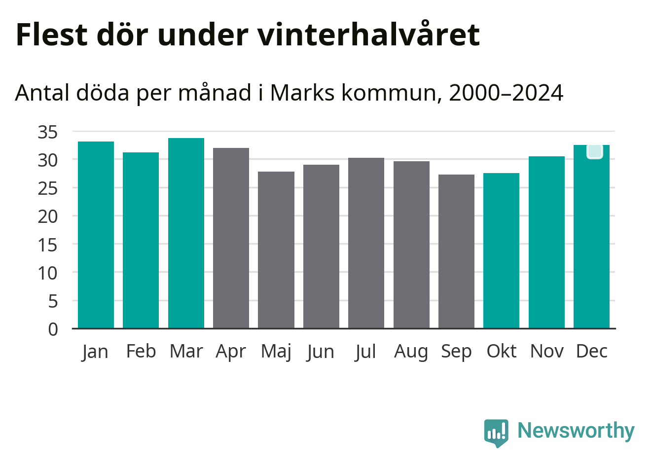 Så är det även i Mark. Under de senaste 25 åren har 4 744 personer dött i kommunen under vinterhalvåret, jämfört med 4 246 personer under sommarhalvåret – alltså tolv procent fler.