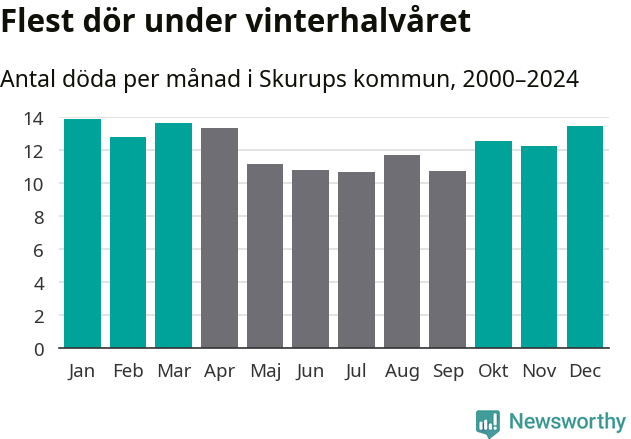 Så är det även i Skurup. Under de senaste 25 åren har 1 952 personer dött i kommunen under vinterhalvåret, jämfört med 1 631 personer under sommarhalvåret – alltså 20 procent fler.